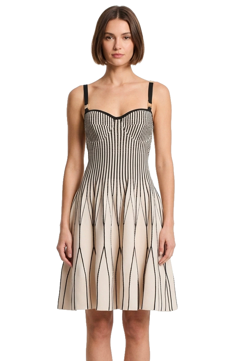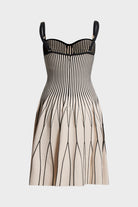 Abito Elisabetta Franchi caratterizzato da una silhouette a bambolina in maglia compatta con raffinato motivo jacquard bicolore. Il design fit-and-flare valorizza il décolleté con uno scollo a bustier, mentre le geometrie grafiche enfatizzano le forme aprendosi in una gonna svasata di grande impatto. Modello sofisticato e iconico ideale per cerimonie e cocktail party della stagione primavera estate.