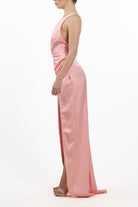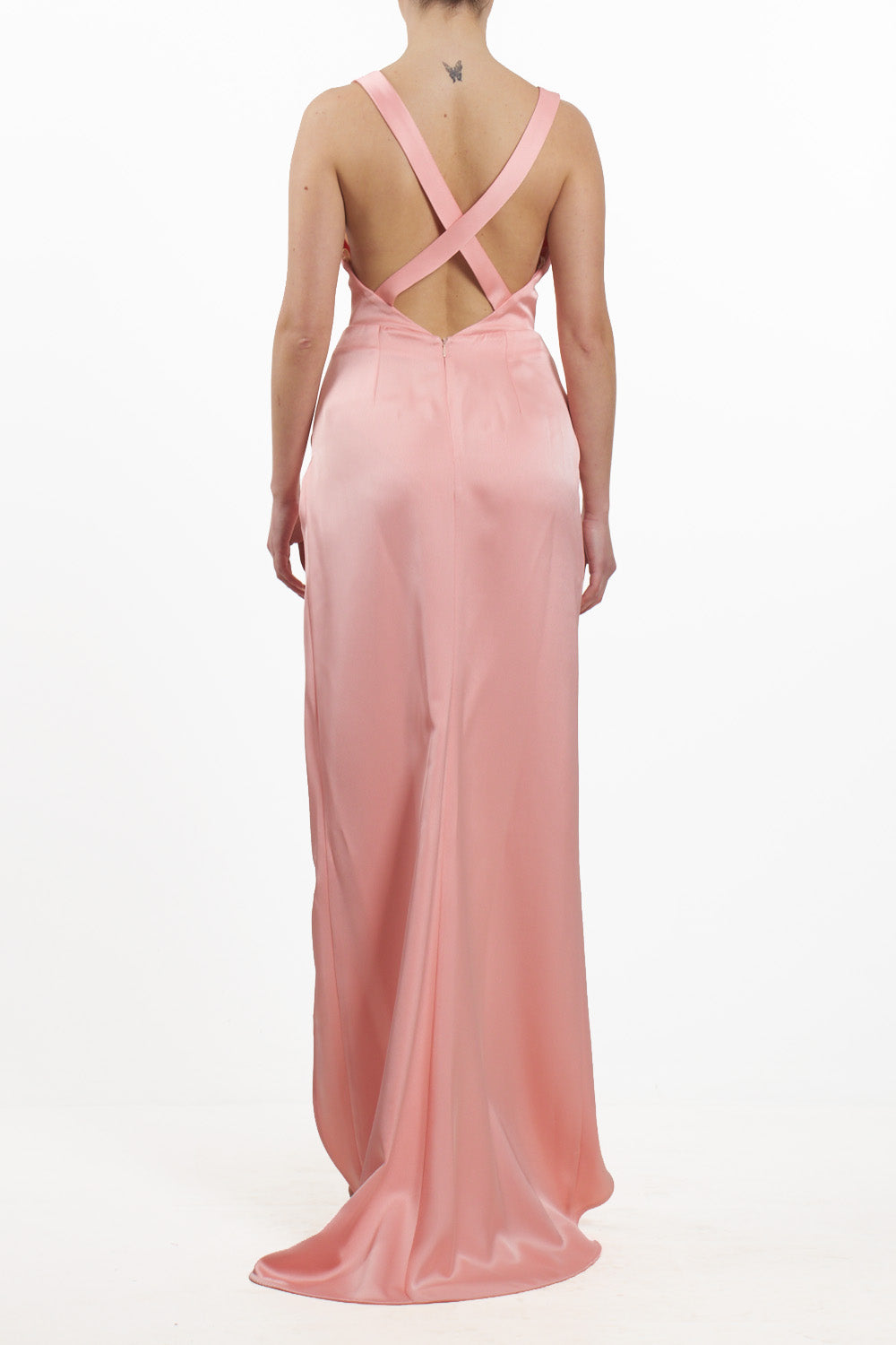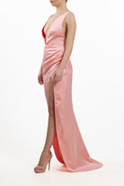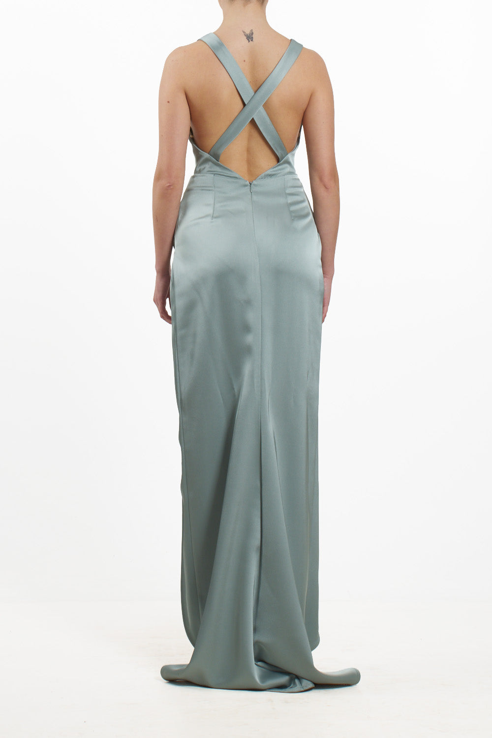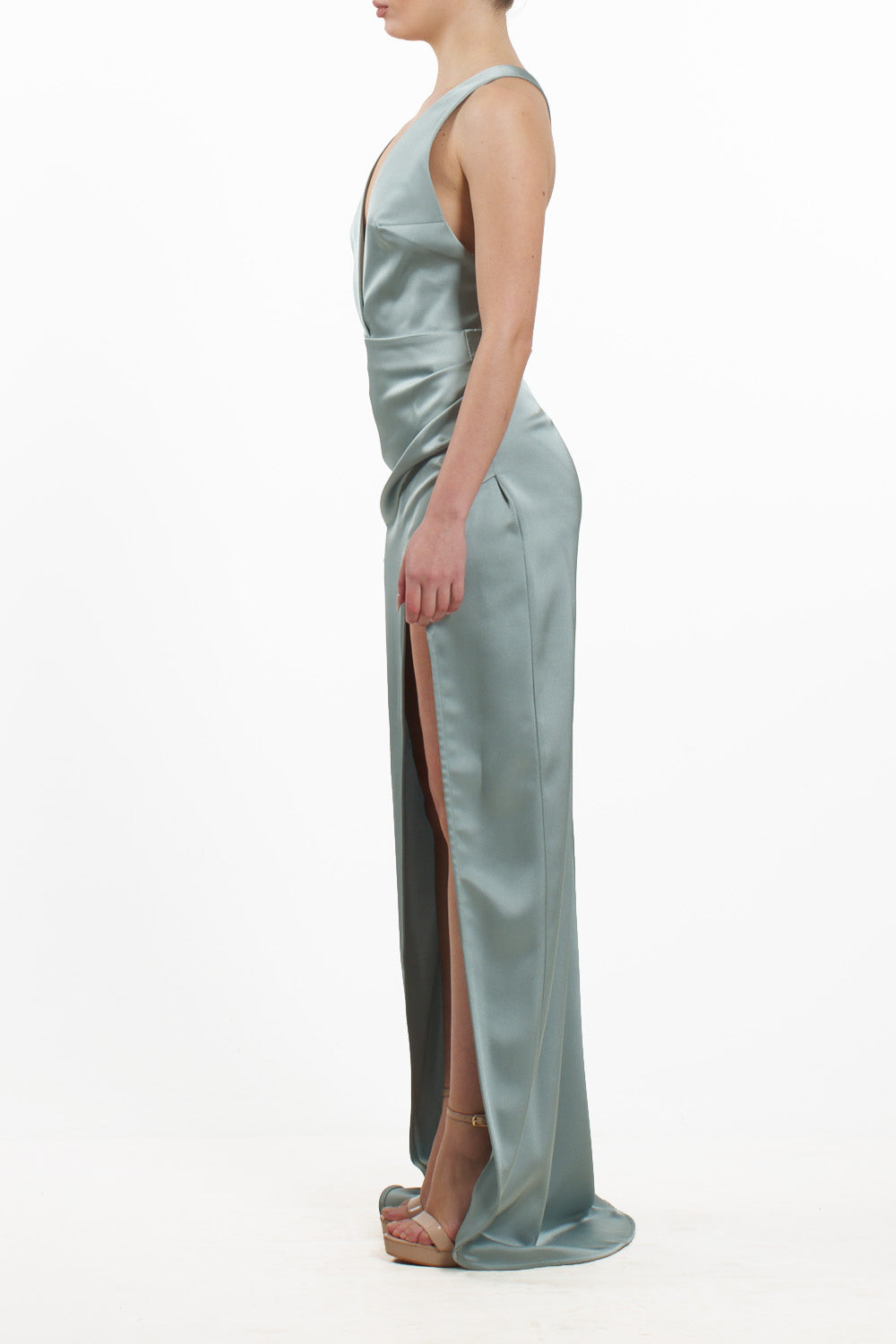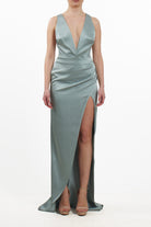 Abito Silence caratterizzato da un'eleganza glamour con una silhouette lunga in satin che scivola morbidamente sui fianchi. Il design è definito da un profondo scollo a V e da un audace spacco laterale che dona movimento e carattere a ogni passo, mentre il delicato drappeggio in vita valorizza il décolleté. Modello sofisticato e sensuale, ideale per cerimonie ed eventi di gala della stagione primavera estate.