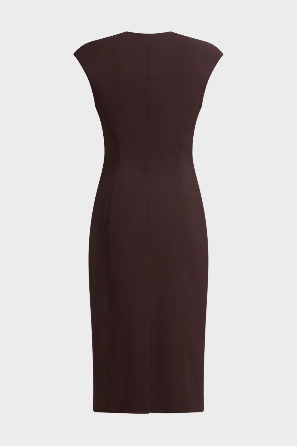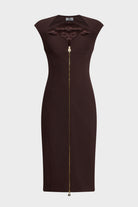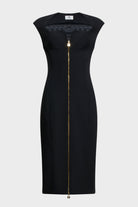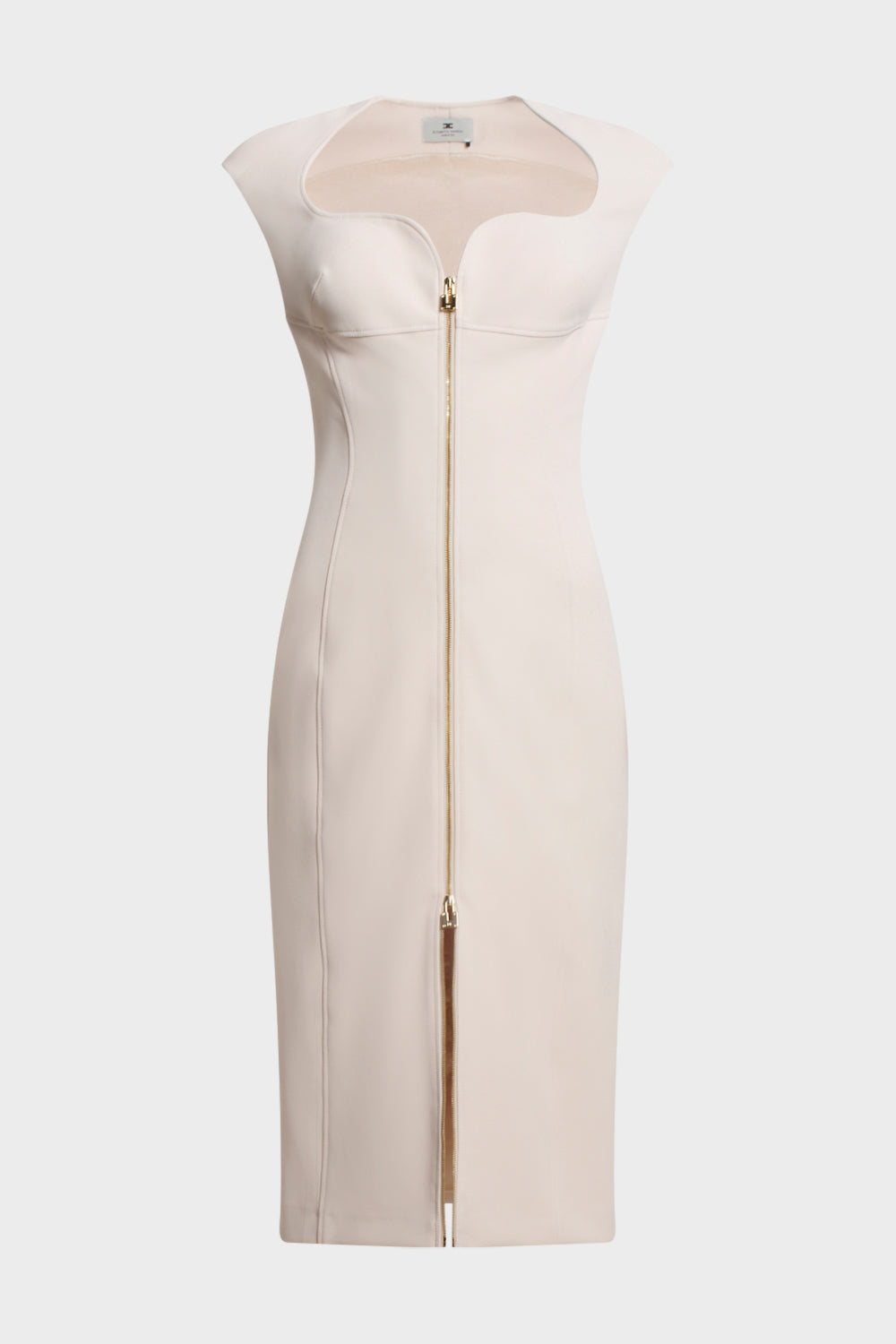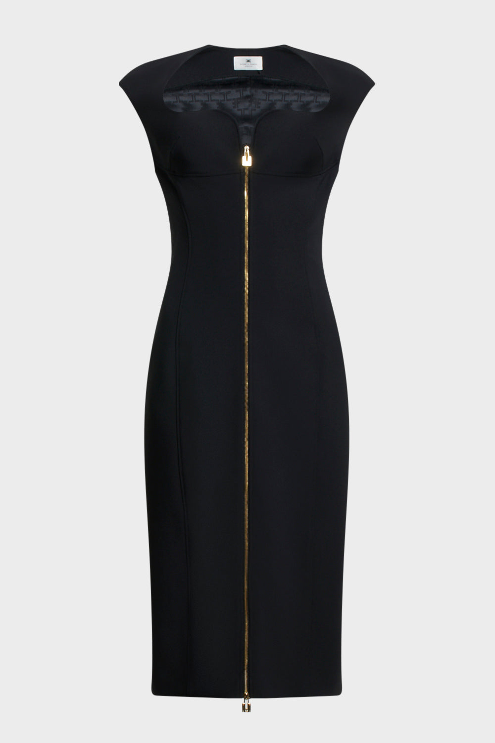 Abito donna Elisabetta Franchi dalla silhouette femminile ed elegante, caratterizzato da linea aderente con zip frontale centrale e profilo scollato sinuoso. Il design senza maniche esalta la figura, mentre le cuciture sagomanti e le impunture verticali assicurano una vestibilità scolpita.