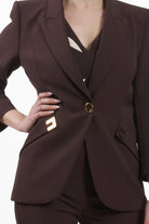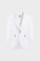 Questa giacca firmata Elisabetta Franchi esprime un'estetica moderna e decisa, perfetta per la donna che ricerca una silhouette impeccabile. Realizzata in doppio crêpe stretch, il capo combina struttura e comfort, adattandosi perfettamente alle linee del corpo. Il design è definito da spalle strutturate e maniche a ¾, mentre i ricercati tagli diagonali sui fianchi ne enfatizzano la costruzione architettonica, rendendolo un pezzo versatile che spazia dal business look più rigoroso agli eventi formali.