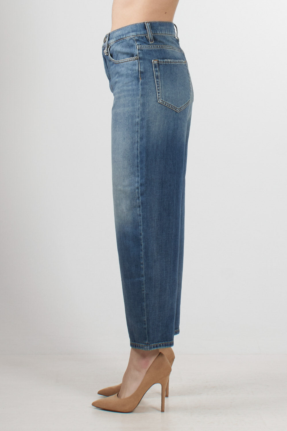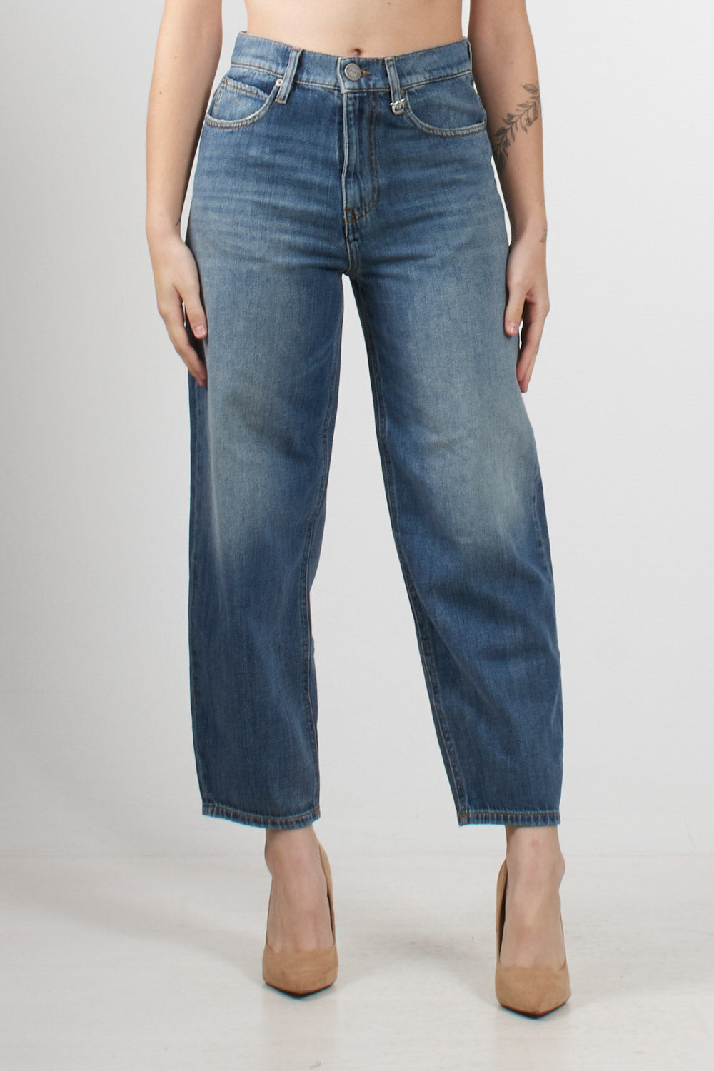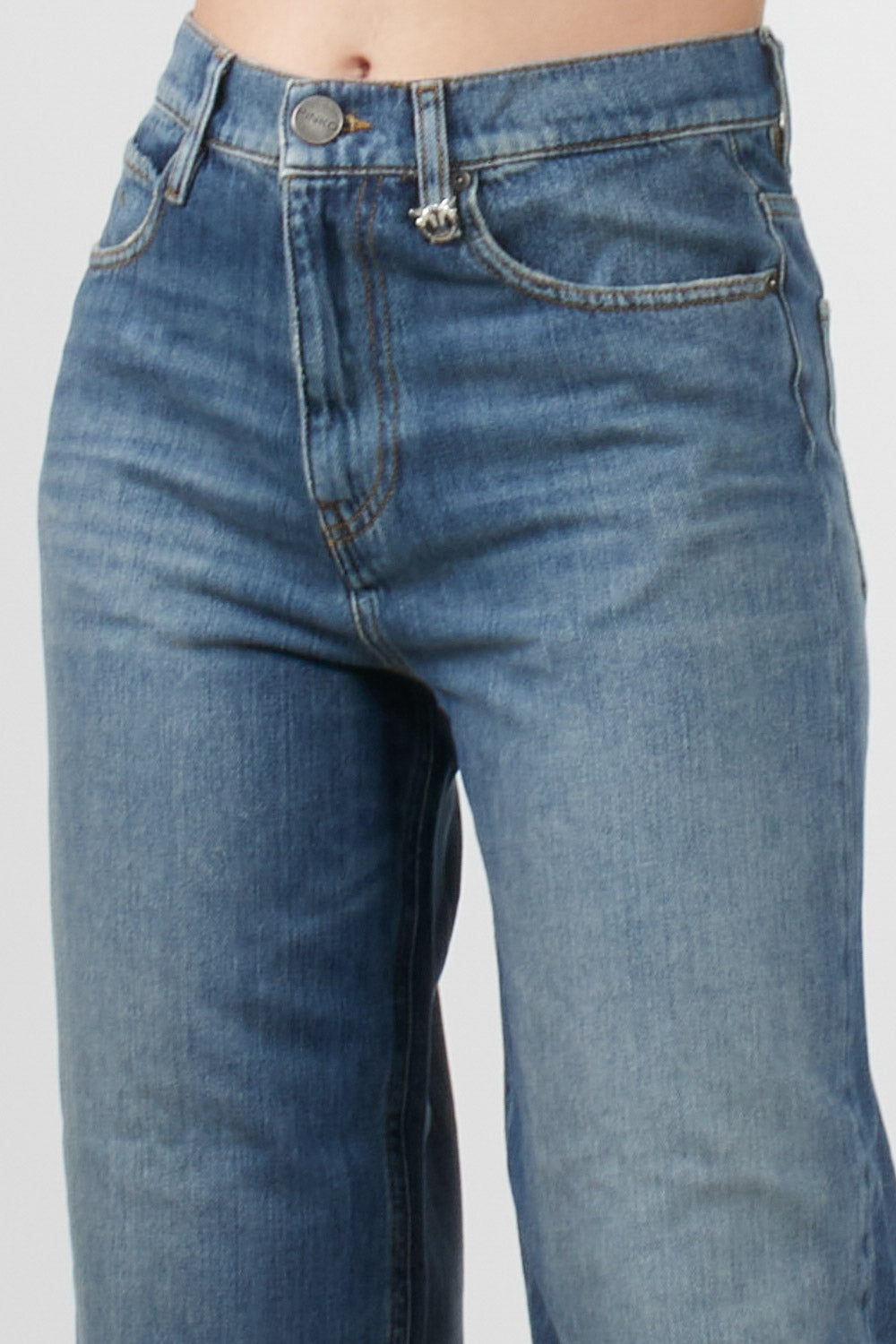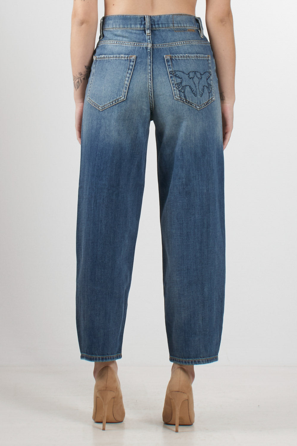 Jeans firmati Pinko con vestibilità balloon-fit, caratterizzati da una gamba arrotondata nella parte superiore e più stretta al fondo. Il design è impreziosito dal logo lettering Pinko ricamato sul retrocinta e dal logo Love Birds sulla tasca posteriore destra.