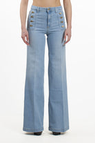 Questi jeans Vicolo fondono un'estetica rétro di ispirazione navy con un taglio flare contemporaneo. Il modello si distingue per la linea a zampa e il dettaglio frontale dei bottoni dorati a contrasto, che sostituiscono le classiche tasche per un look sofisticato e di tendenza. Realizzati in denim dal lavaggio chiaro, valorizzano la silhouette grazie alla vita alta, rendendoli un capo perfetto per look dinamici e femminili.