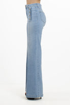 • Dettagli: Lavaggio denim chiaro, bottoni gioiello dorati frontali decorativi, design senza tasche anteriori, fondo a zampa d'elefante