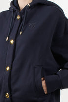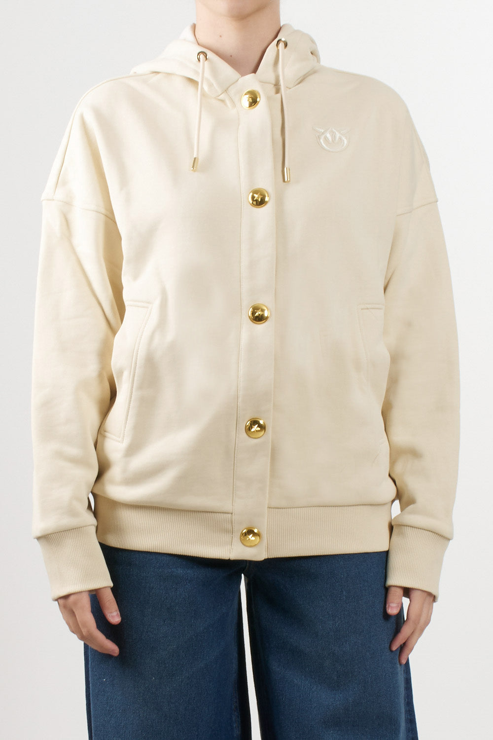 Cardigan con cappuccio dal taglio rilassato di Pinko, bottoni dorati logati ,tasche laterali inserite , fondo e polsini a costine ,logo Pinko tono su tono ricamato sul petto.