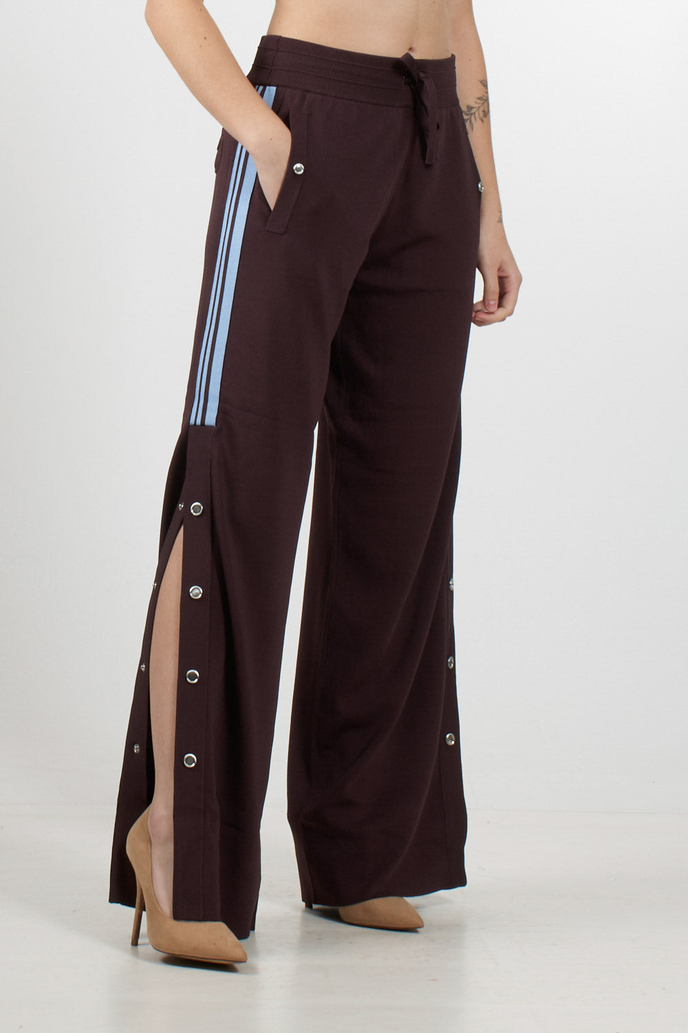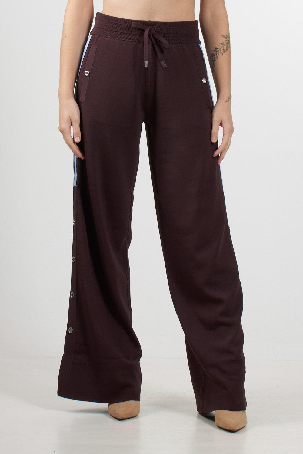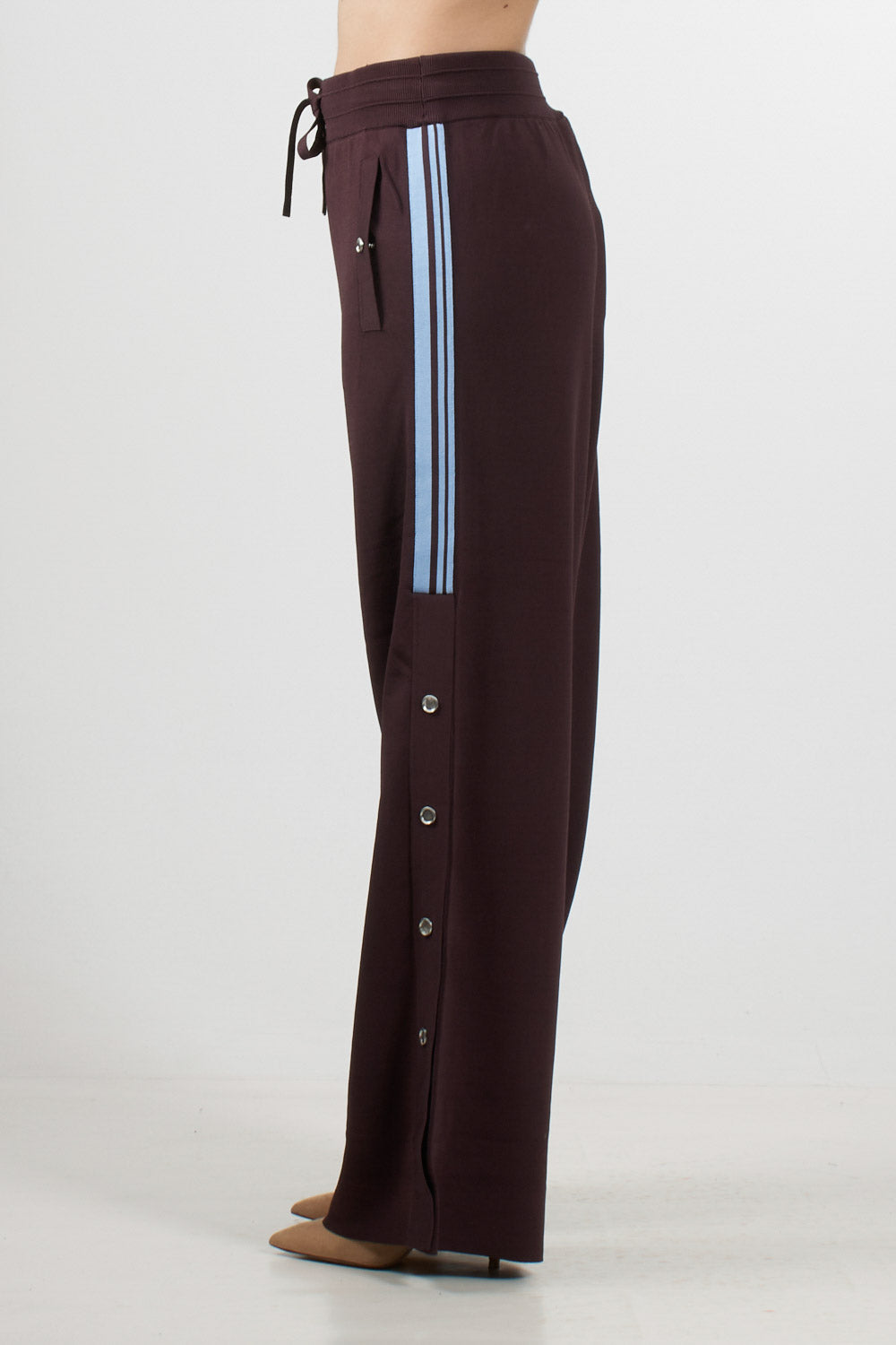 Pantalone donna in stile jogger Pinko con vita elasticata e coulisse regolabile. Il modello presenta gamba ampia con bottoni a pressione lungo i lati e bande a contrasto, che richiamano l ispirazione sporty-chic. Un capo versatile, ideale per look casual e dinamici.