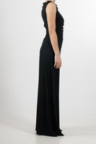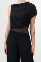 Tuta elegante Jijil  con top drappeggiato monospalla e inserti trasparenti che donano un tocco moderno. Il pantalone palazzo dalla linea fluida slancia la silhouette e rende il capo ideale per occasioni serali e outfit ricercati.