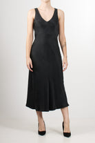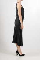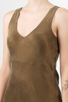 Abito midi smanicatoi in cupro, con scollo a V e linea svasata al fondo. Il taglio scivolato valorizza la figura in modo naturale, mentre la finitura fluida e morbida lo rende perfetto sia per occasioni eleganti che per look più casual
