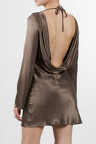 Abito corto Eleh a maniche lunghe realizzato in tessuto satinato con effetto lucido. Il davanti presenta una linea essenziale con scollo rotondo, mentre la parte posteriore è caratterizzata da una profonda scollatura con drappeggio e laccio da annodare al collo.