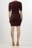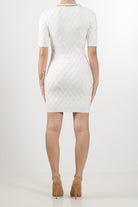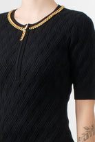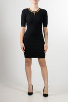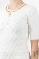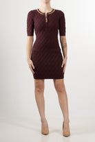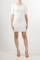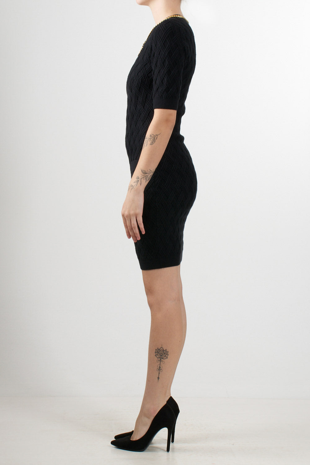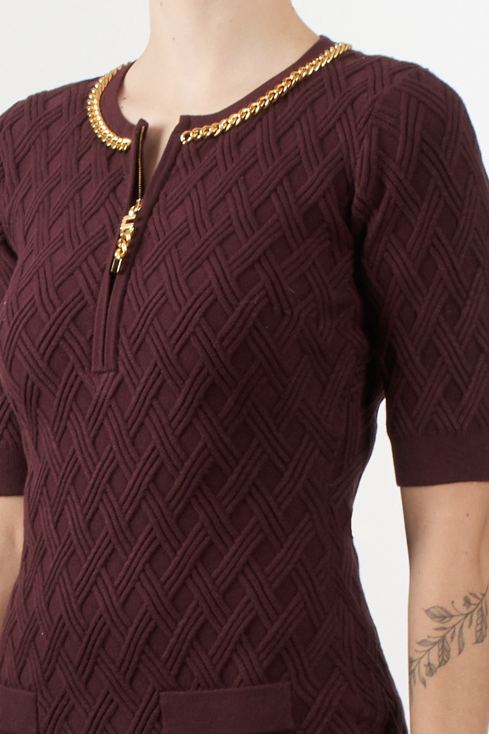 Mini abito in maglia dalla vestibilità aderente, caratterizzato da una raffinata lavorazione tridimensionale che disegna un motivo geometrico a rombi su tutta la lunghezza. Maniche sopra al gomito, girocollo impreziosito da una catena groumette dorata e scollo con zip arricchita da tirazip gioiello logato.