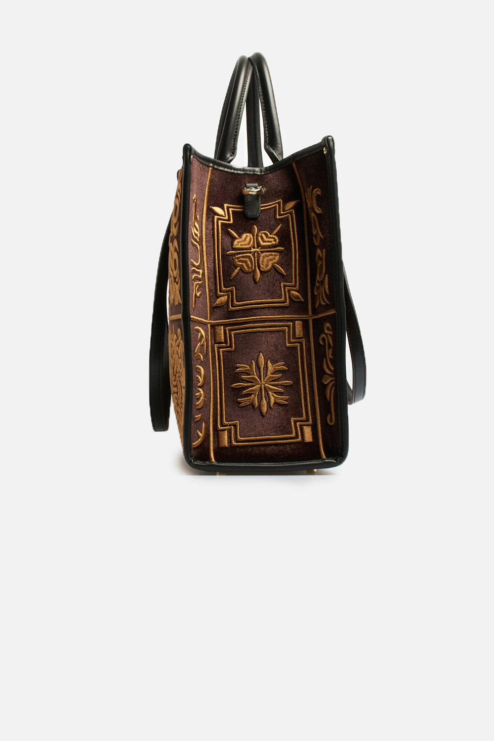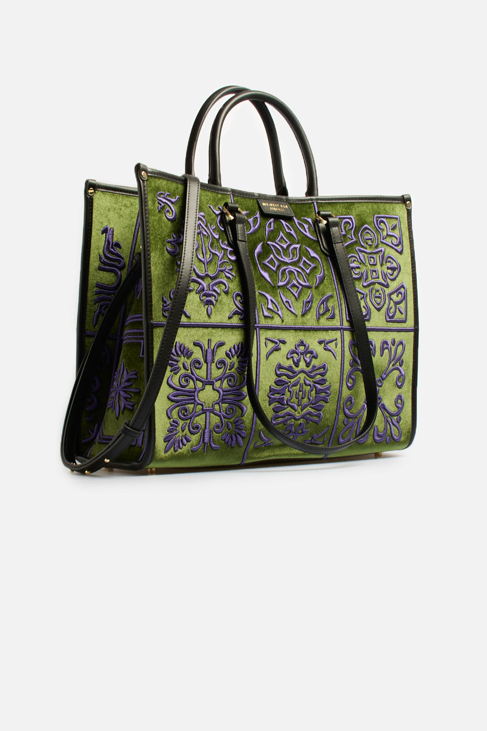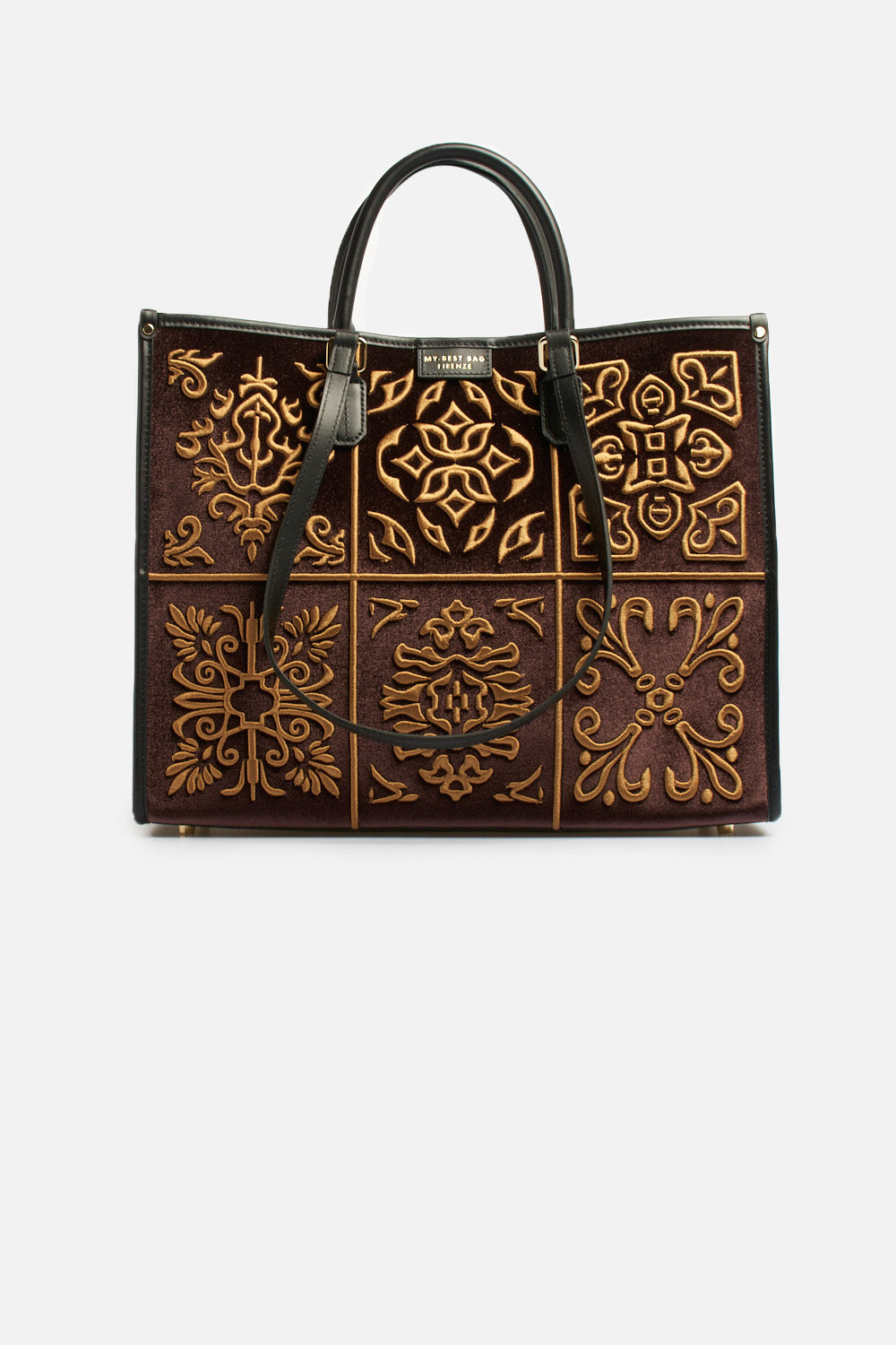La borsa Atena Lisbona Velvet firmata My Best Bag Firenze è una shopper raffinata ed elegante, perfetta per chi desidera un accessorio distintivo con forte personalità. Realizzata in velluto ricamato a motivi geometrici e floreali, presenta manici in pelle liscia e tracolla regolabile. Internamente è dotata di una pratica pochette removibile con zip. La struttura rigida e il design iconico la rendono adatta a occasioni sia formali che quotidiane, mantenendo sempre uno stile ricercato