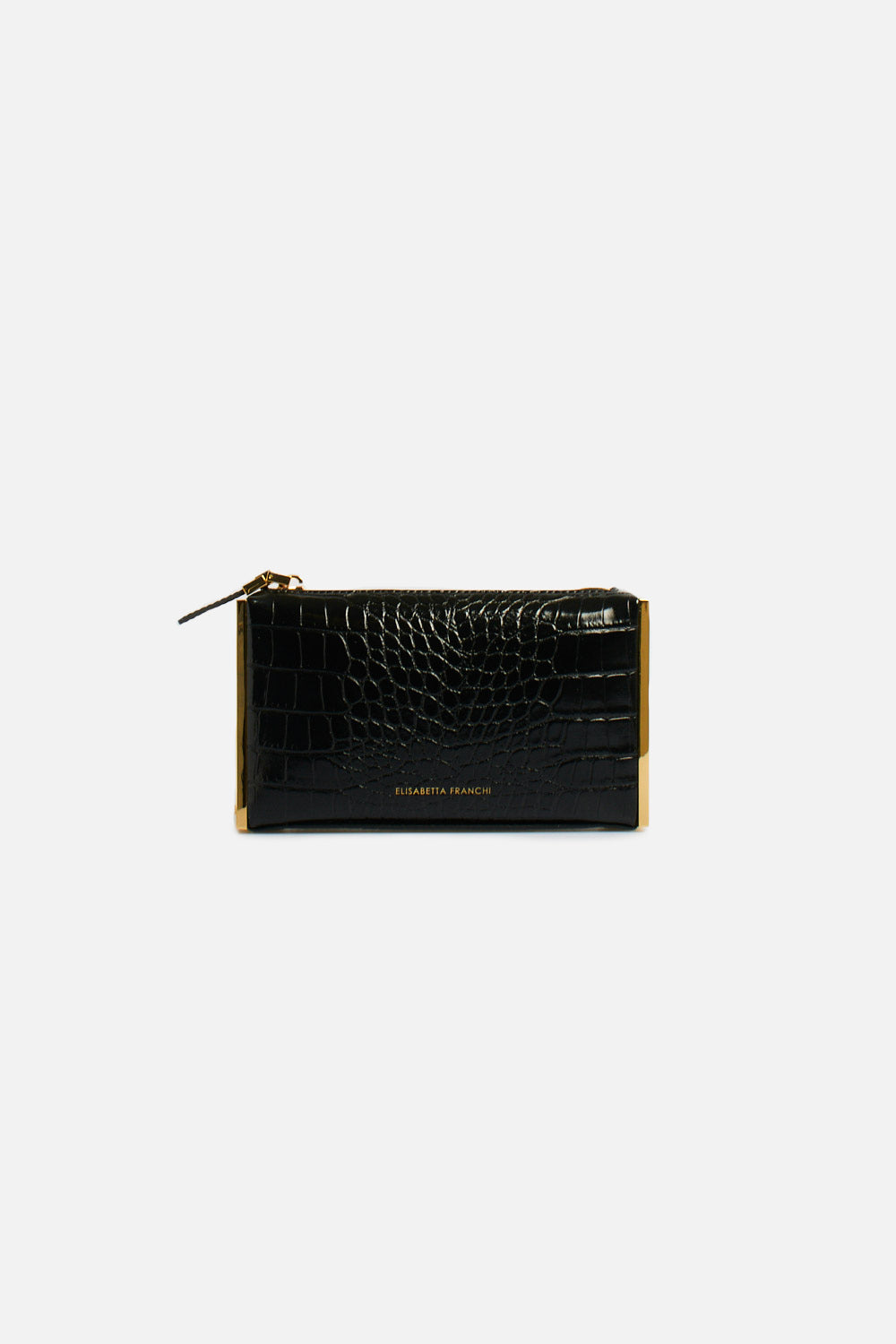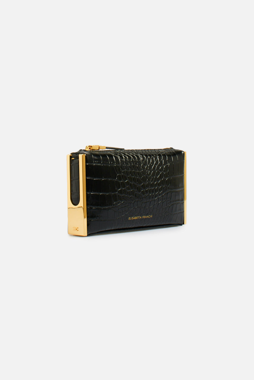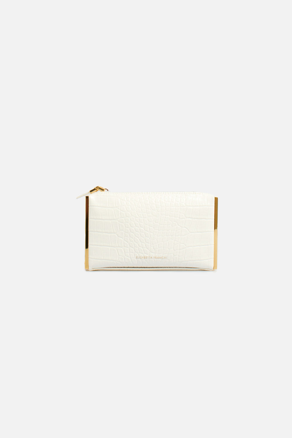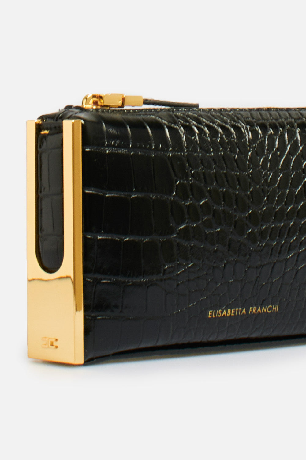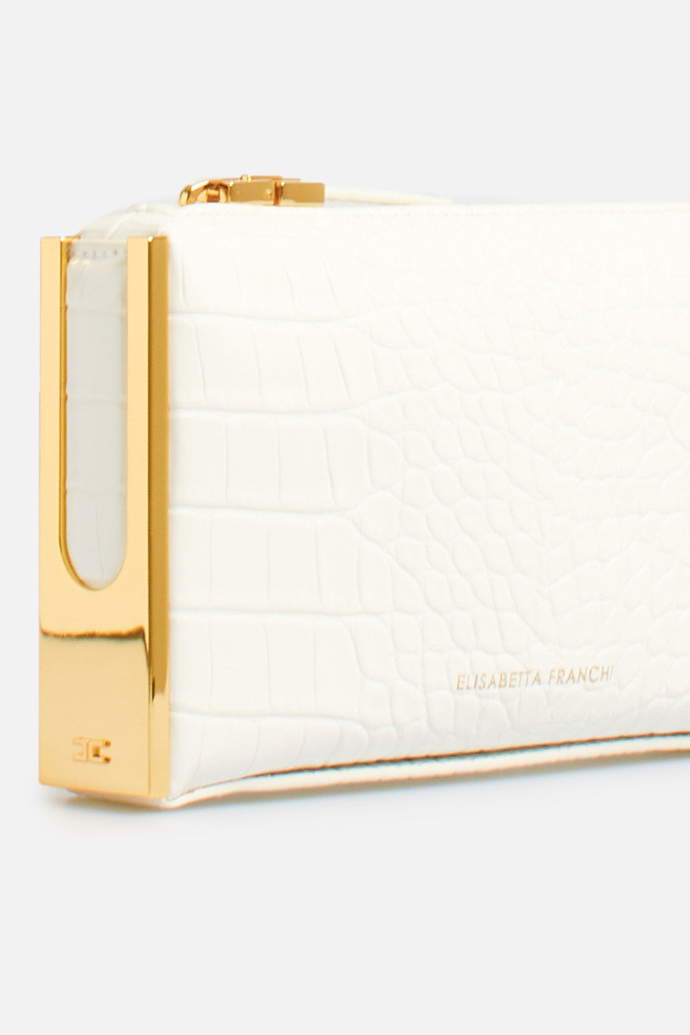 Borsa clutch di Elisabetta Franchi realizzata in materiale sintetico effetto pelle, texture con stampa cocco, placche laterali in metallo dorato con logo, Chiusura con zip.