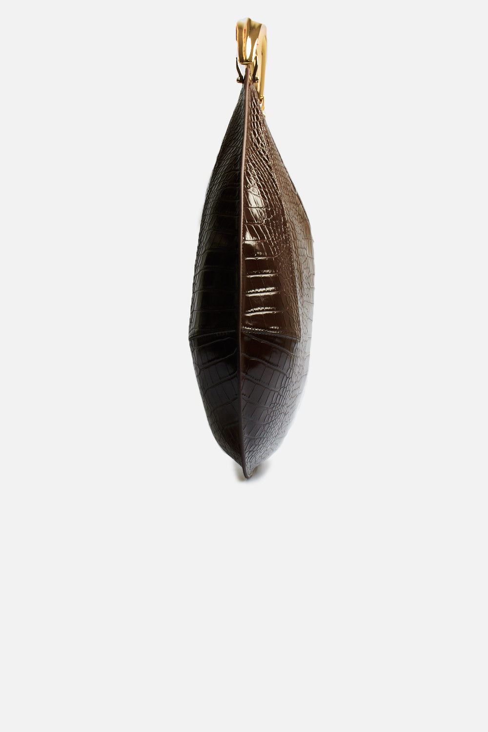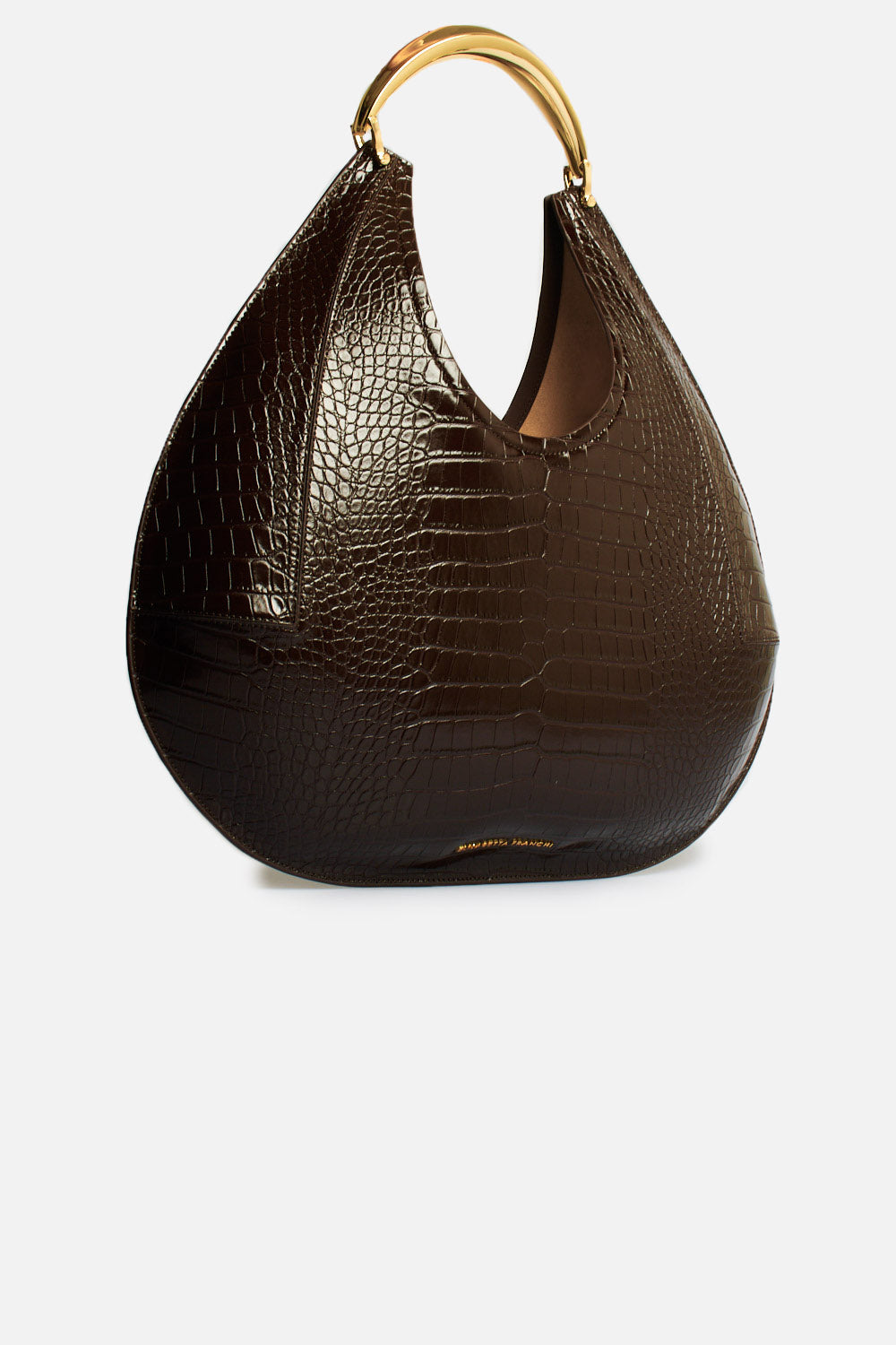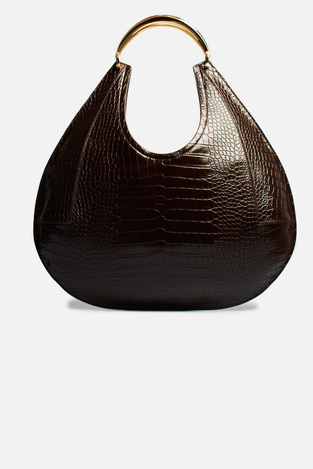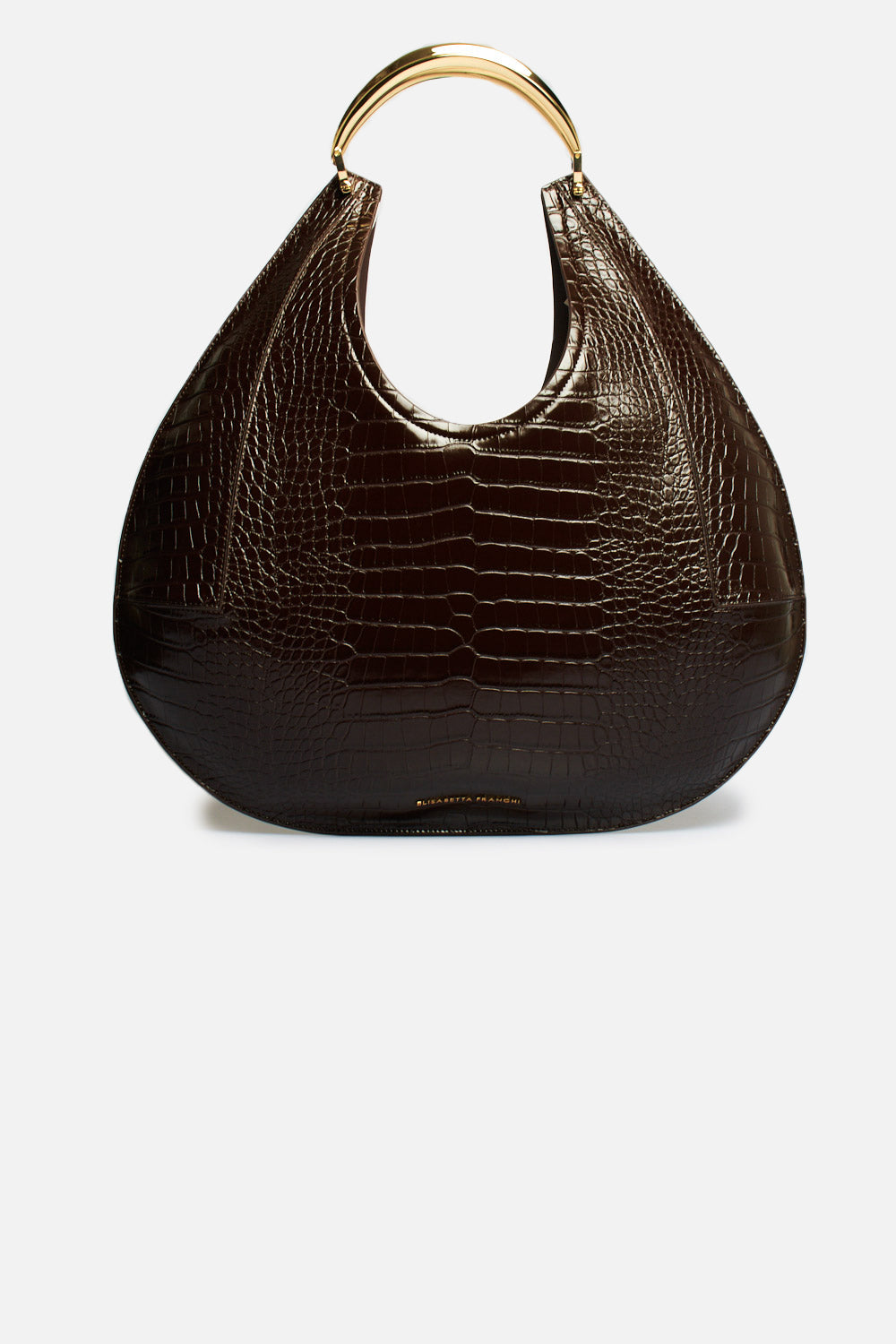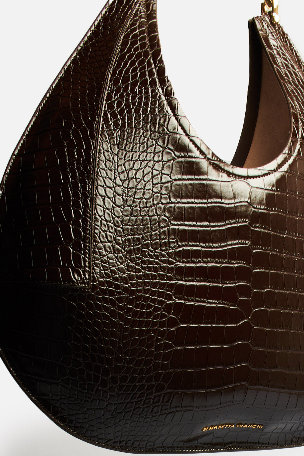 Borsa hobo grande firmata Elisabetta Franchi, realizzata in materiale sintetico effetto pelle, caratterizzata da una pregiata texture con stampa cocco, impreziosita da un manico gioiello in metallo dorato che aggiunge un tocco di eleganza e luminosità al design. Logo iconico posizionato nella parte inferiore e i dettagli curati che ne esaltano la raffinatezza.