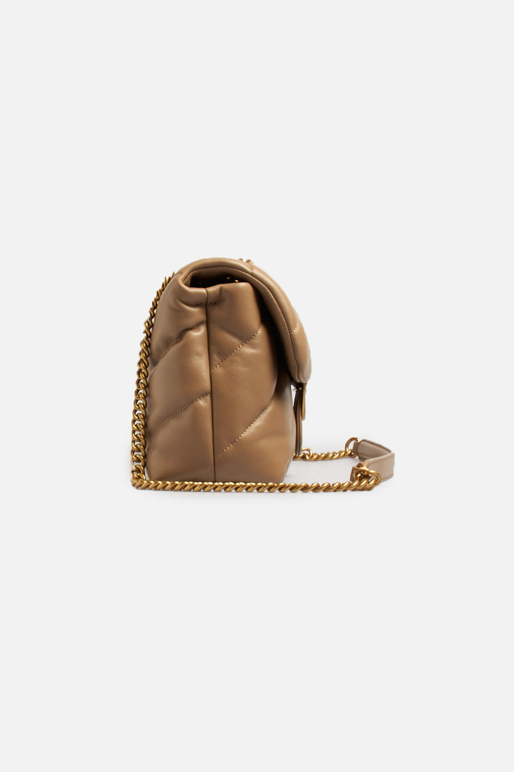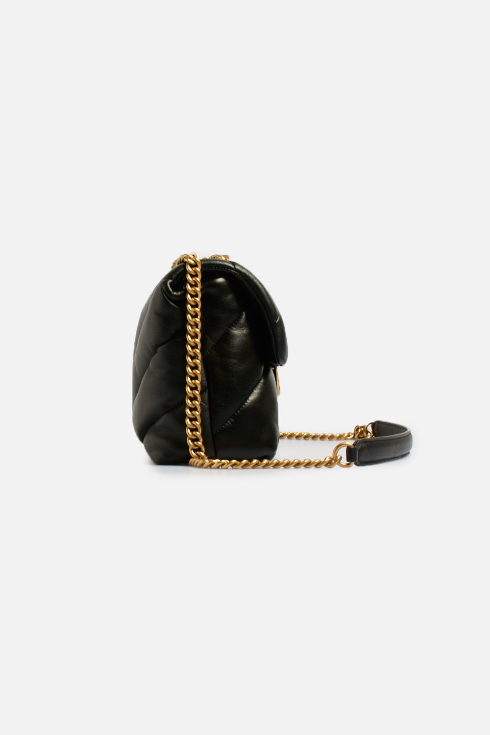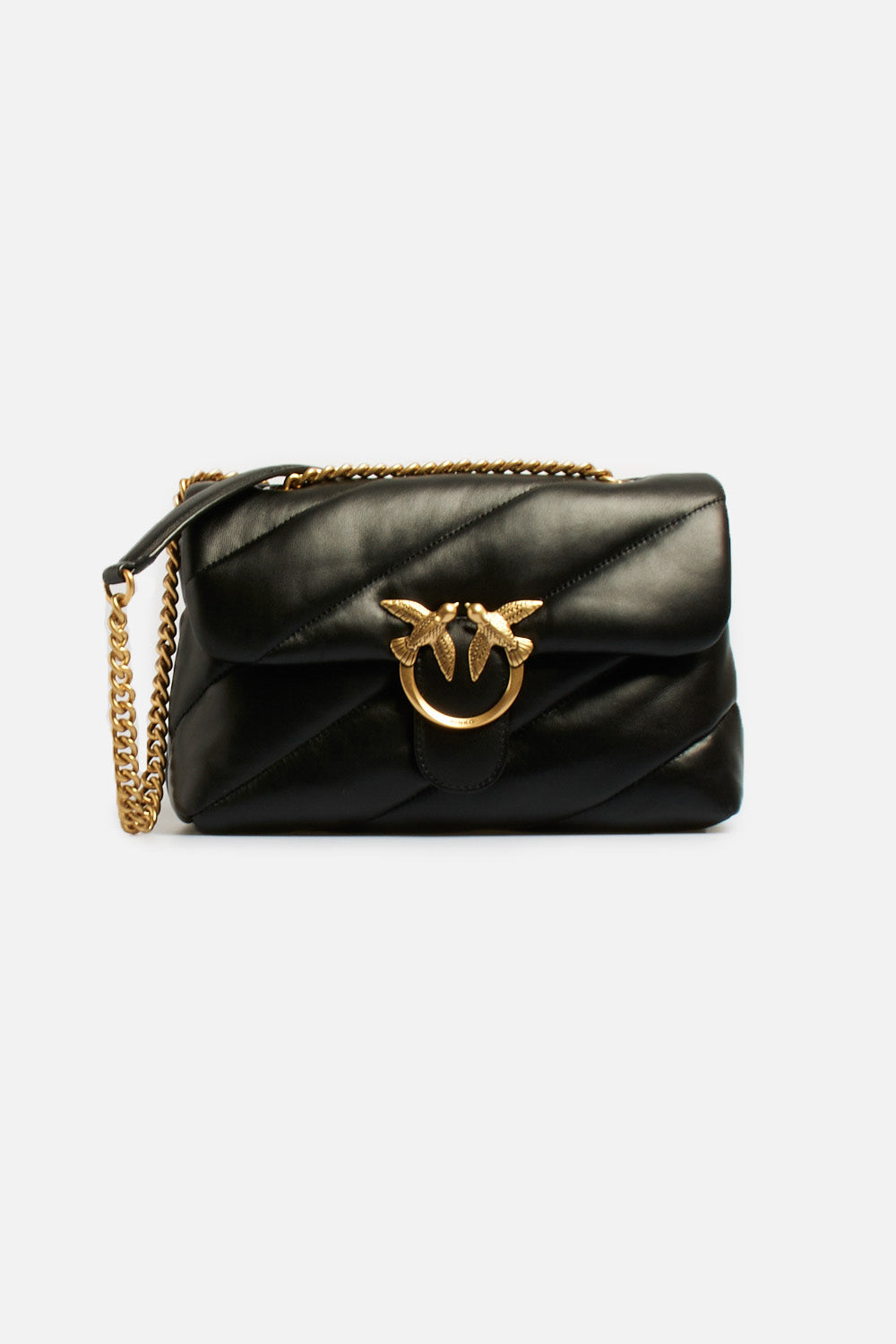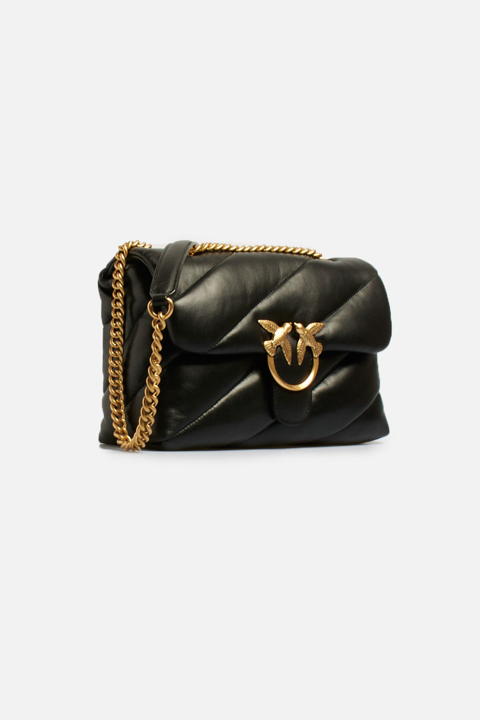 Classic Love Bag Puff di Pinko in morbida nappa con maxi trapuntatura obliqua, chiusura con iconica fibbia in metallo Love Birds Diamond Cut, interno Che comprende tramezza chiusa con zip e tasca a parete