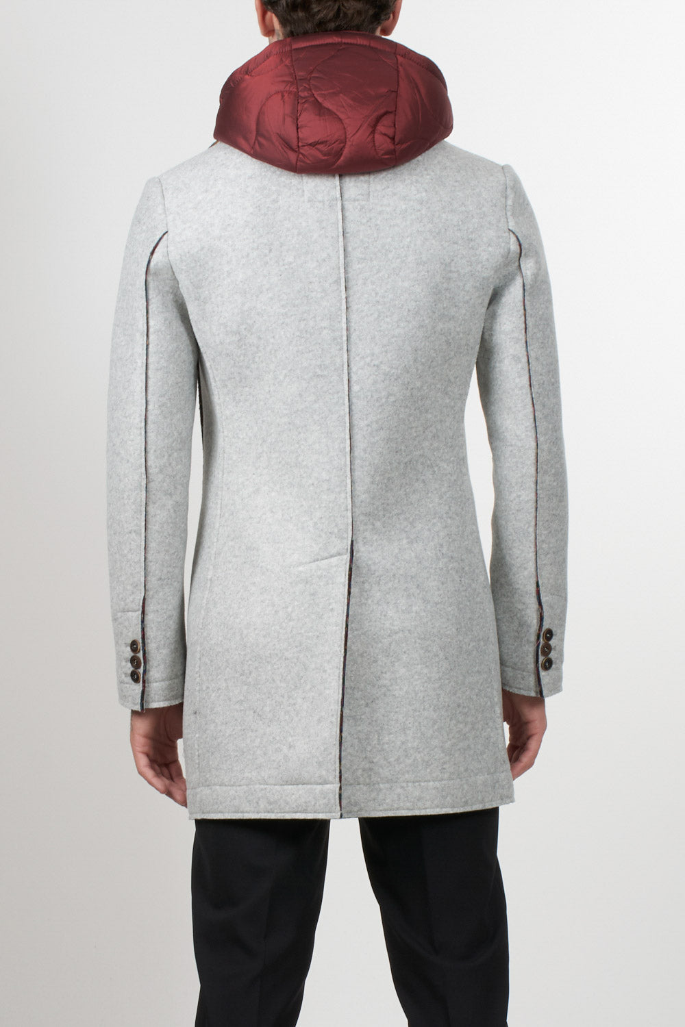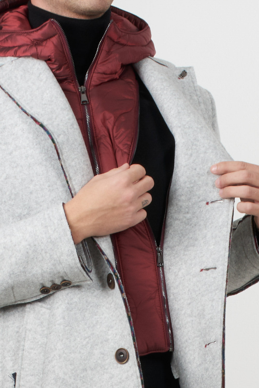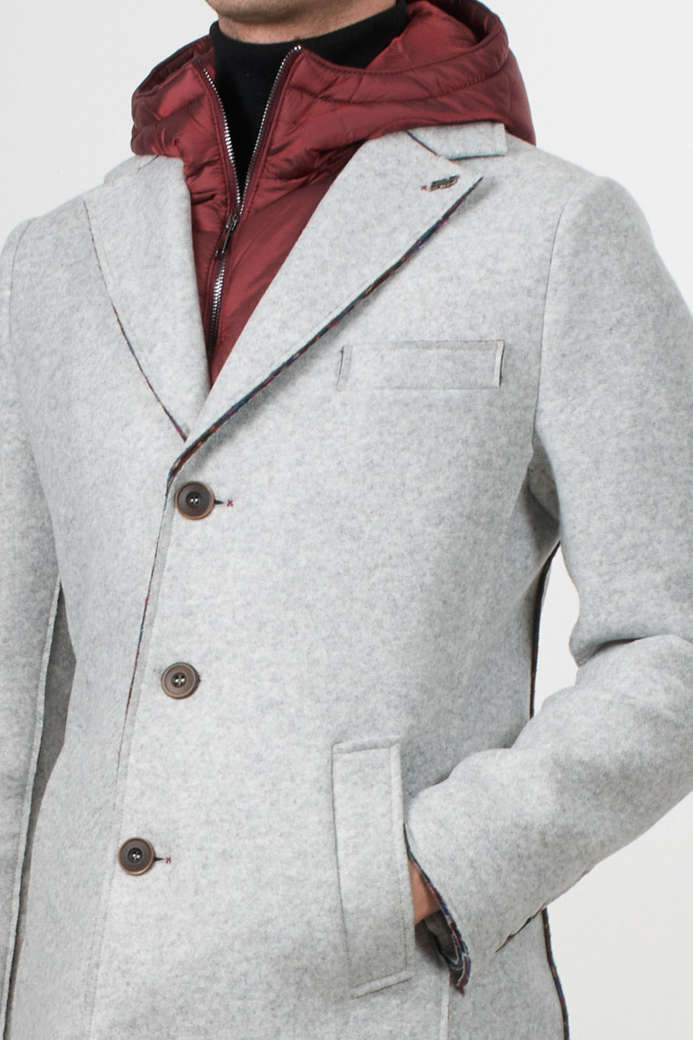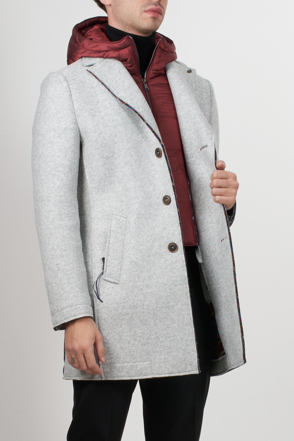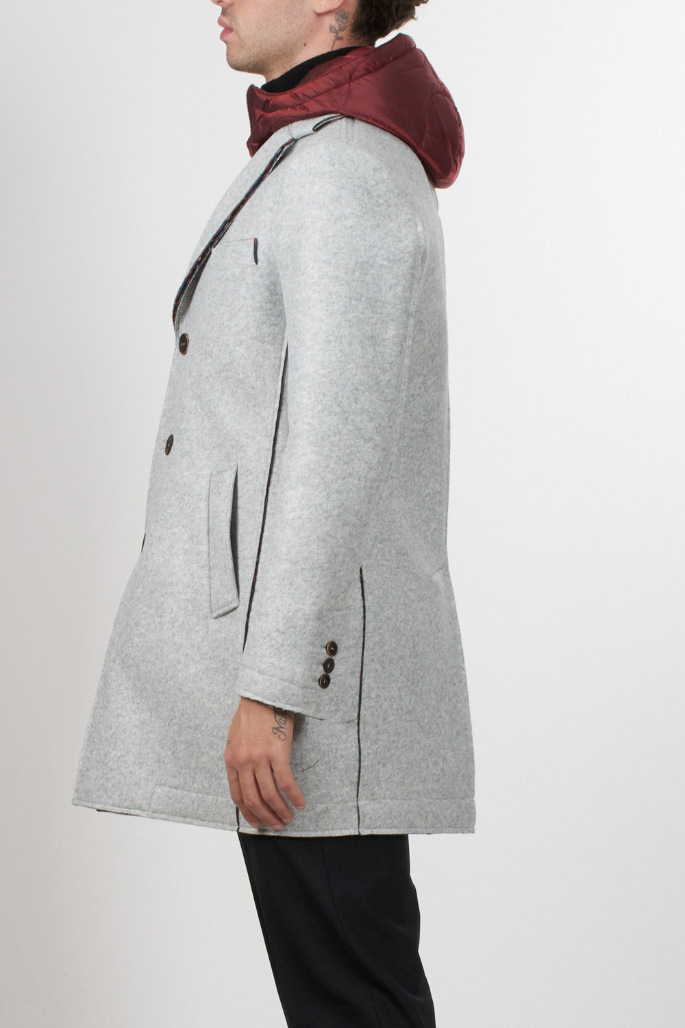 Cappotto Bob Company realizzato in panno, pettorina interna imbottita e removibile in contrasto rosso, che aggiunge comfort e un tocco sportivo. Presenta chiusura frontale con tre bottoni, revers classici, tasche laterali a filetto e taschino sul petto. La linea è pulita e strutturata, ideale per look casual ed eleganti durante la stagione fredda.