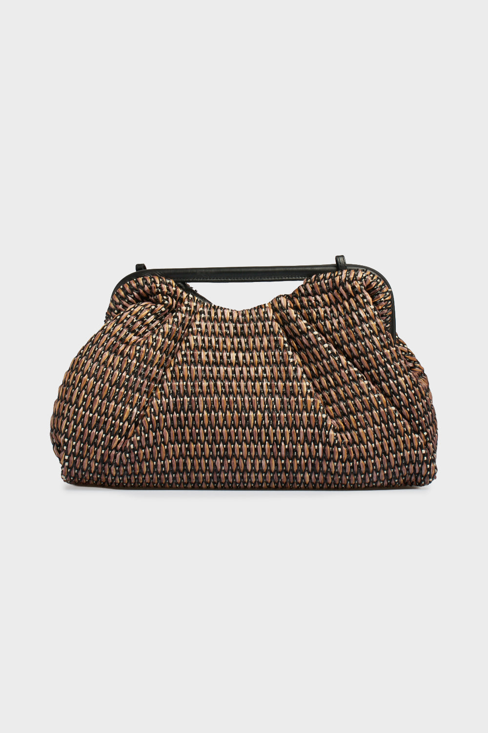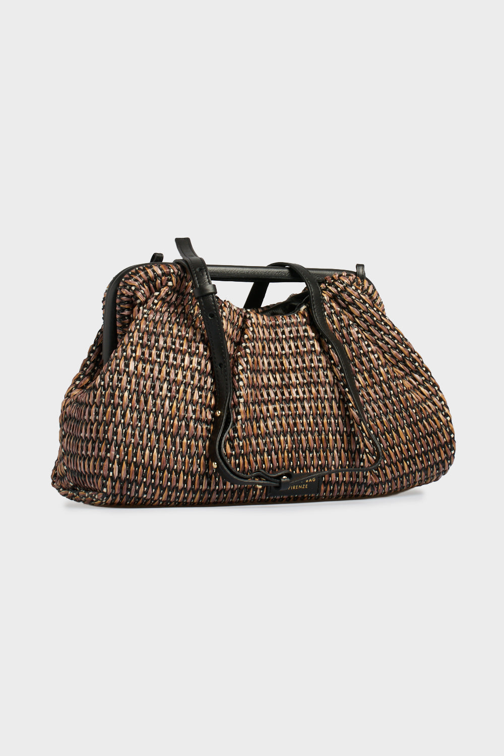 Questa creazione di My-Best Bag Firenze celebra l'artigianato toscano con un design che evoca atmosfere mediterranee e sofisticate. La borsa si distingue per la sua preziosa lavorazione in paglia intrecciata multicolore, dove le calde tonalità del cuoio si mescolano al nero e al panna in un pattern geometrico tridimensionale. La silhouette morbida e arricciata è sostenuta da una struttura rigida con cornice, creando un contrasto armonioso tra volume e rigore. Capiente e leggera, rappresenta l'accessorio ideale per elevare gli outfit estivi, garantendo un passaggio fluido da un look urban-day a un aperitivo al tramonto.