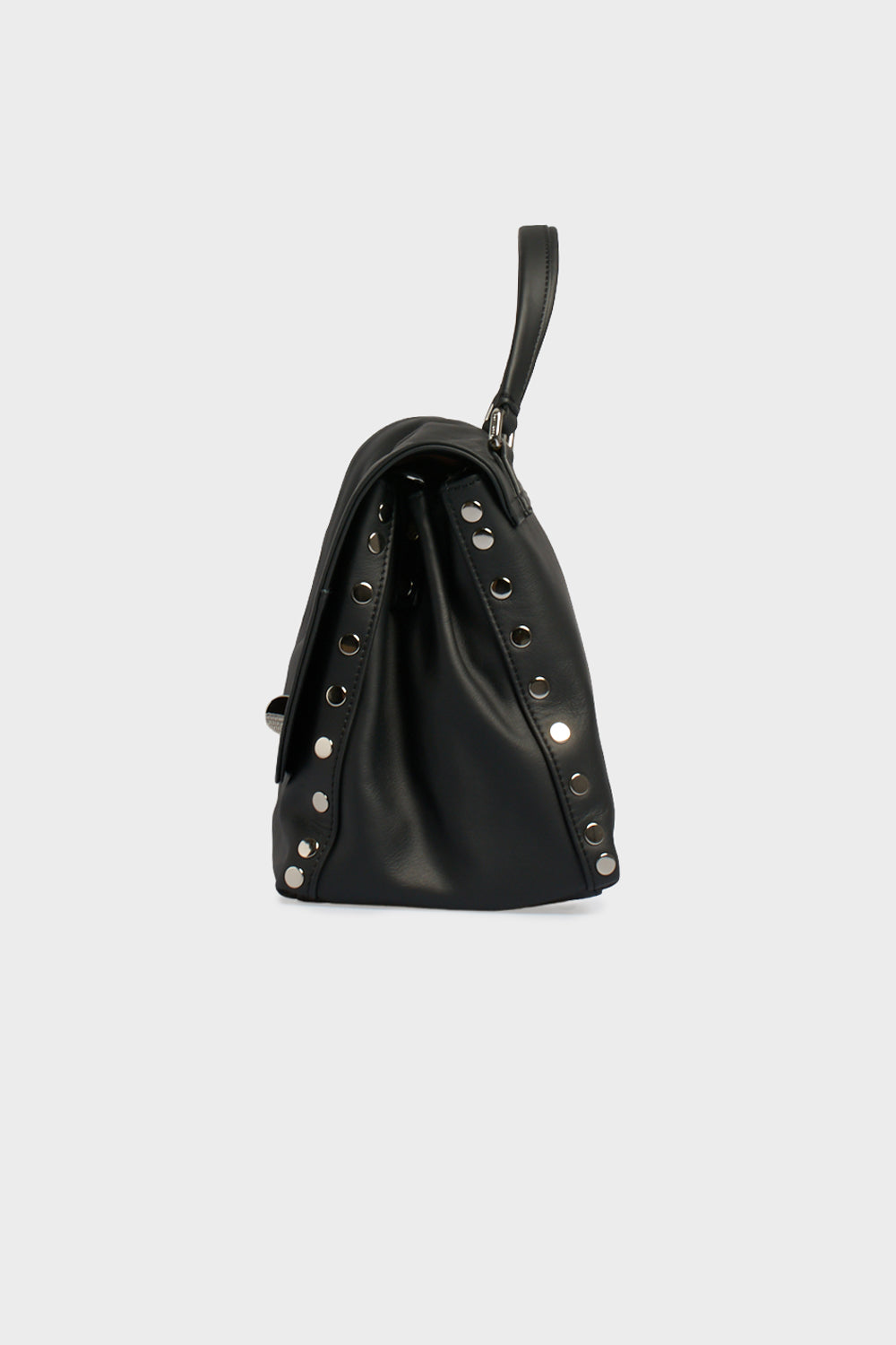 Dettagli Iconici: Chiusura a doppia girevole in metallo con finitura scura; fianchi decorati con le classiche borchie piatte metalliche.
