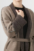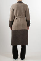 Cappotto lungo in maglia firmato Vicolo, caratterizzato da lavorazione bicolore con cintura abbinata in vita. Il modello presenta maniche lunghe, tasche frontali e dettagli con profilo e dettagli con profilo impreziosito da applicazioni gioiello. Morbido e avvolgente, ideale per completare look casual o raffinati nella stagione invernale.