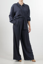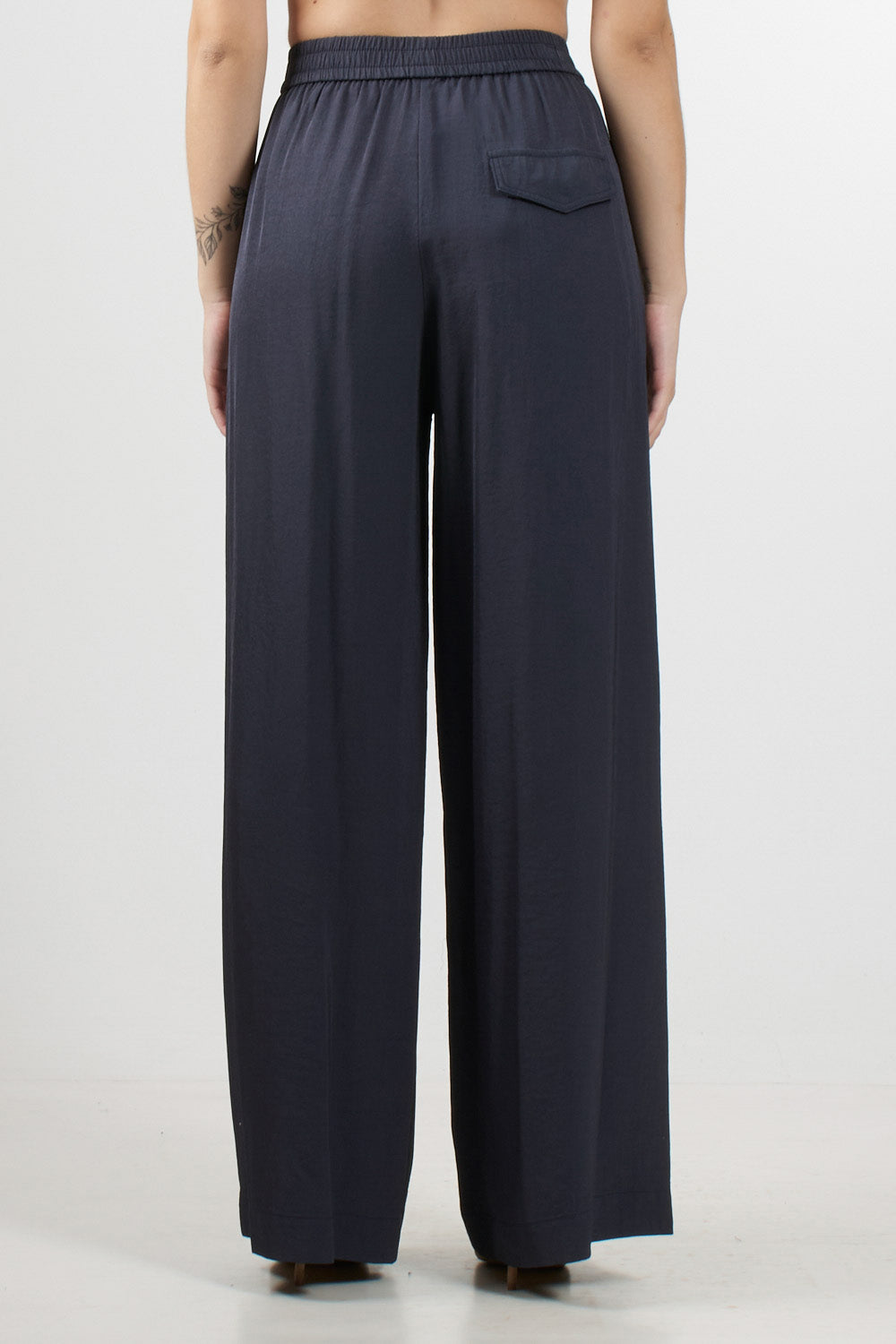 Pantalone Eleh a gamba larga con vita elasticata, tasche laterali. La linea morbida e il tessuto leggero lo rendono un capo confortevole e versatile, ideale sia per look casual che più eleganti.