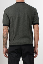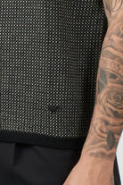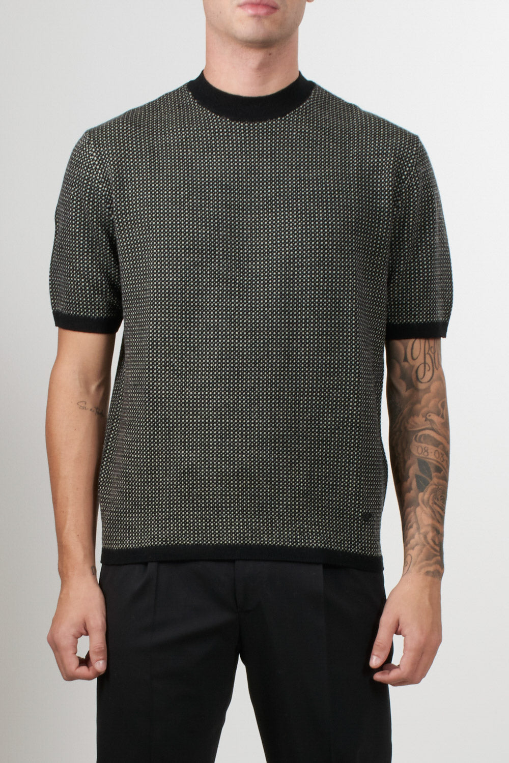 Maglia Emporio Armani realizzata in pura lana vergine, impreziosita da una raffinata lavorazione jacquard che percorre l’intero capo creando un micro motivo bicolore ad effetto optical. Il modello presenta maniche corte, profili a costine e un ricamo con micro aquila sul fondo sinistro, simbolo iconico del brand.