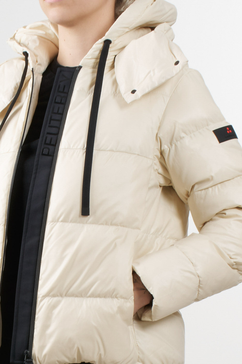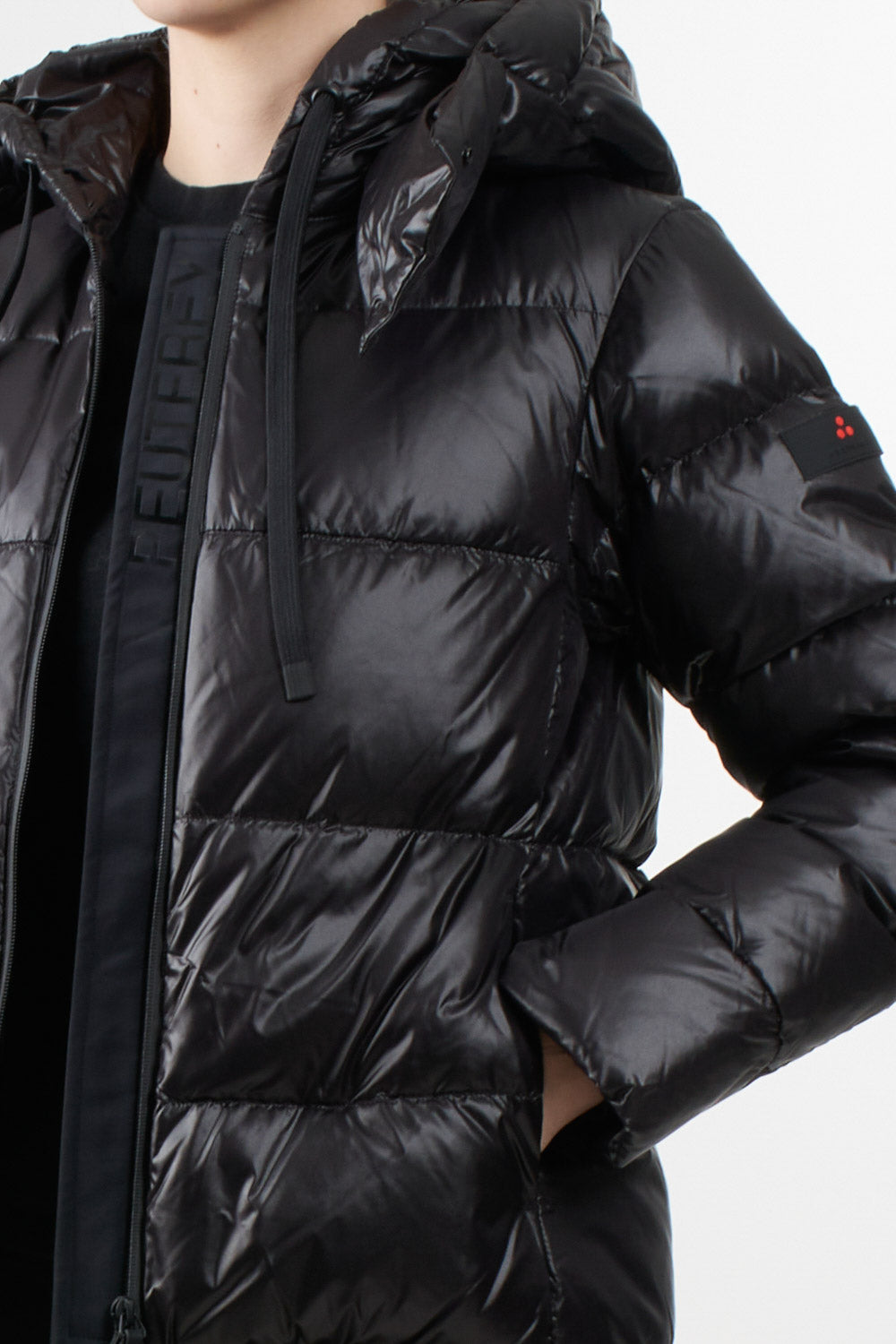 Piumino KENID LKS Peuterey modello corto realizzato in tessuto tecnico lucido, con imbottitura in vera piuma d’anatra e trapuntatura orizzontale. Il modello presenta cappuccio fisso regolabile con coulisse, chiusura frontale con zip a doppio cursore e tasche laterali con zip invisibili. L’effetto lucente del tessuto dona al capo un aspetto contemporaneo e raffinato, mentre il logo Peuterey sulla manica aggiunge una firma discreta. Un capo caldo e versatile, ideale per la stagione invernale. Vestibilità regular
