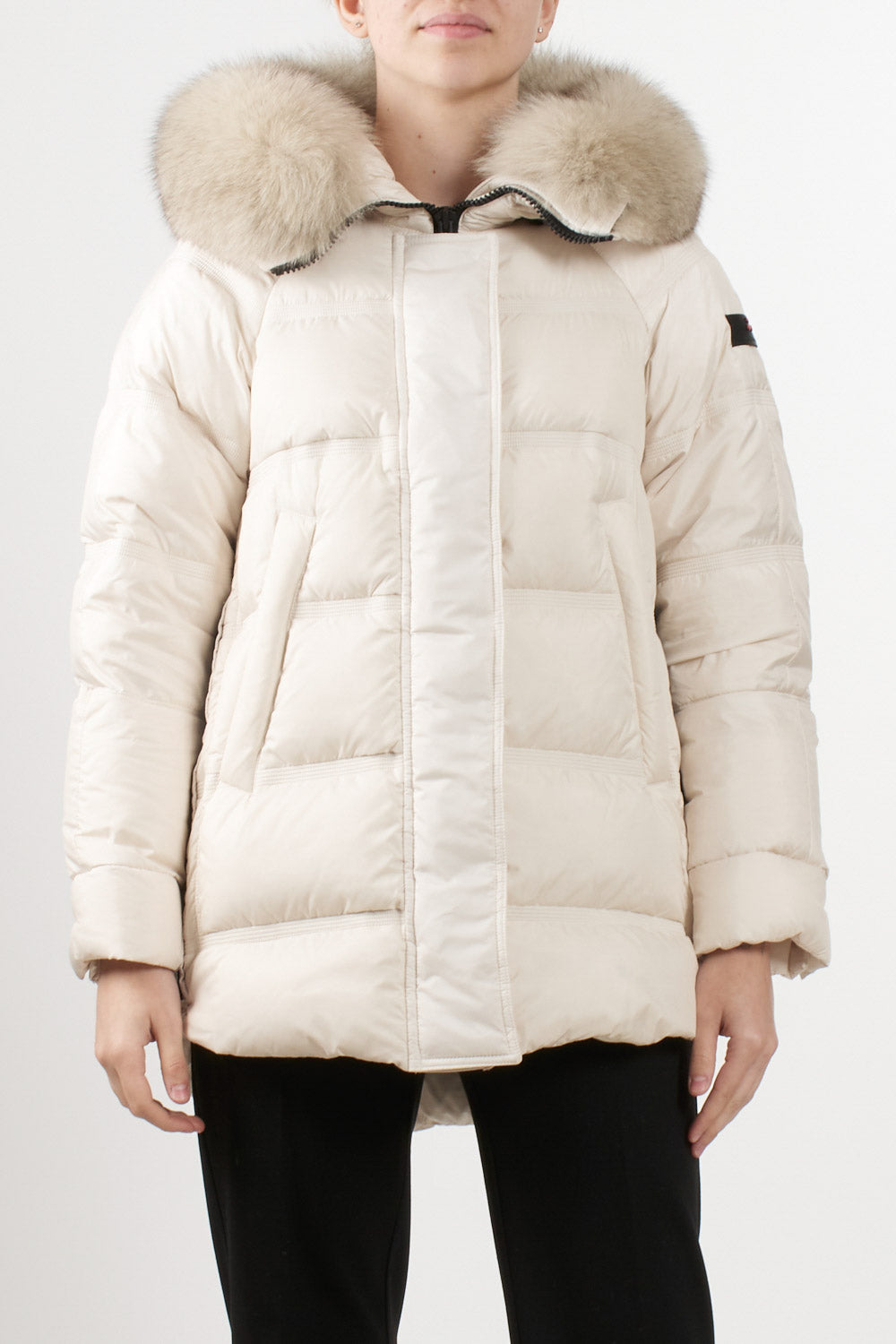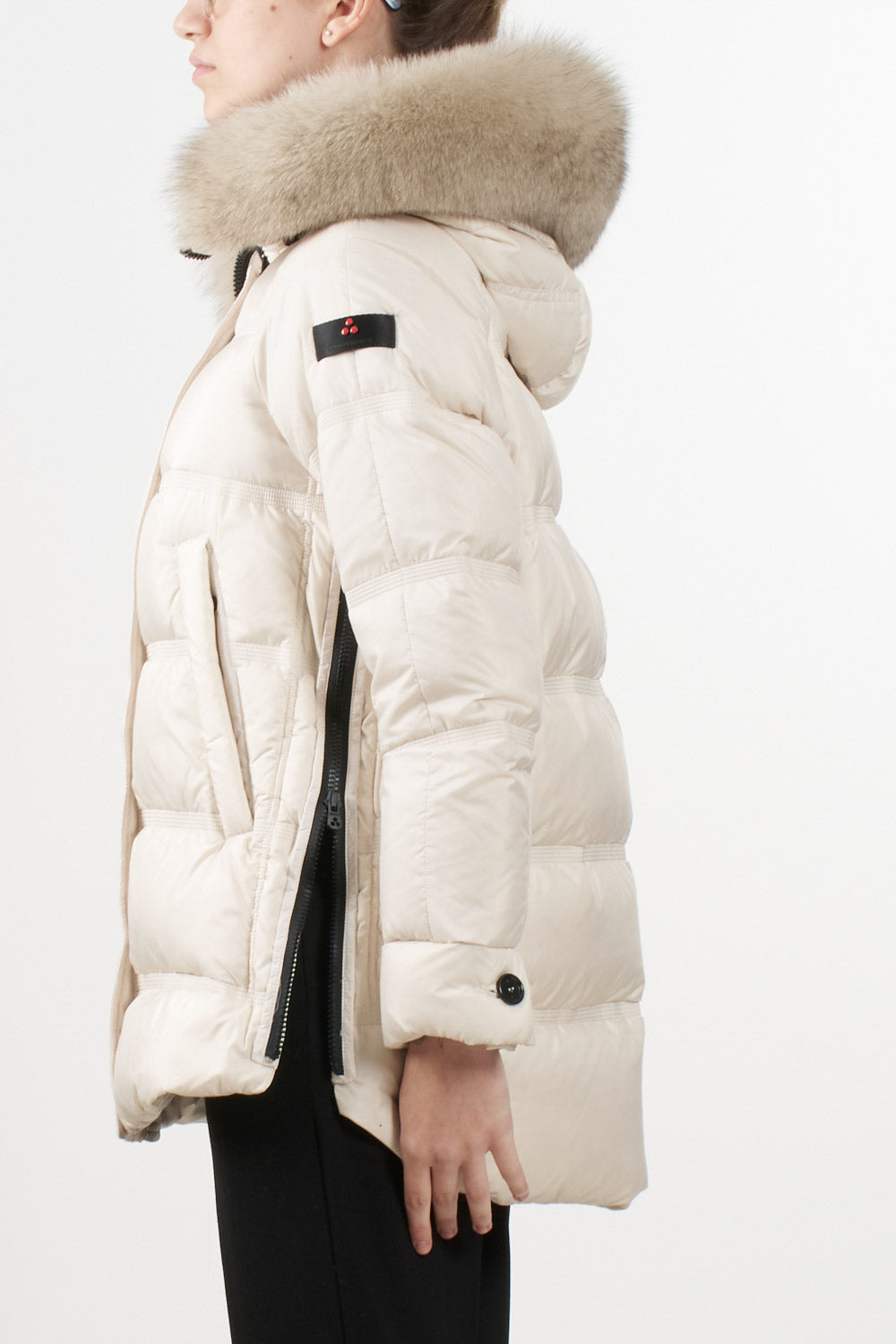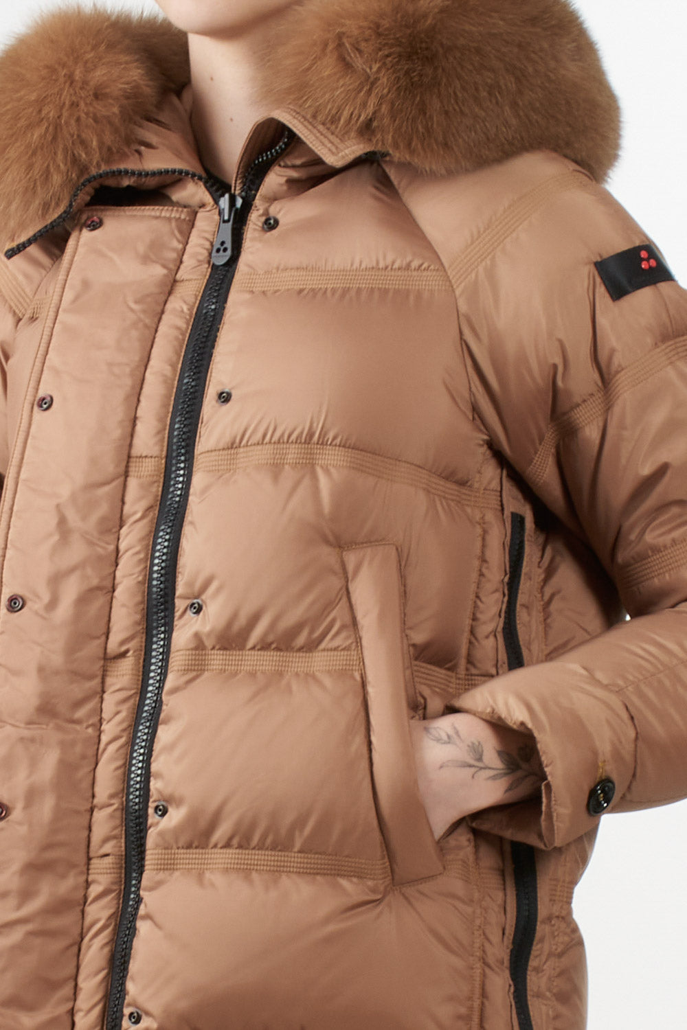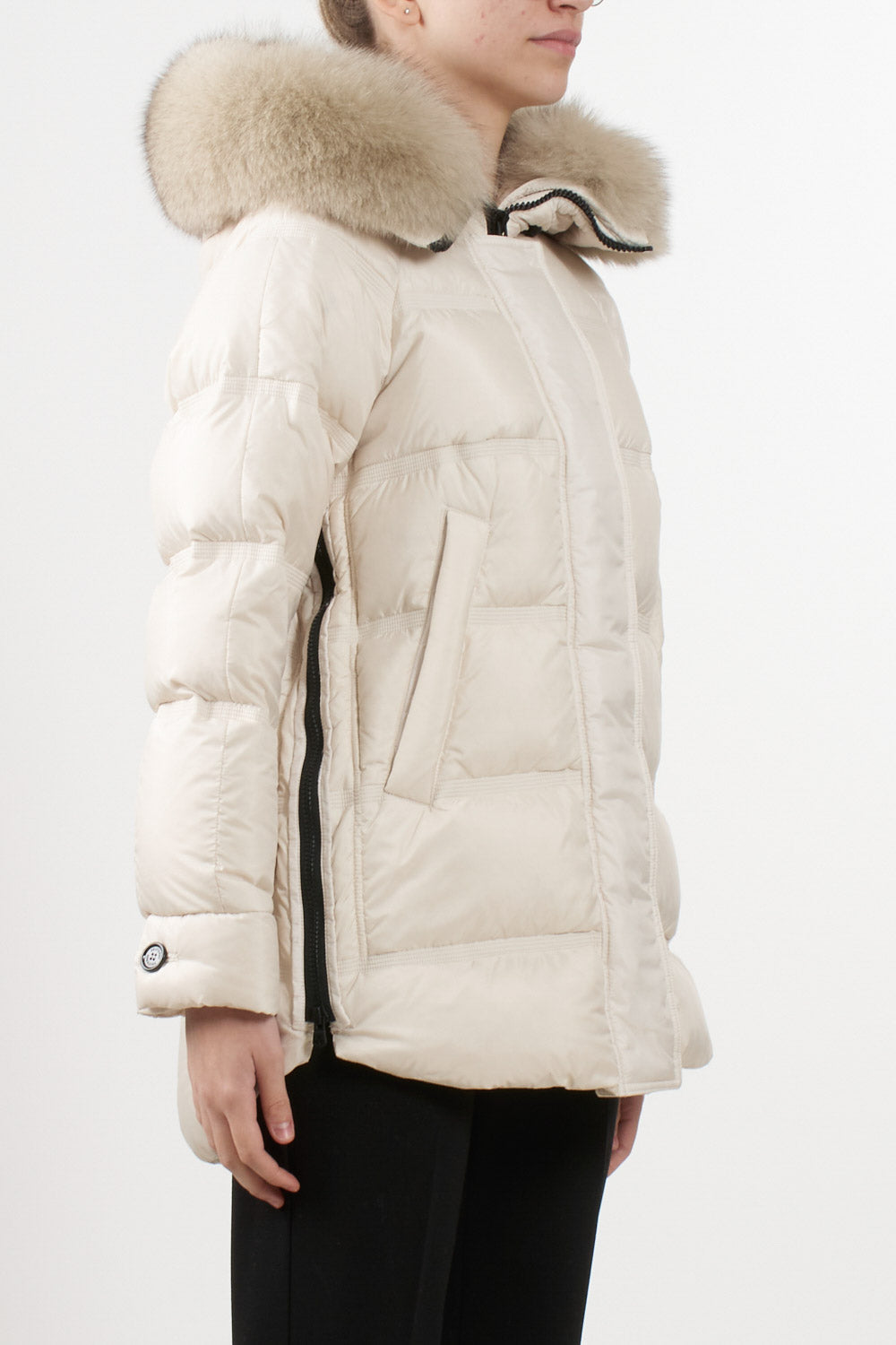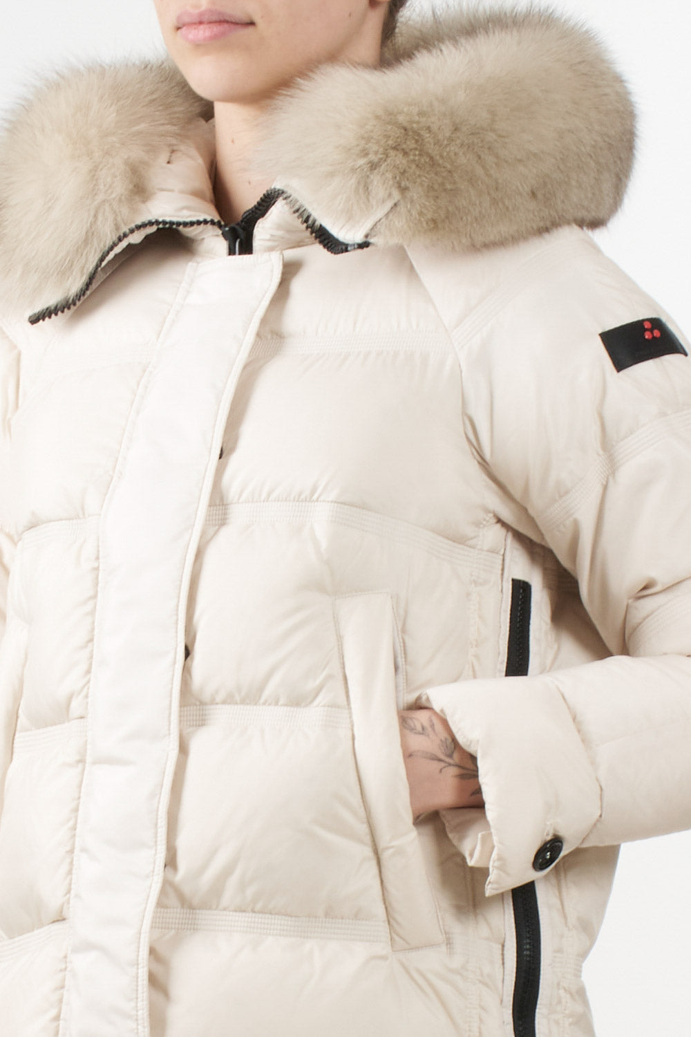 Giubbino Takan di Peuterey in tessuto super-light dalla struttura super compatta, apertura con zip laterali, Cappuccio a collo alto con pelliccia di volpe staccabile, coulisse, tasche a filetto, chiusura con zip nascosta a doppio cursore, patta e bottoni, estremamente morbido e idrorepellente.
