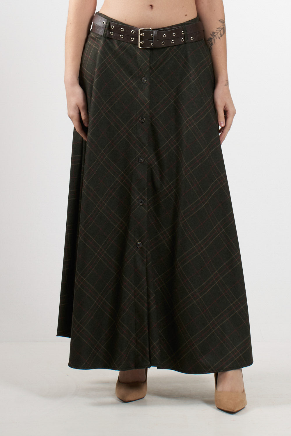 Gonna motivo check con chiusura con bottoni e cintura in vita, tasche laterali