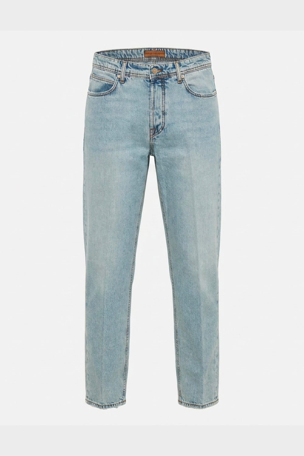 Jeans a cinque tasche con vestibilità loose fit, realizzati in denim di puro cotone. Il capo presenta un lavaggio chiaro. La costruzione è definita da cuciture a contrasto color tabacco, con un ricamo geometrico distintivo sulle tasche posteriori e una patch logo in pelle color cuoio applicata sulla cintura.