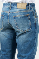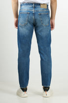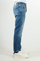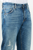 Jeans Pt Torino effetto vissuto e rotture  sul davanti, vita regolare, chiusura con bottone e zip, cinque tasche e label logata applicata sul retro.