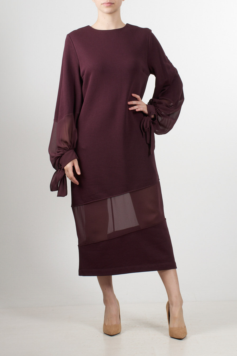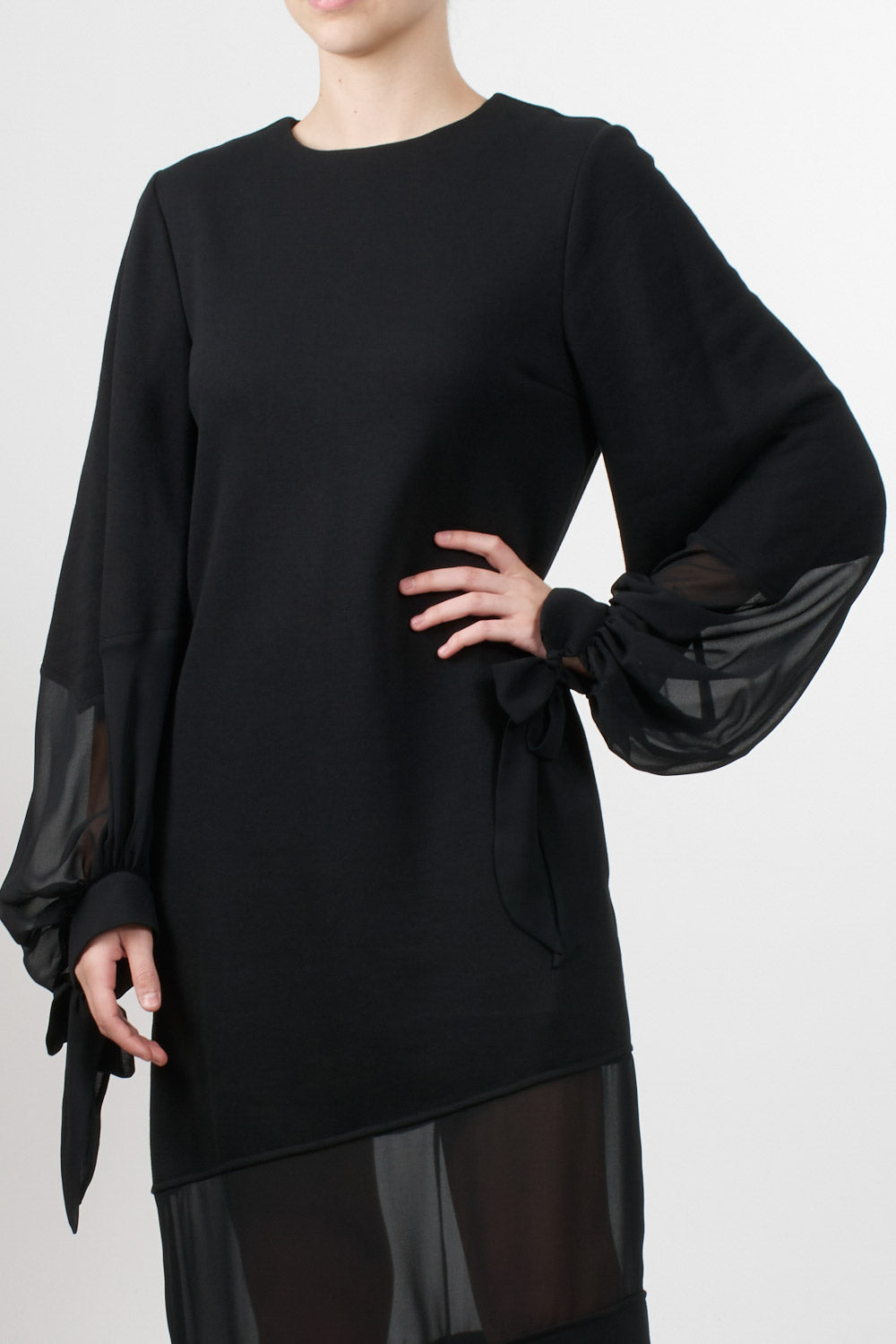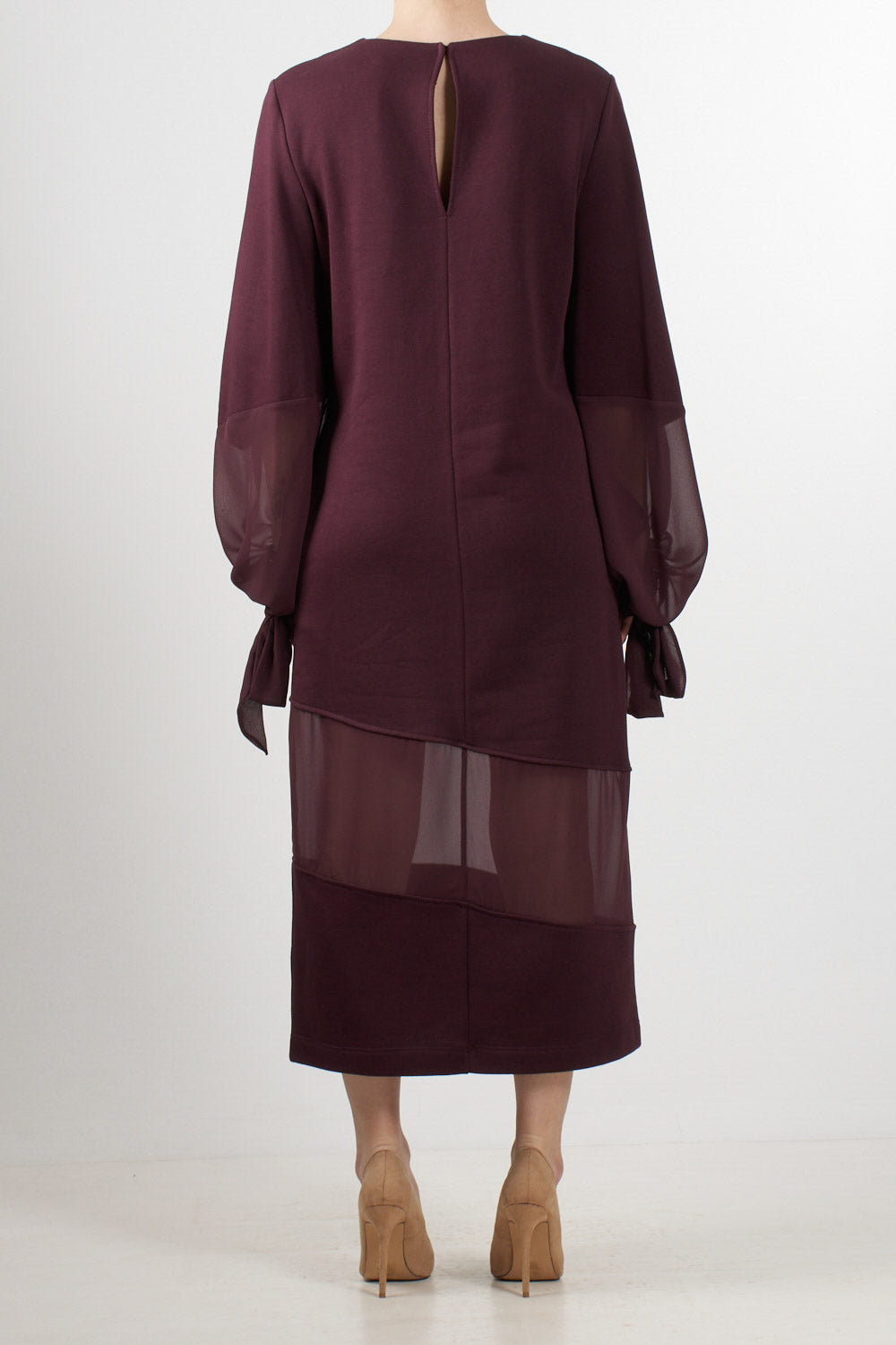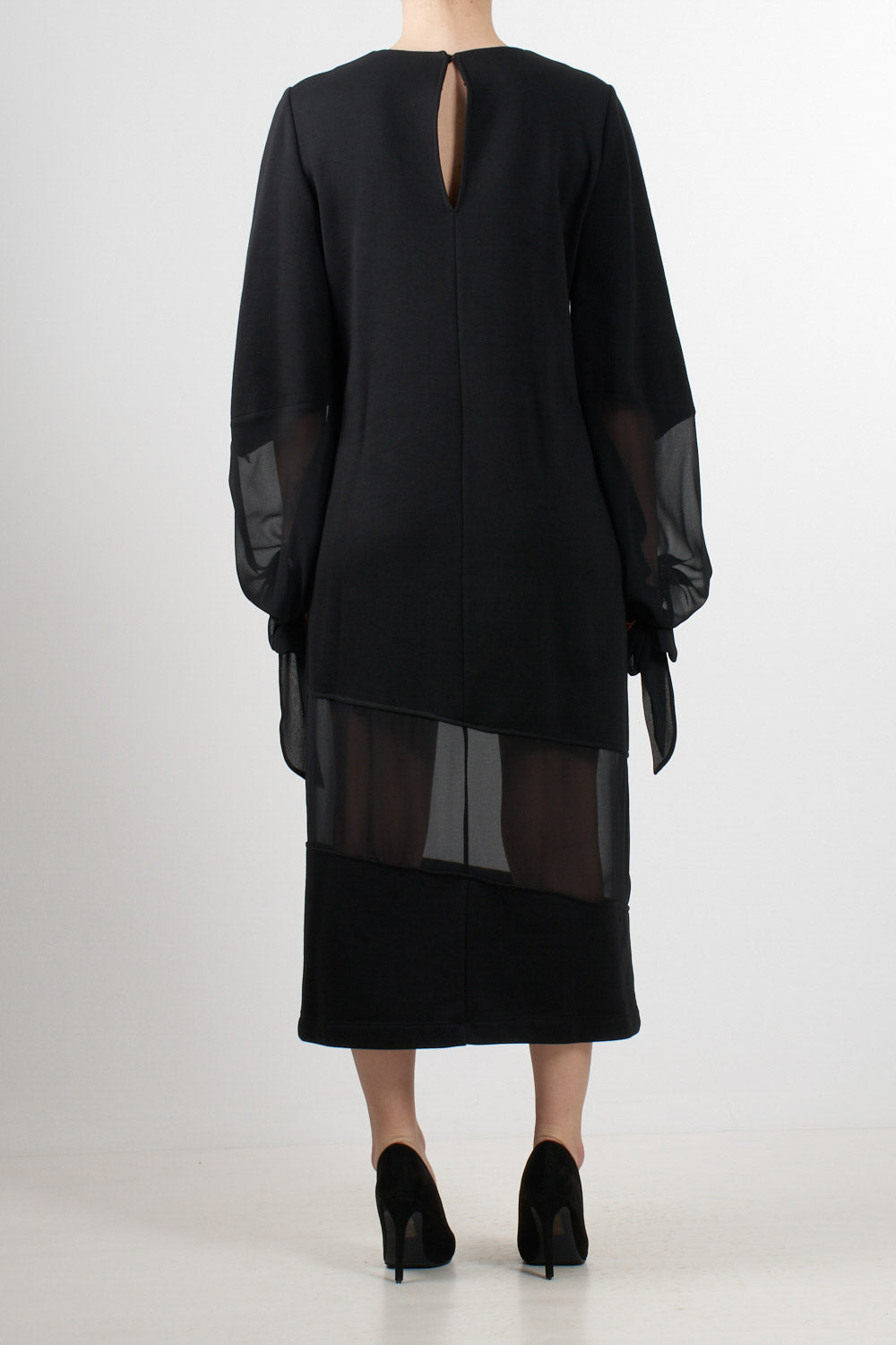 Abito dalla linea morbida e sofisticata di Jijil, realizzato in morbido tessuto di cotone con inserti in voile tono su tono. Il modello presenta maniche lunghe con polsini a fiocco, tasche laterali, fondo asimmetrico con pannello trasparente che dona un tocco contemporaneo al look.