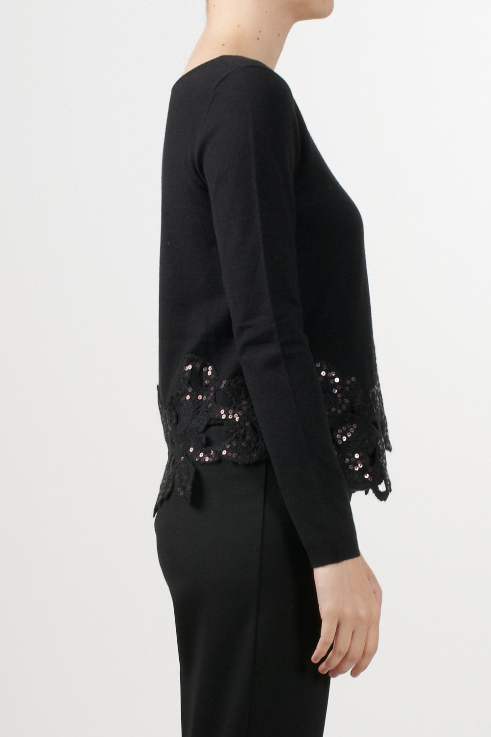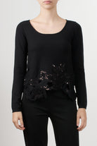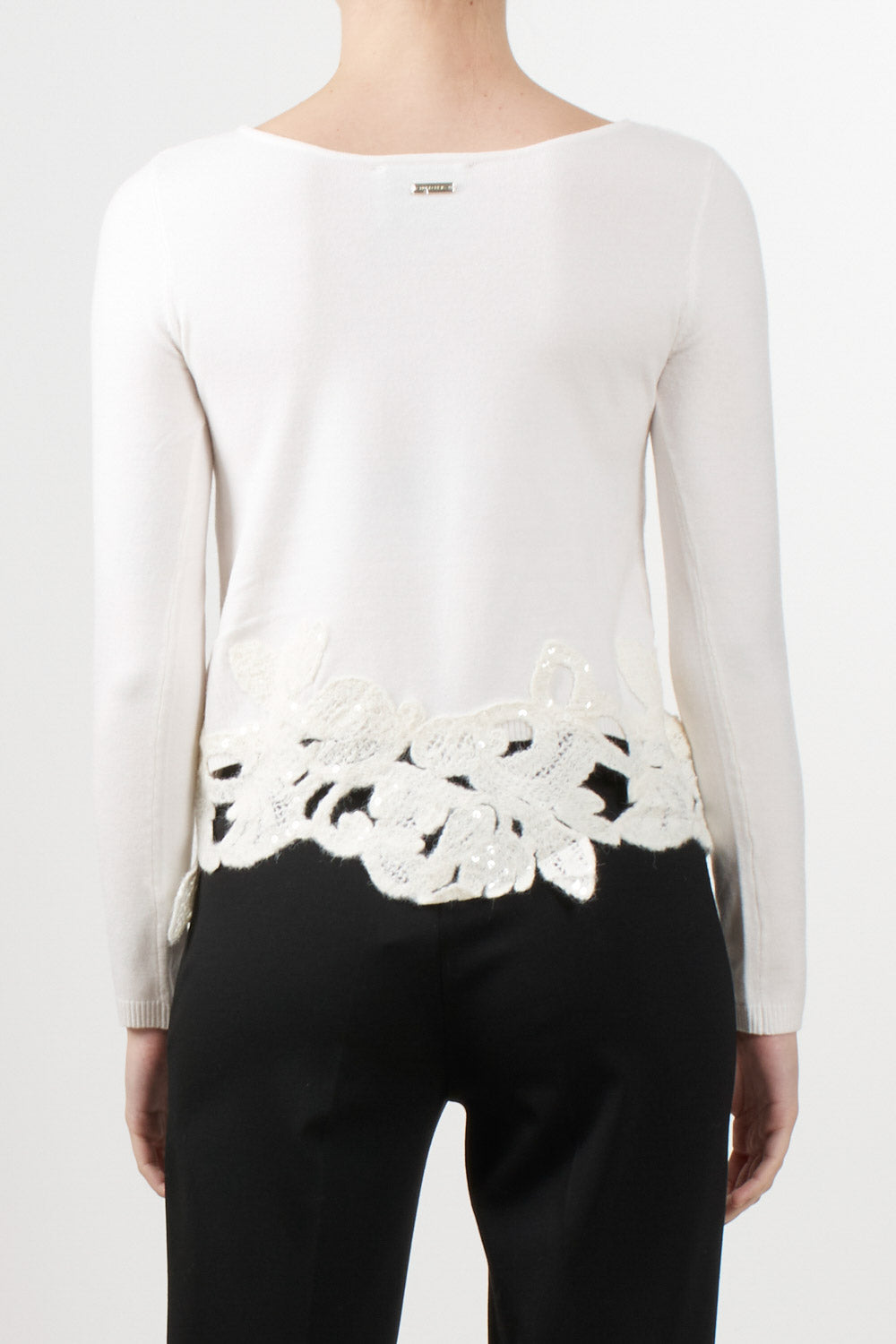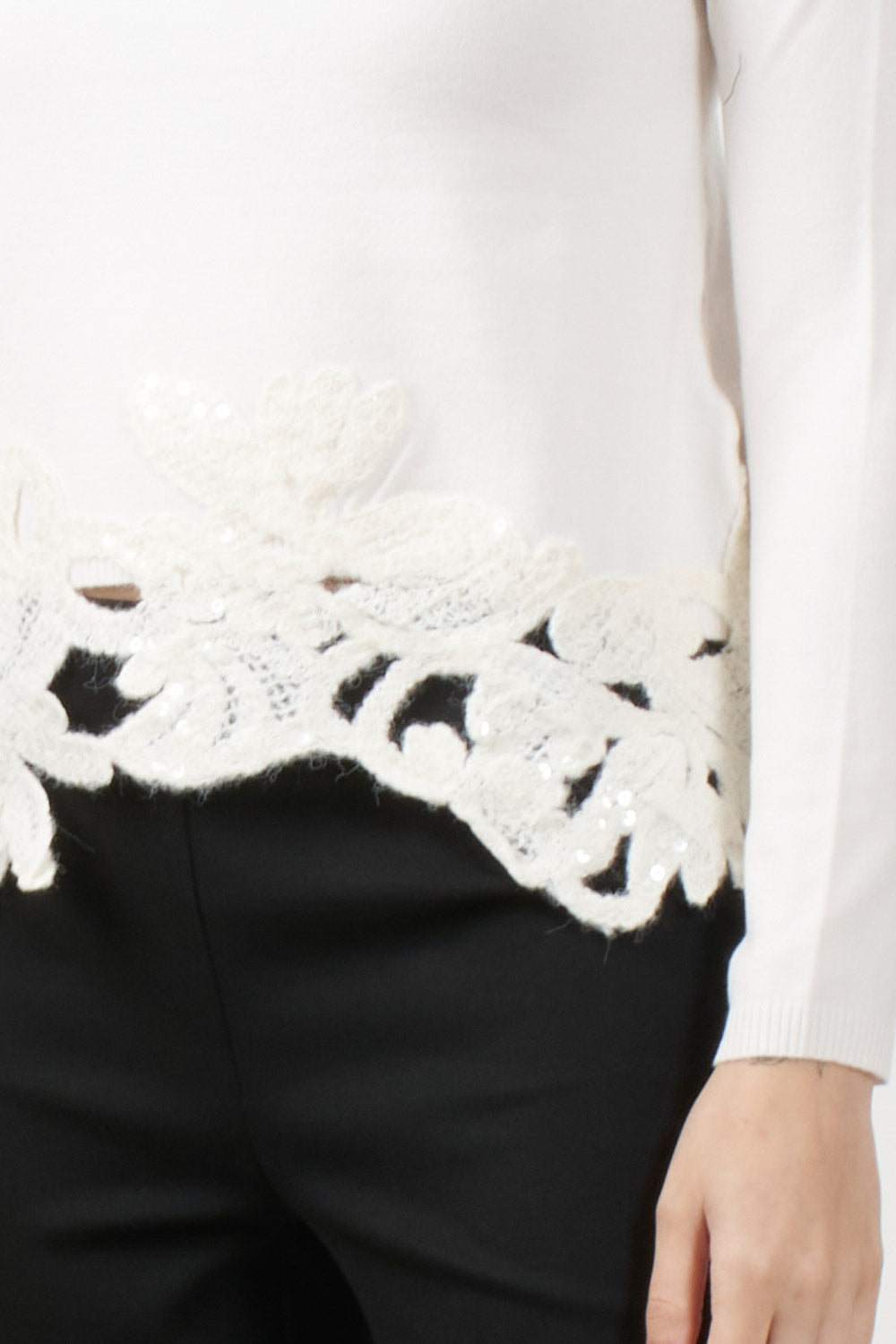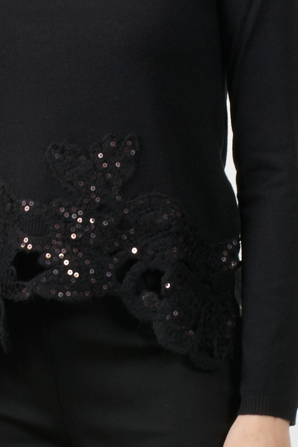 Maglia firmata No Secrets elegante e raffinato, Realizzata in maglia fine dalla vestibilità morbida, presenta un delicato scollo rotondo e un raffinato inserto in pizzo floreale con paillettes sul fondo, che dona luminosità e movimento all’outfit. Un modello versatile e chic, ideale da abbinare a pantaloni eleganti o gonne midi per un look sofisticato e contemporaneo.