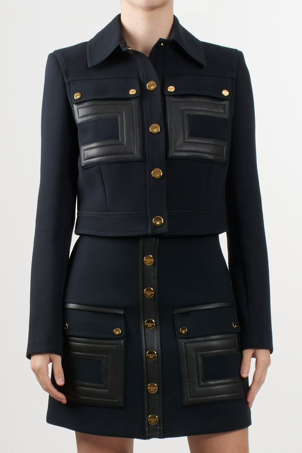 Giacca in doppio crêpe di Elisabetta Franchi, spalle imbottite, colletto a camicia e maniche lunghe,patch ricamate con logo embossed sulle tasche e bottoni dorati con logo