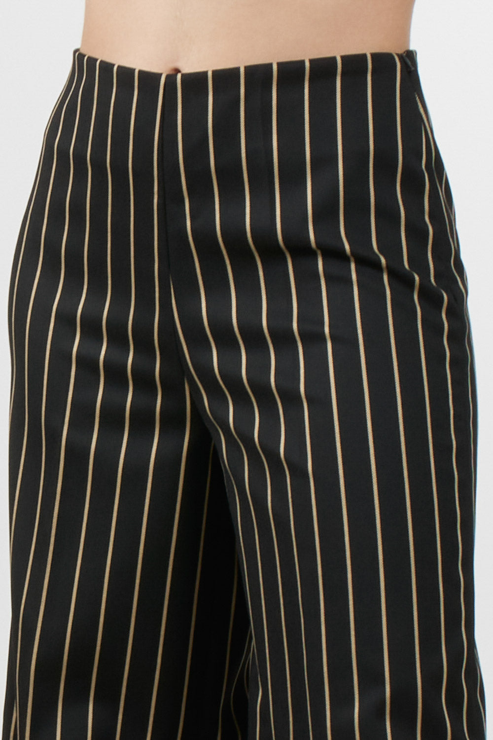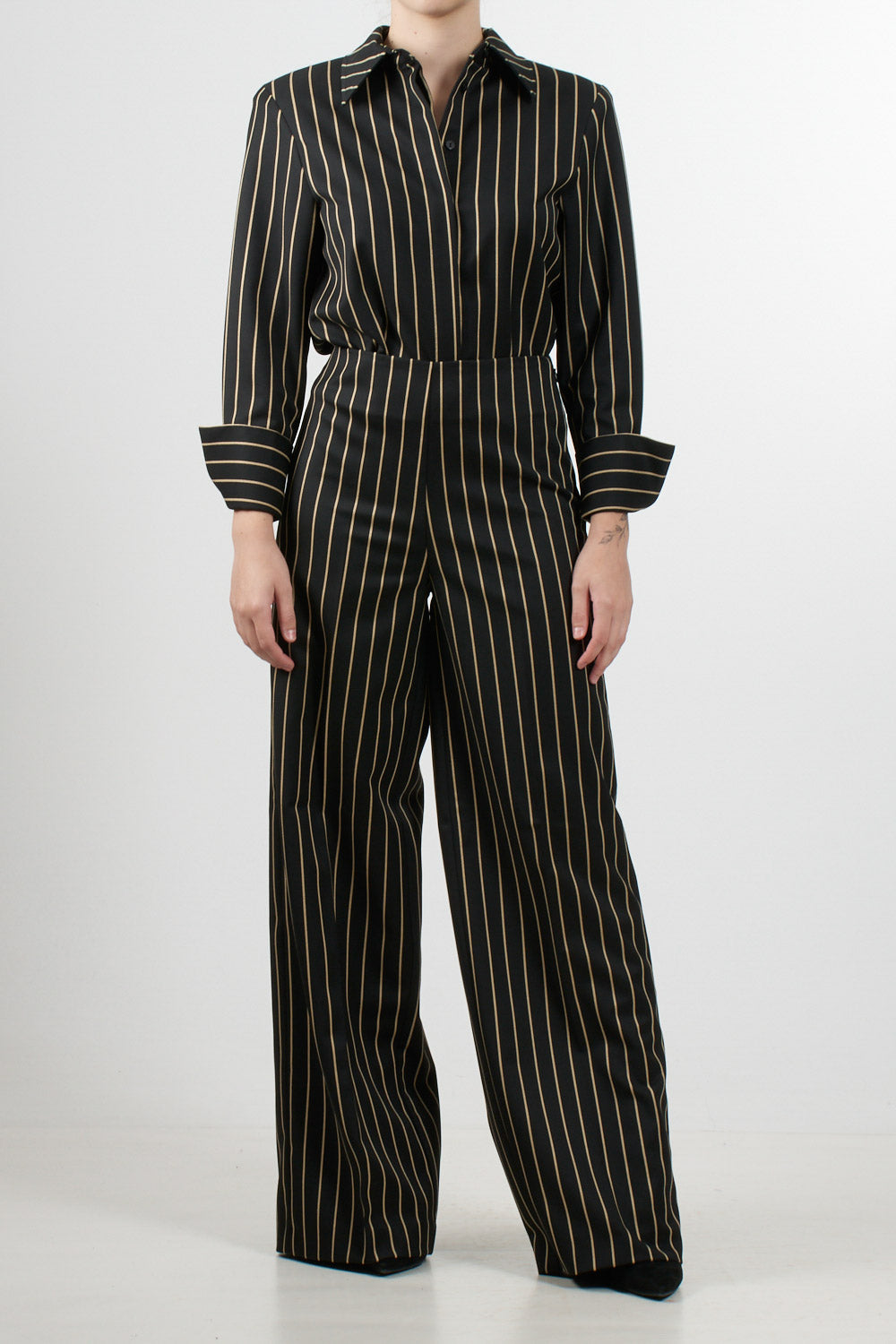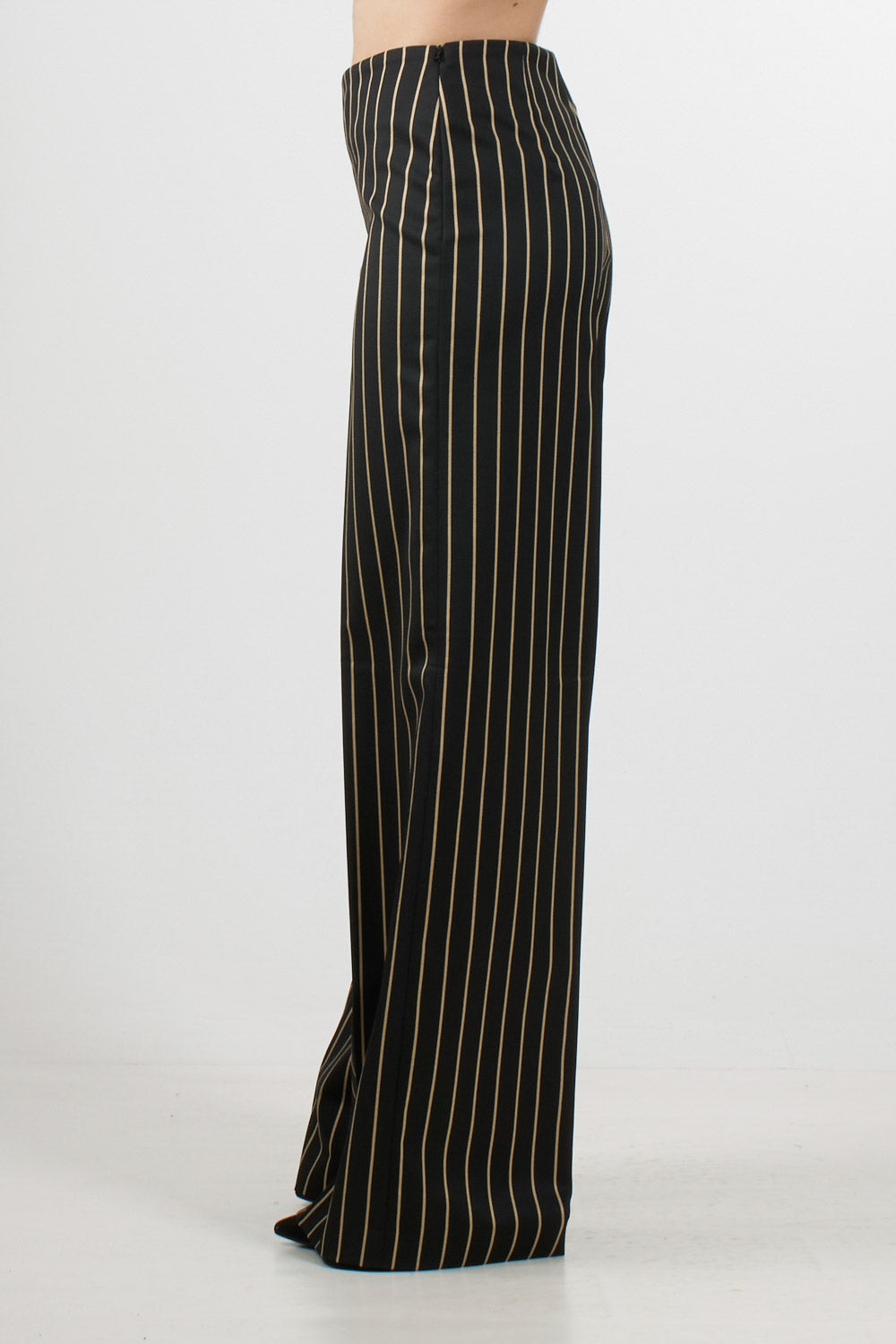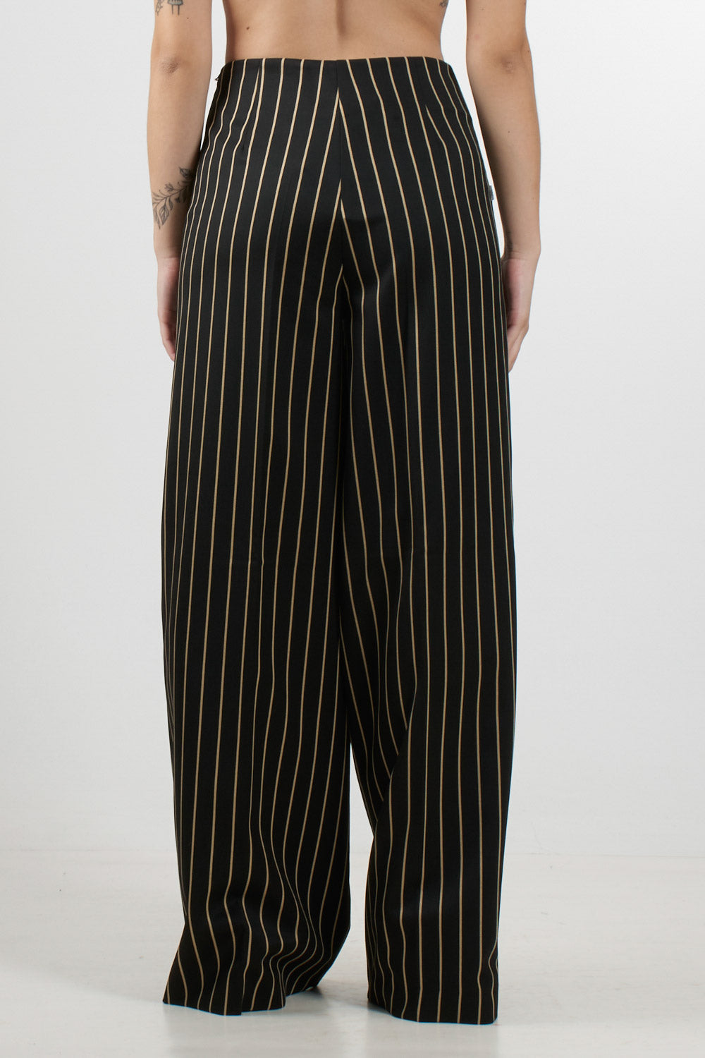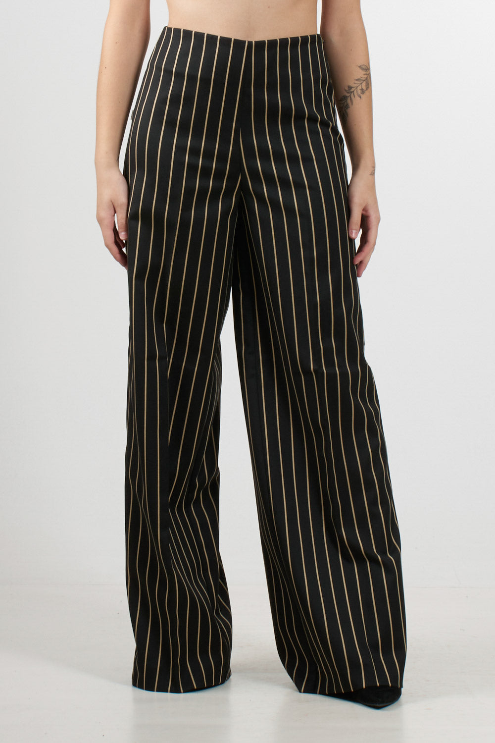Pantalone Jijil dalla linea palazzo con motivo a righe verticali che slanciano la figura. Il design a vita alta con chiusura frontale garantisce una vestibilità elegante e contemporanea, perfetta sia per look formali che per abbinamenti casual chic.