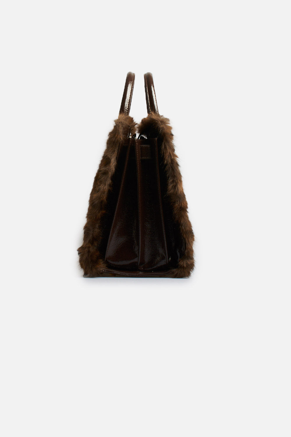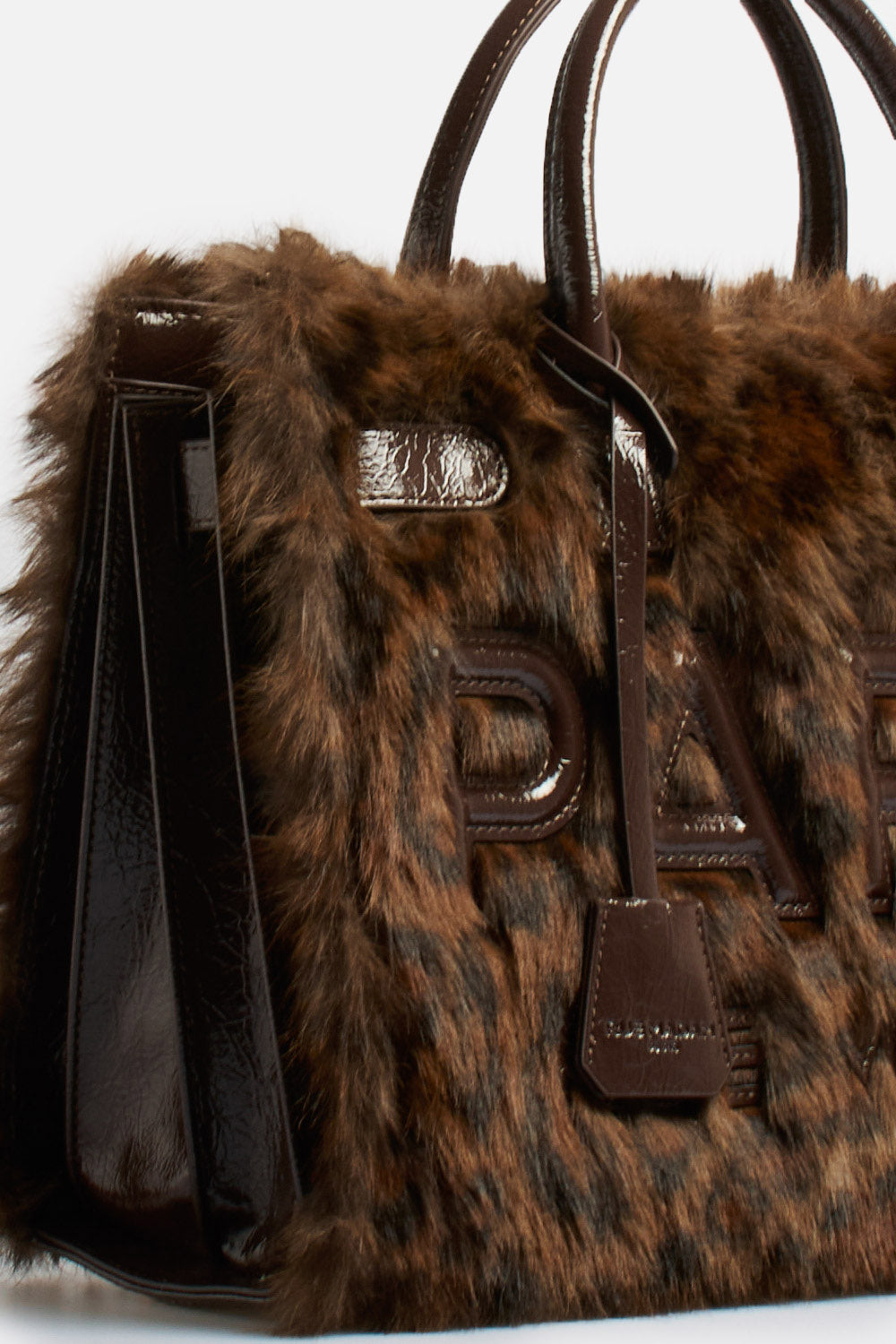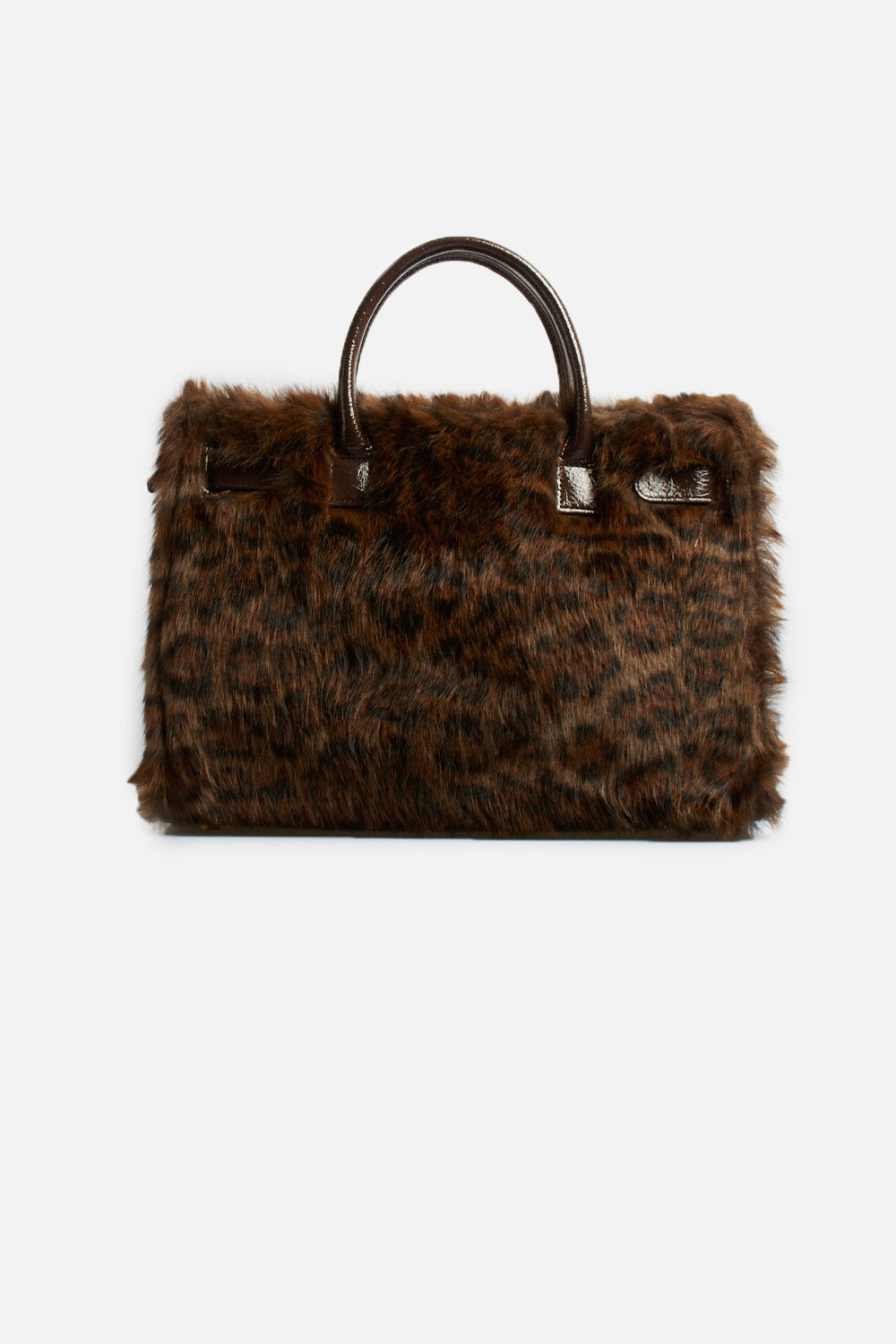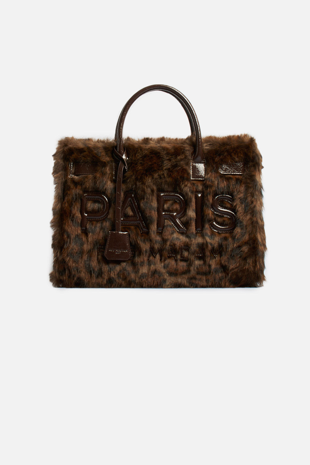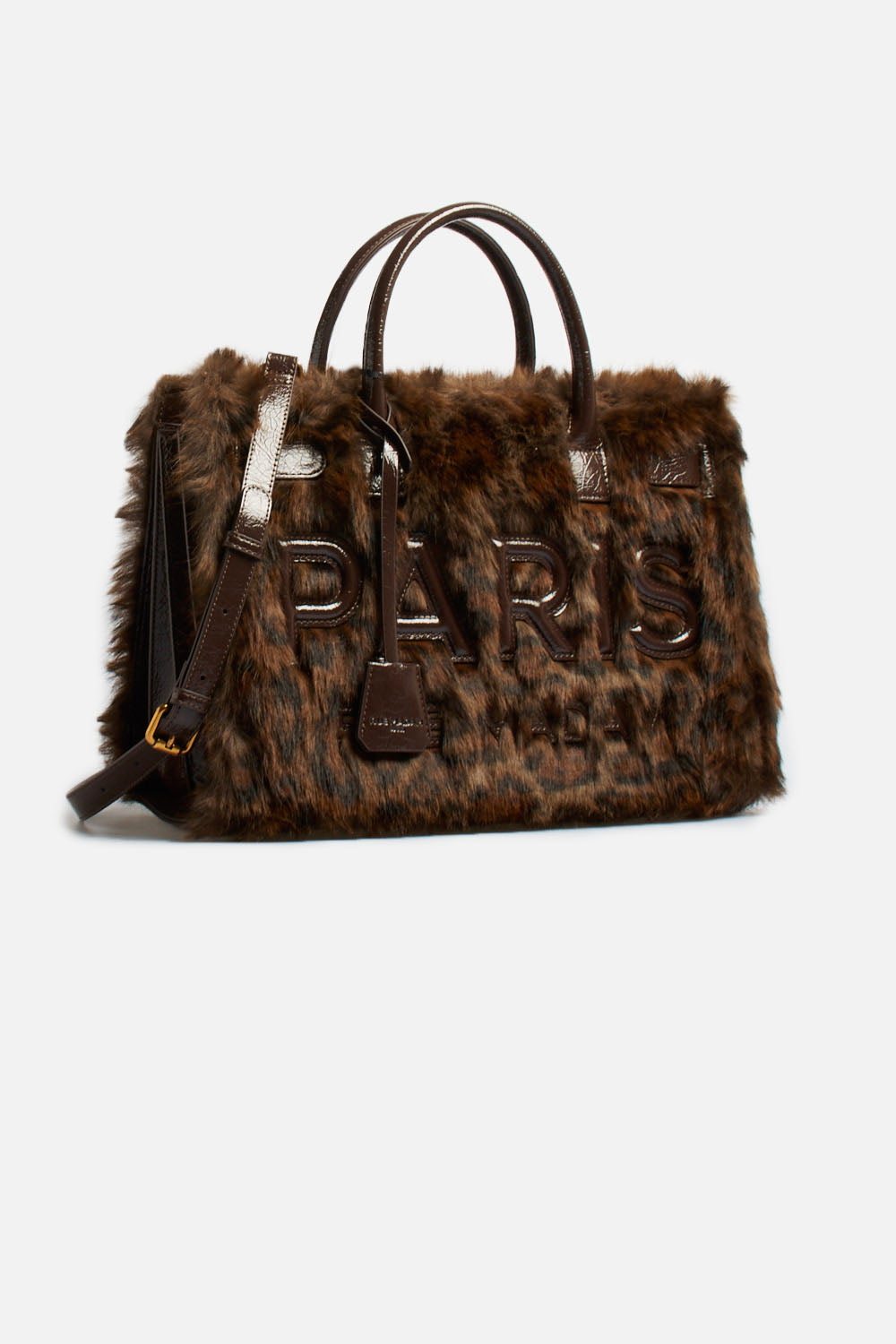 Borsa Alaska di Rue Madame Paris realizzata in materiale effetto pelliccia con finitura maculata e superficie morbida, scritta “PARIS RUE MADAM” in rilievo tono su tono, doppi manici rigidi e tracolla regolabile e amovibile in materiale effetto vernice targhetta portanome coordinata