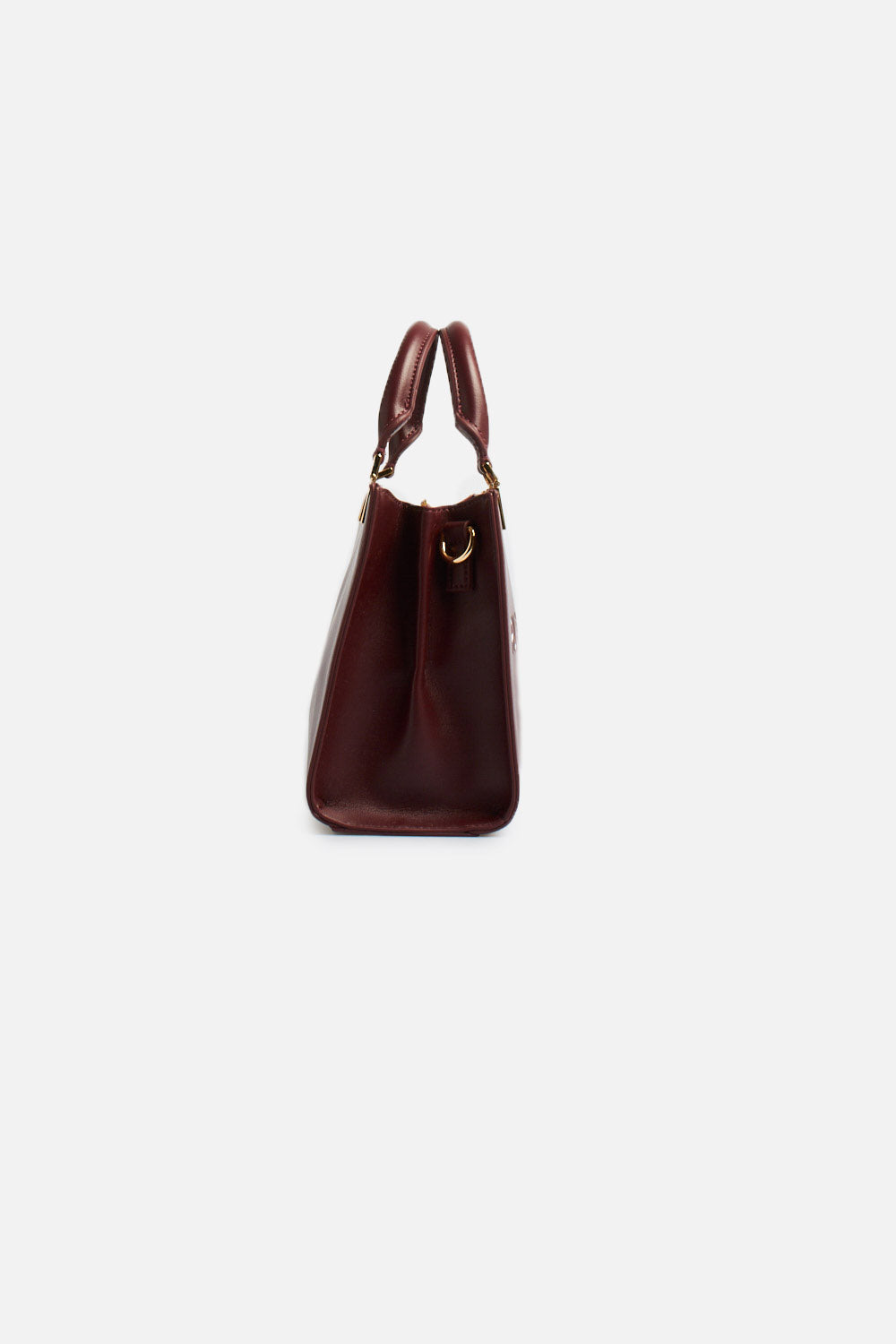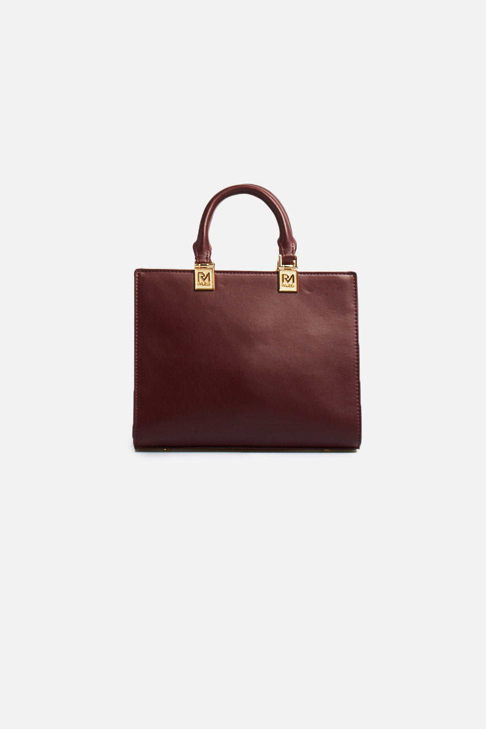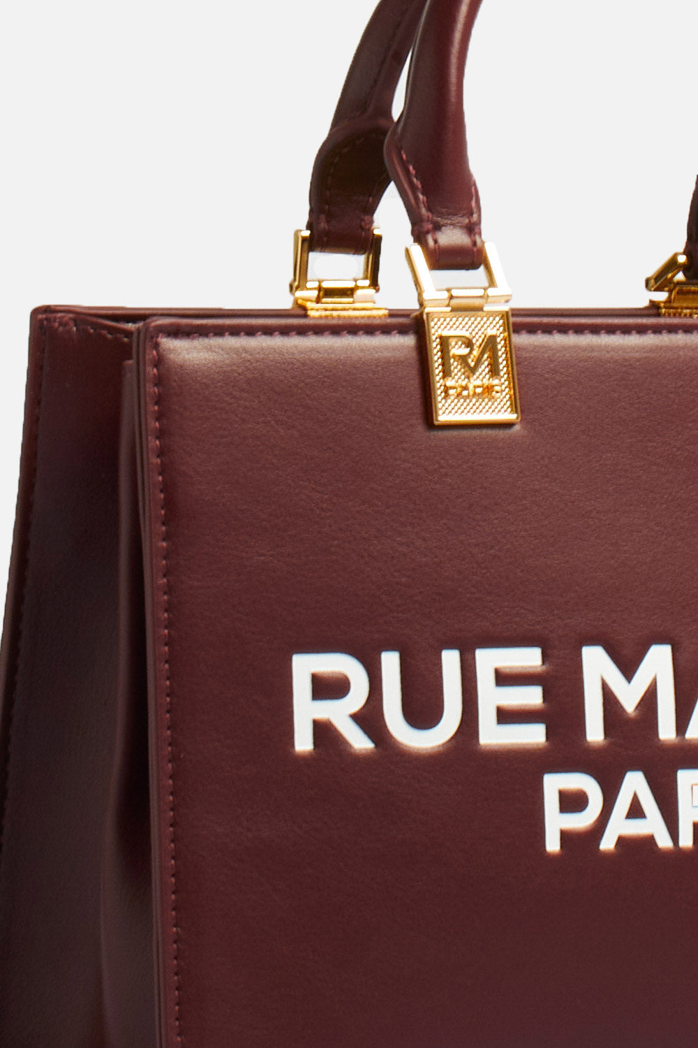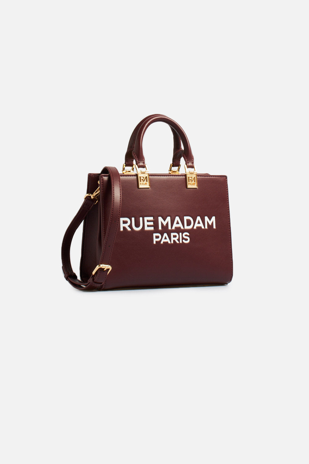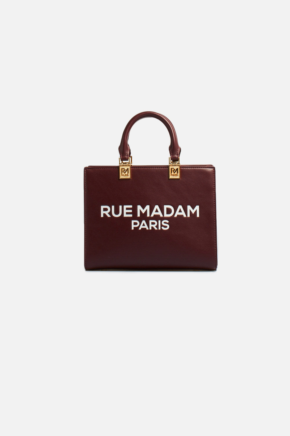 Borsa a mano di Rue Madame Paris struttura semi-rigida, doppi manici corti, chiusura superiore con zip e tracolla regolabile e amovibile con moschettoni in metallo dorato. Il fronte è personalizzato con stampa logo ''RUE MADAM PARIS'' . Gli attacchi metallici dei manici sono rifiniti con placca logata RM dorata.
