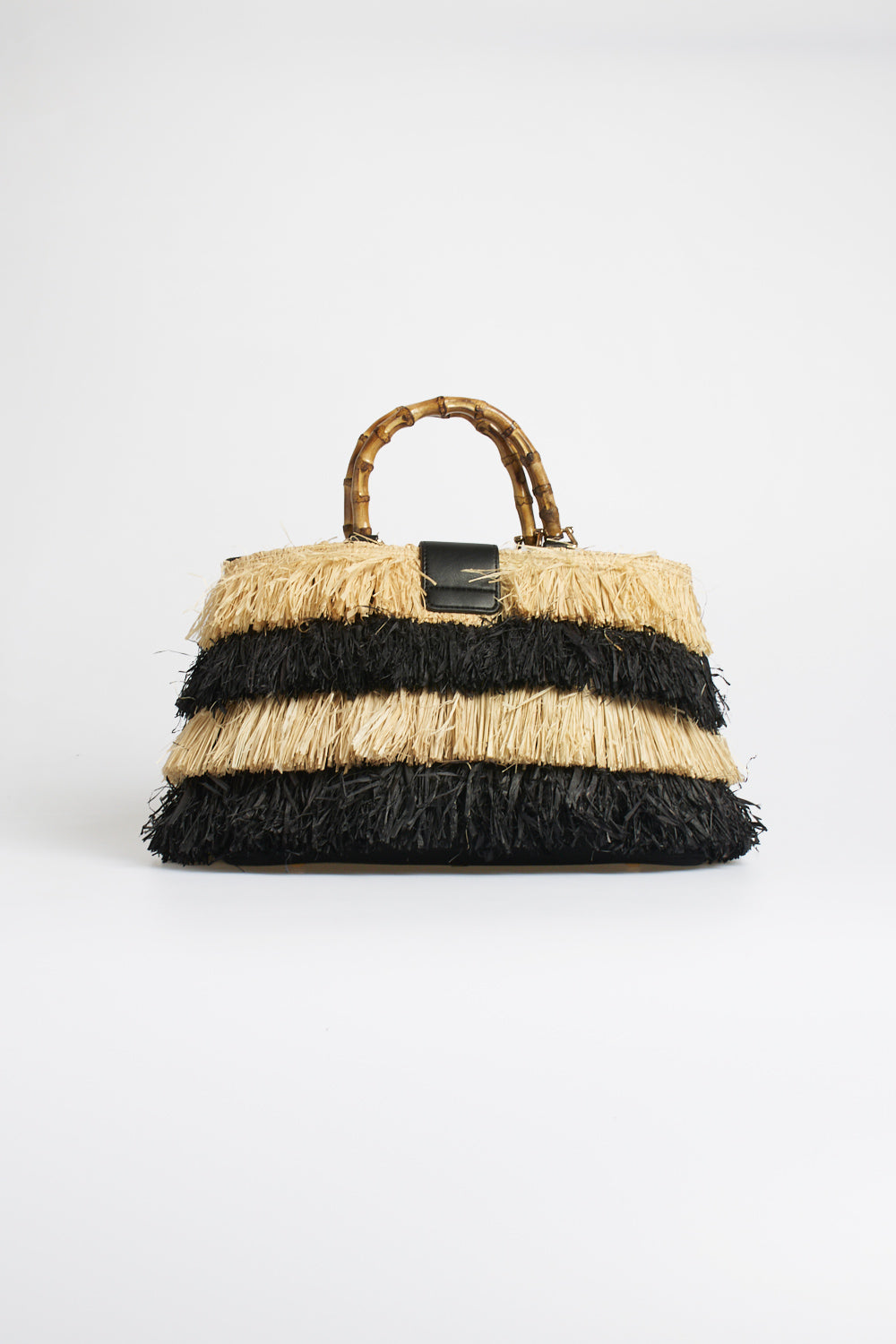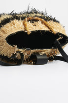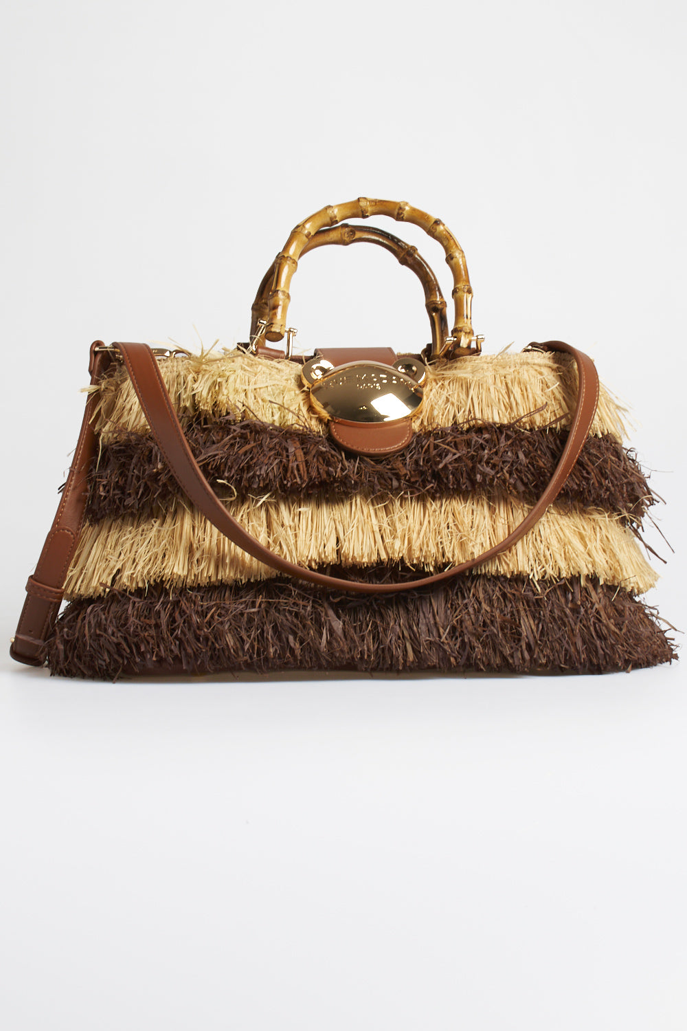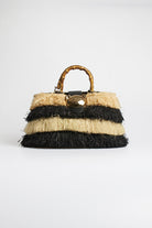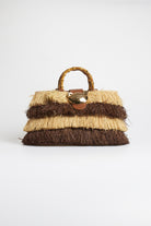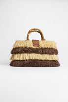 Borsa a mano Rue Madame Paris dal design naturale e ricercato, caratterizzata da una lavorazione effetto rafia con frange bicolore beige e marrone che creano un elegante gioco di contrasti e texture. Il manico rigido effetto bamboo dona un tocco sofisticato e distintivo, mentre la pattina con dettaglio in similpelle marrone completa il modello con raffinatezza. Un accessorio di carattere, perfetto per valorizzare outfit estivi e look casual-chic.