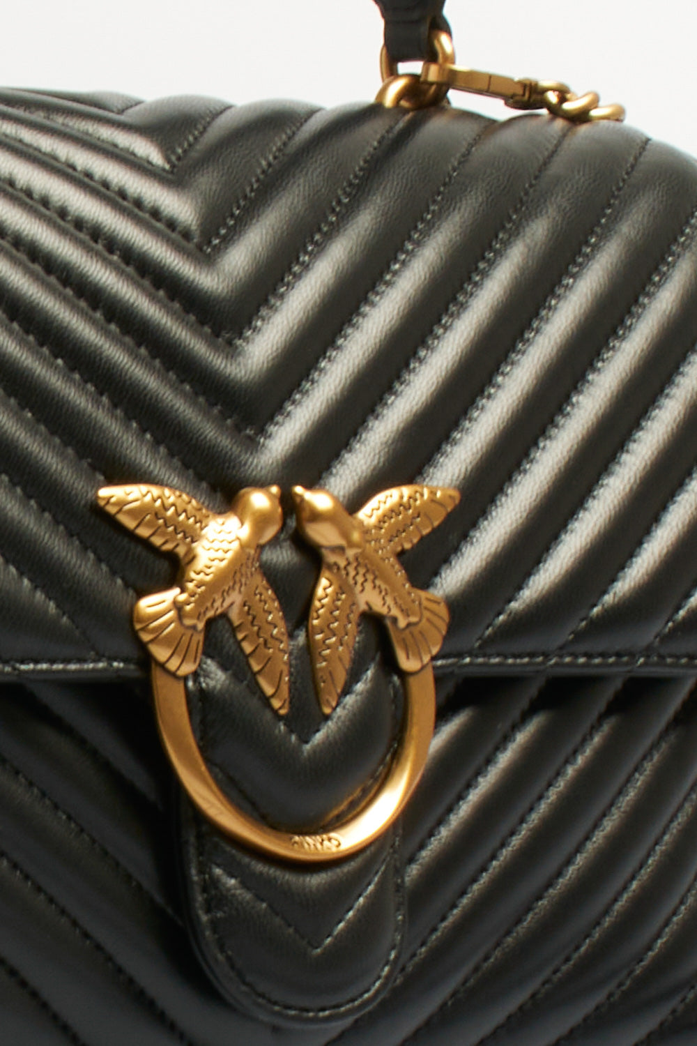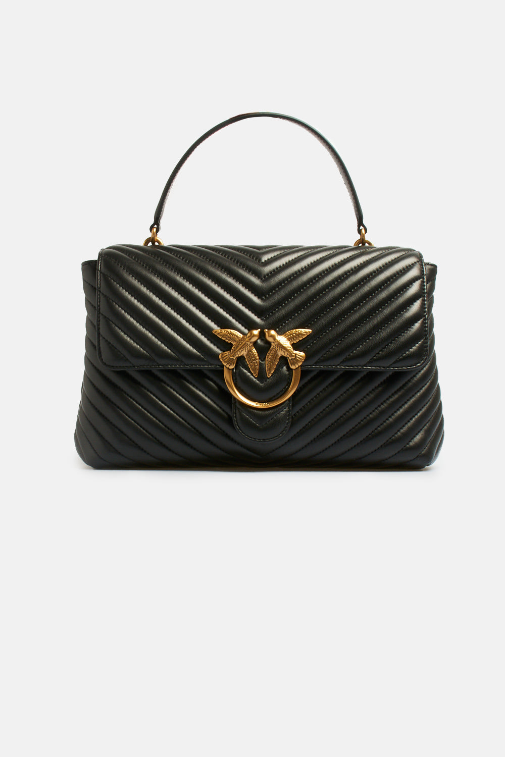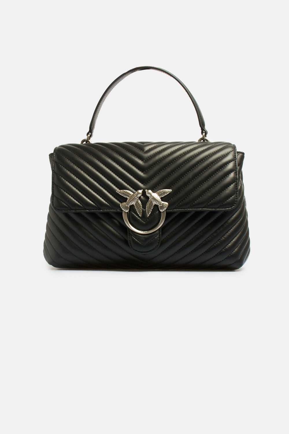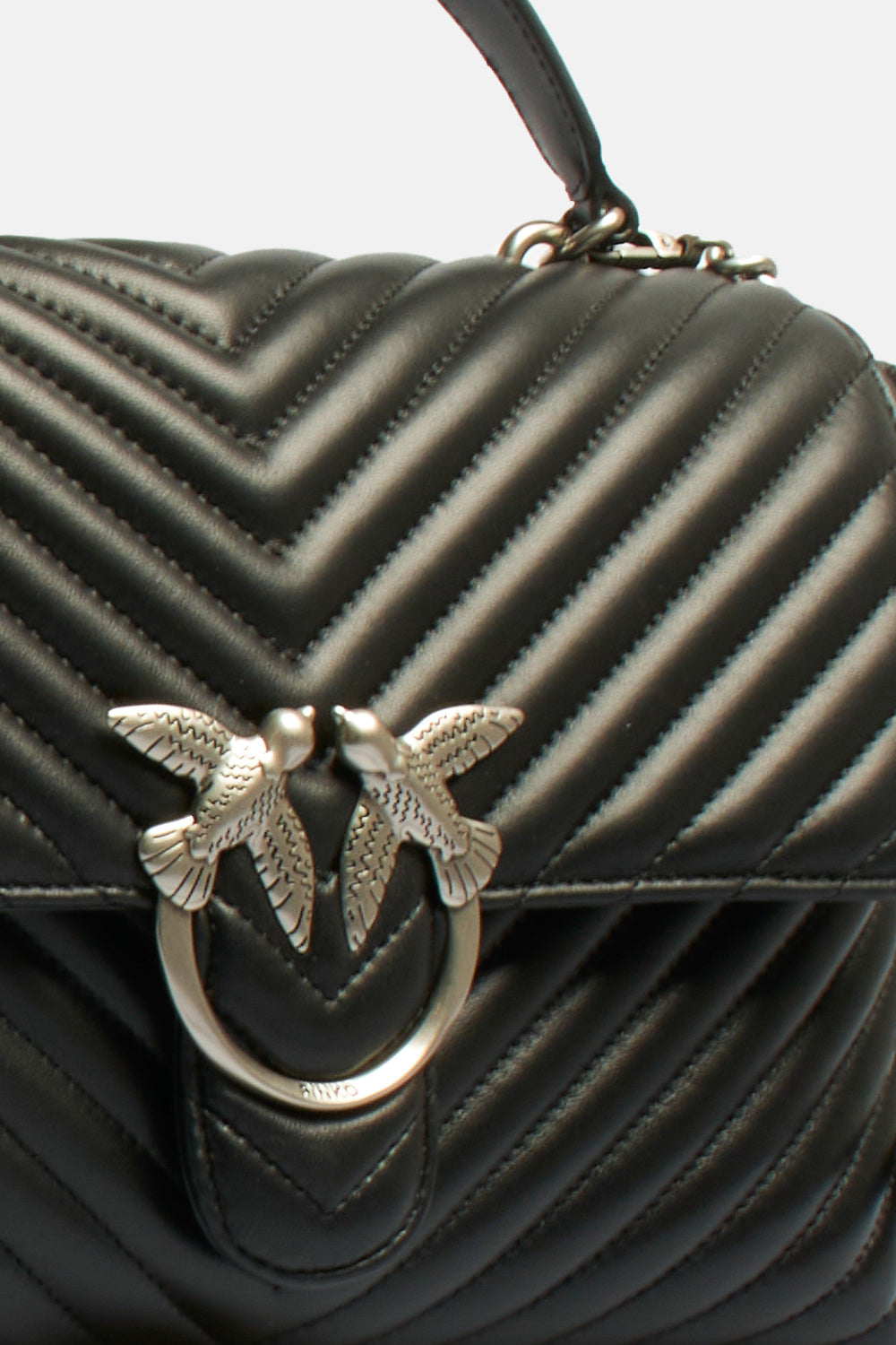 Big Love Bag Puff di Pinko in nappa trapuntata con motivo chevron, chiusura completata dall'iconica fibbia in metallo Love Birds Diamond Cut, interno foderato in microfibra scamosciata e comprende tramezza chiusa con zip e tasca a parete, tracolla removibile