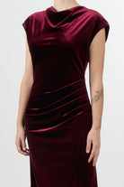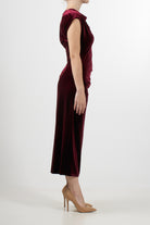 Abito lungo smanicato in velluto di Tensione In, caratterizzato da scollo morbido drappeggiato e pieghe laterali che donano movimento e valorizzano la figura, spacco laterale. La linea fluida e il tessuto elegante lo rendono ideale per cerimonie, eventi serali o occasioni speciali.