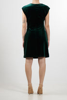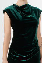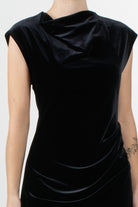 Abito corto di Tensione In senza maniche realizzato in morbido velluto, caratterizzato da scollo morbido drappeggiato e pieghe laterali che valorizzano la silhouette. Il design semplice ma raffinato lo rende perfetto per occasioni eleganti o serate speciali.