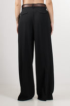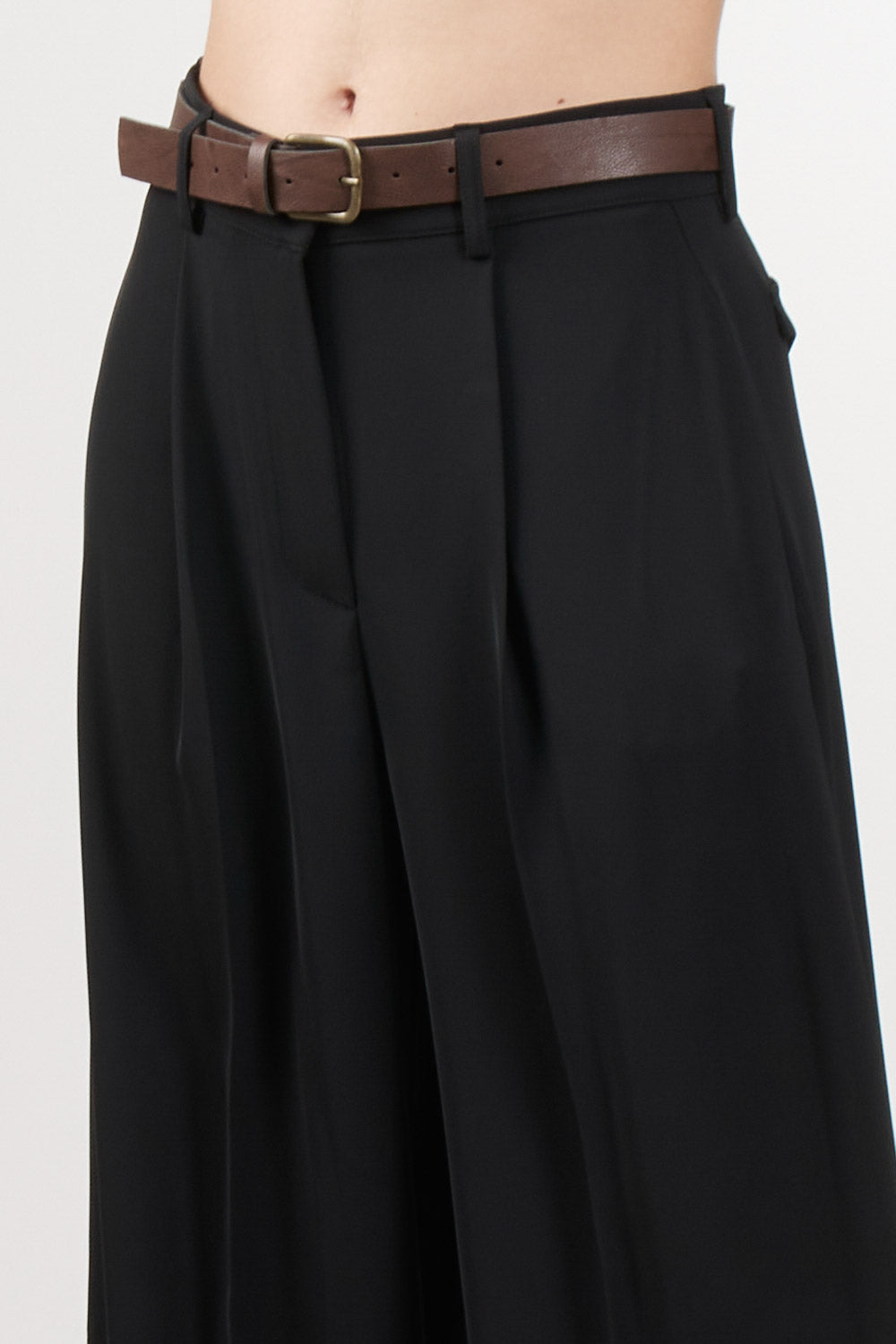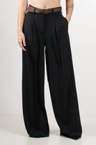 Pantalone linea palazzo di Tensione In, dal fit ampio e scivolato, vita alta con pince frontali, cintura integrata con fibbia in metallo e tasche laterali a filo.