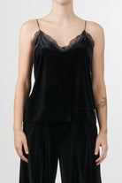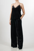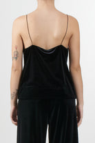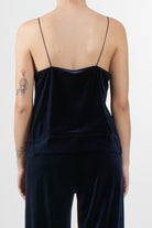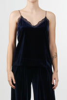 Top in velluto dalla linea morbida, impreziosito da un delicato bordo in pizzo sullo scollo a V, spalline sottile