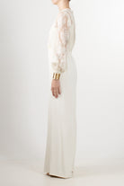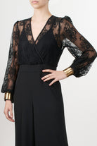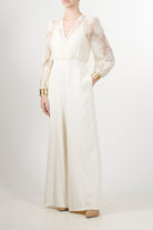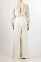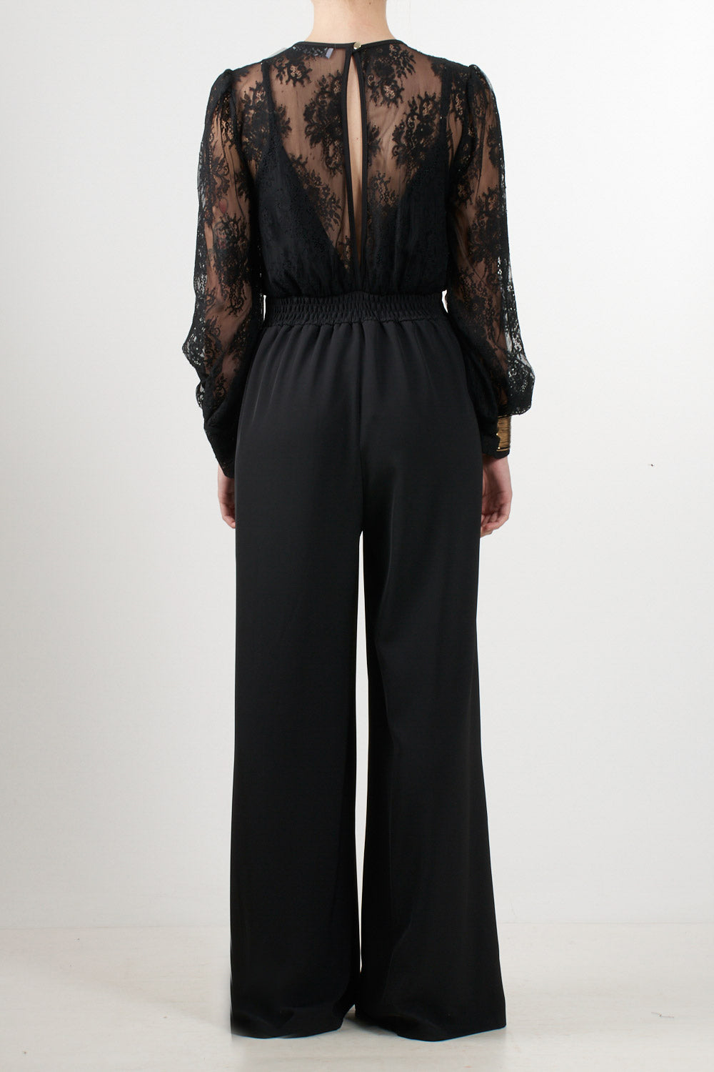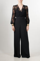 Tuta elegante dalla linea fluida di Motel, caratterizzata da un raffinato corpino in pizzo trasparente con scollo a V incrociato e maniche lunghe leggermente a sbuffo. Il pantalone, ampio e dal taglio palazzo, è realizzato in crêpe fluido che dona movimento e slancio alla figura. Il punto vita è valorizzato da una fascia che segna delicatamente le forme, tasche laterali, bracciali inclusi.