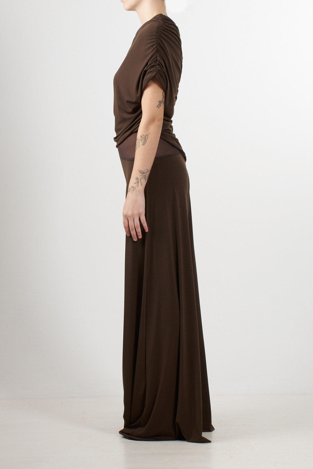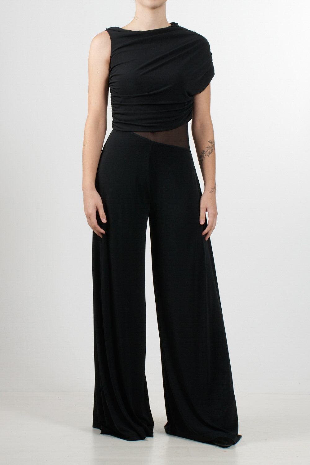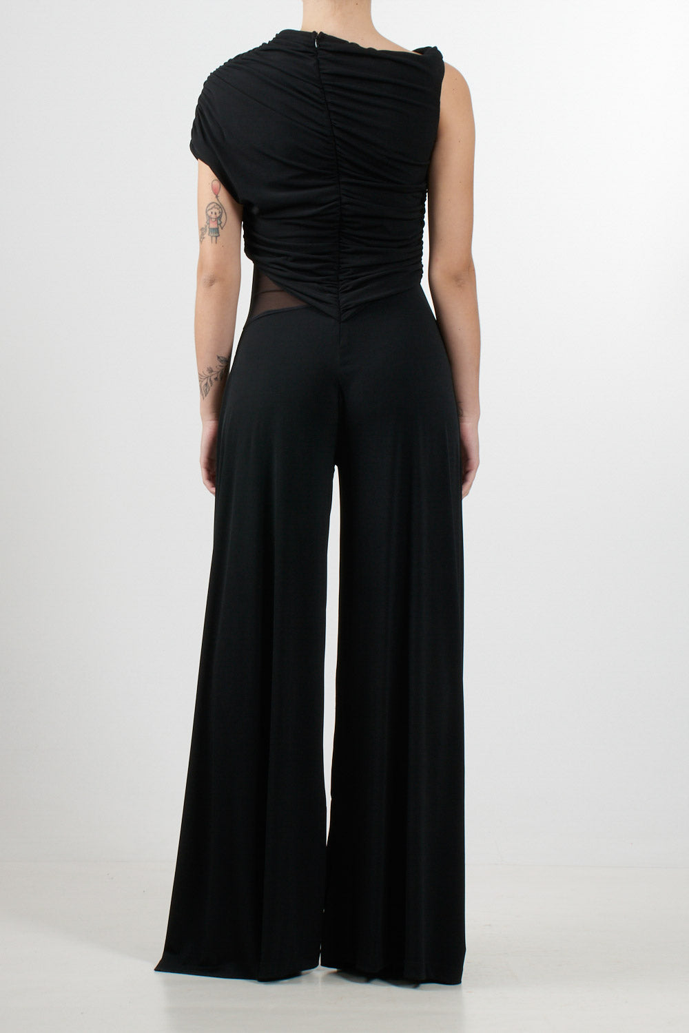 Tuta elegante Jijil  con top drappeggiato monospalla e inserti trasparenti che donano un tocco moderno. Il pantalone palazzo dalla linea fluida slancia la silhouette e rende il capo ideale per occasioni serali e outfit ricercati.