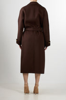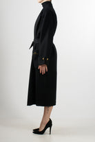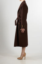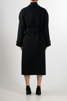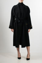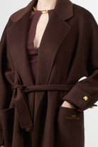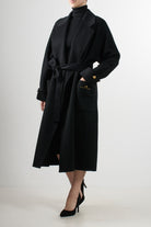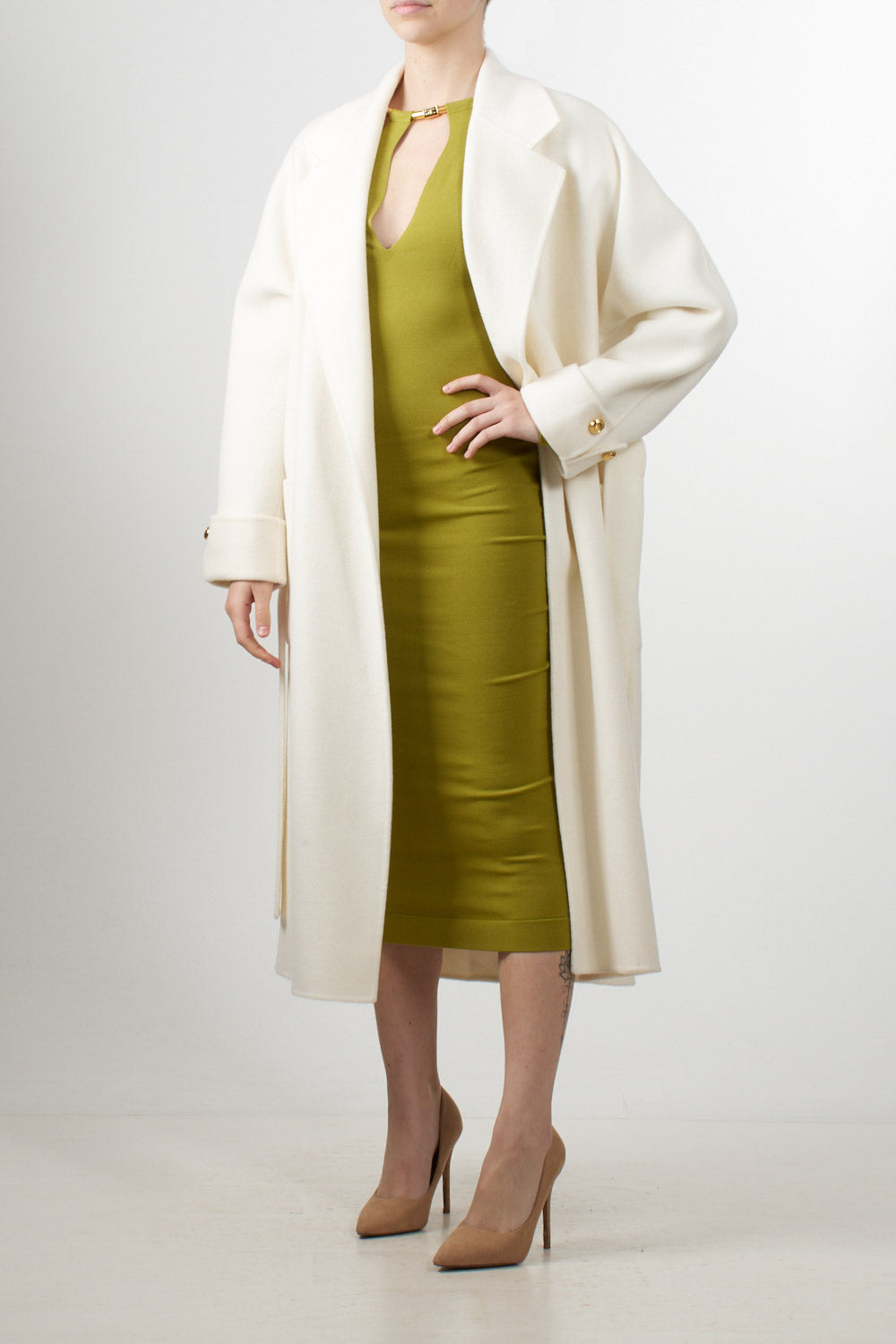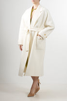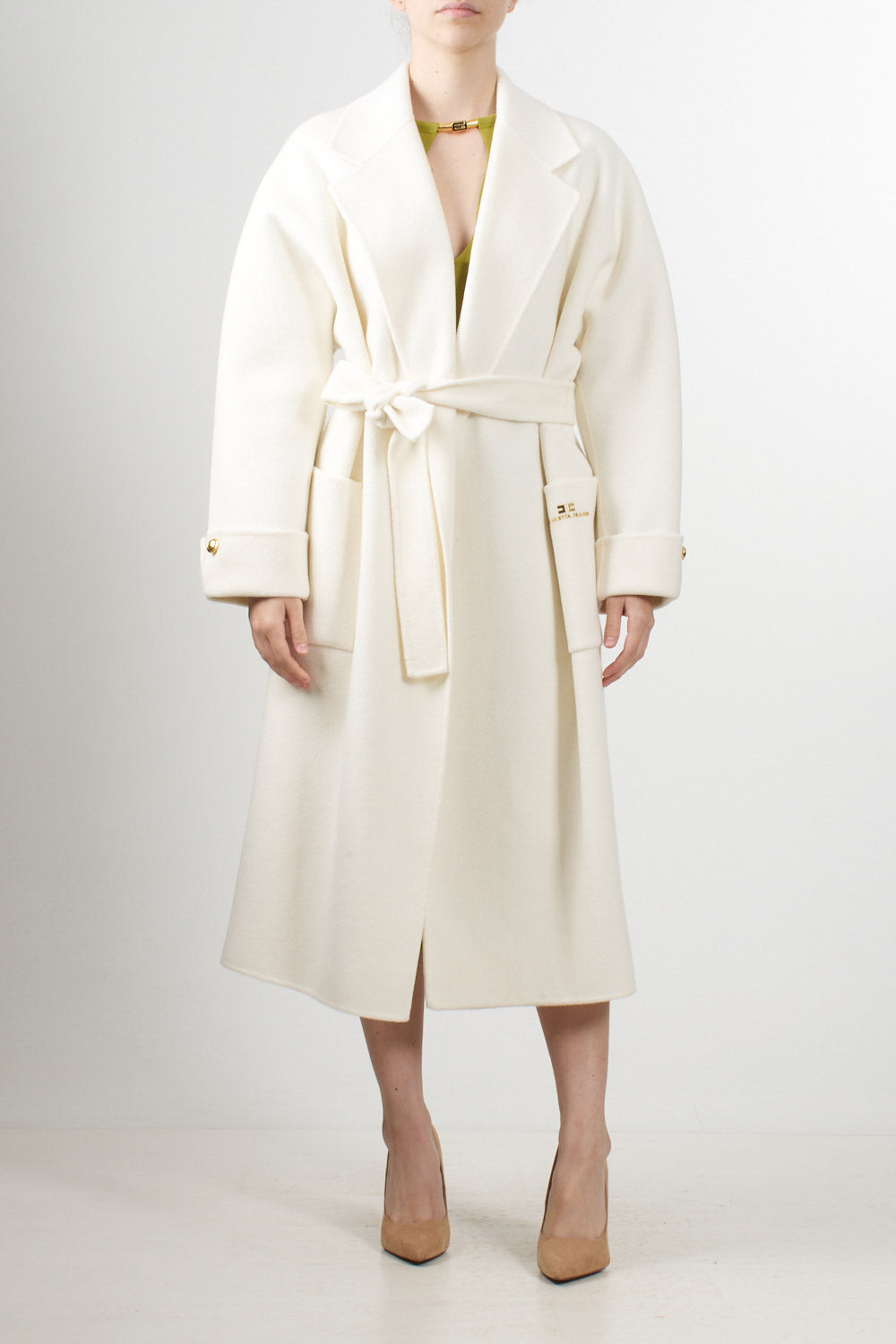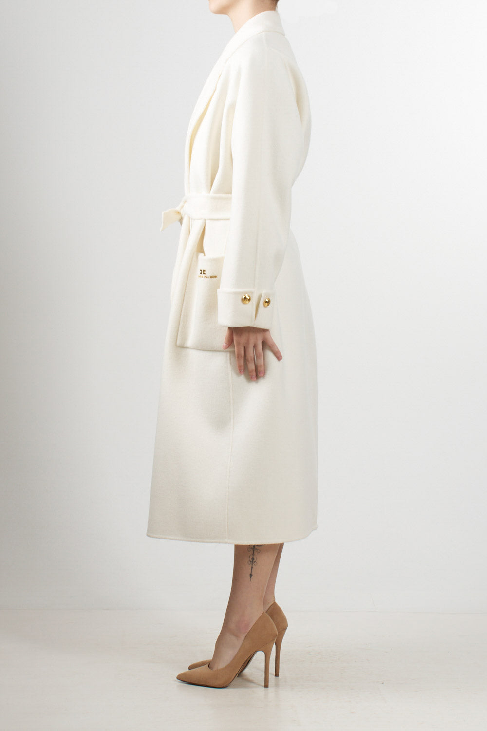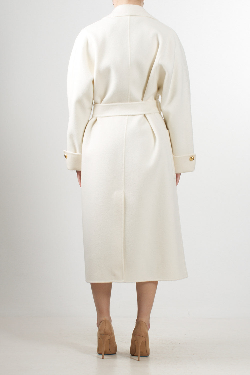 Long, pure wool coat with a wrap-around fit, wide lapels, and a matching belt that accentuates the waist. The style features large patch pockets and gold-tone metal details, a symbol of the brand's sophisticated elegance. Oversized fit.