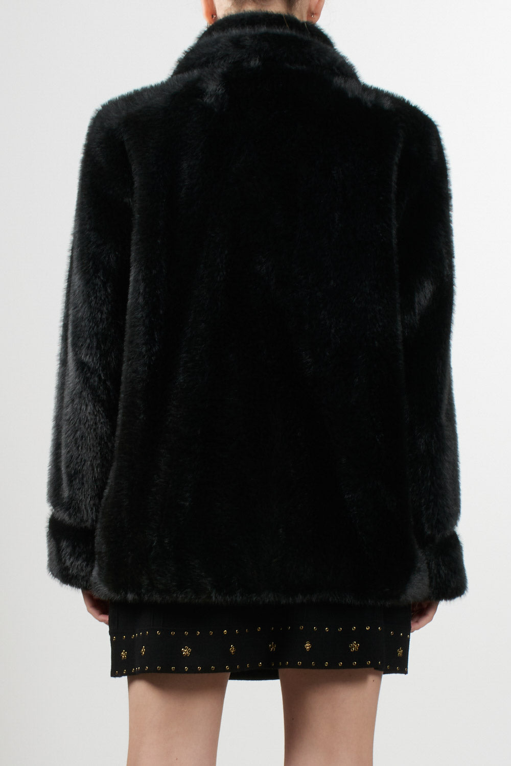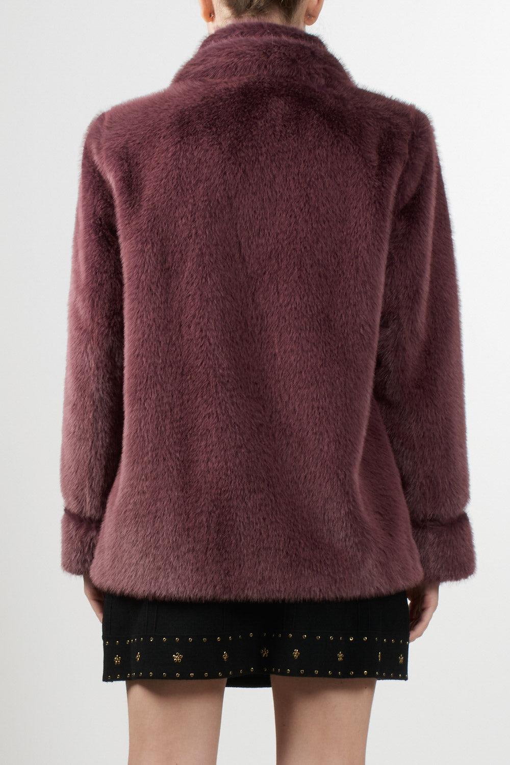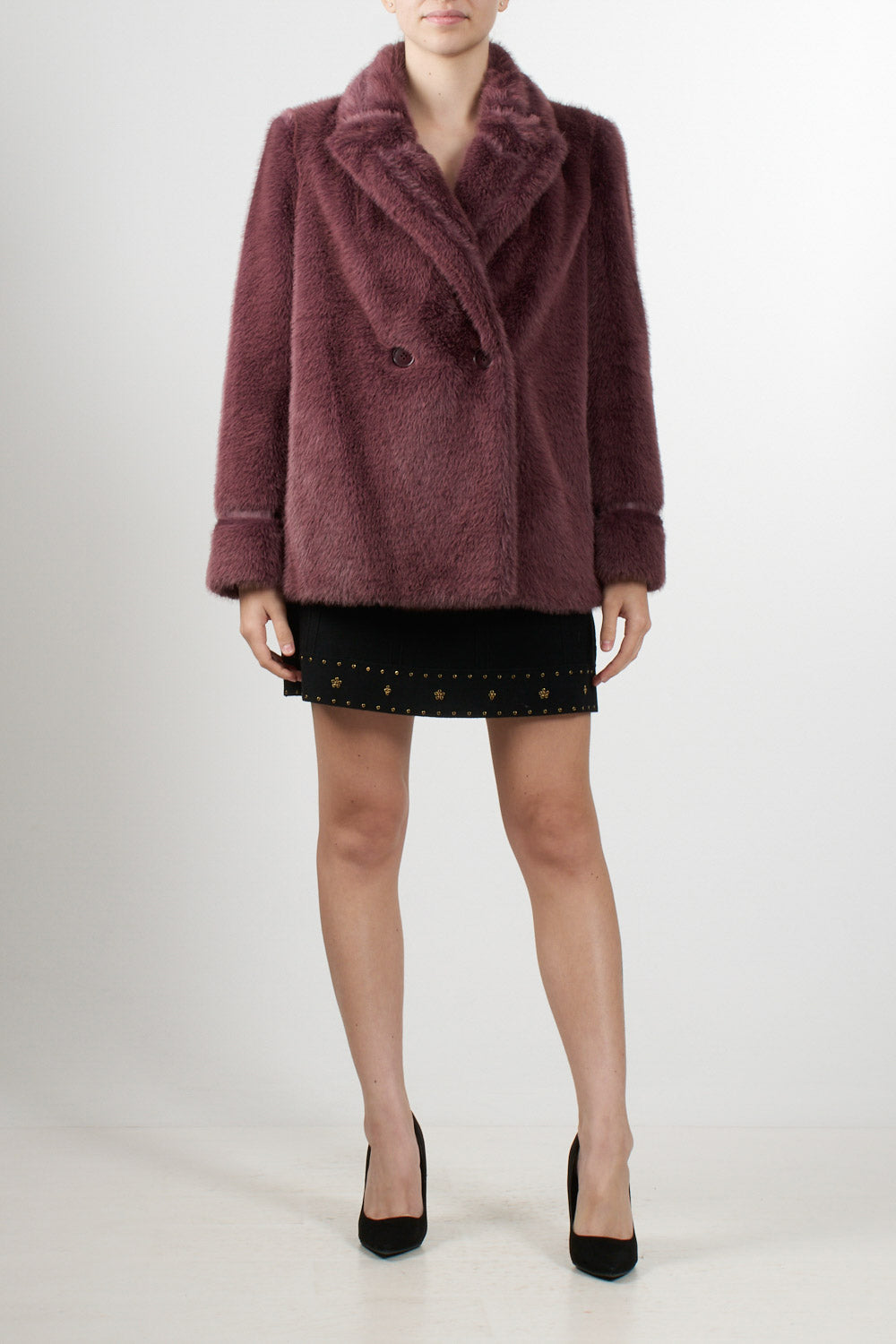 Twinset short coat made of ultra-soft faux fur. The style features a lapel collar, long sleeves, and a double-breasted closure with matching buttons. The design is completed by inset side pockets, a lining for optimal comfort, and an Oval T logo plaque on the back. The straight fit adds a contemporary elegance ideal for the cold season.