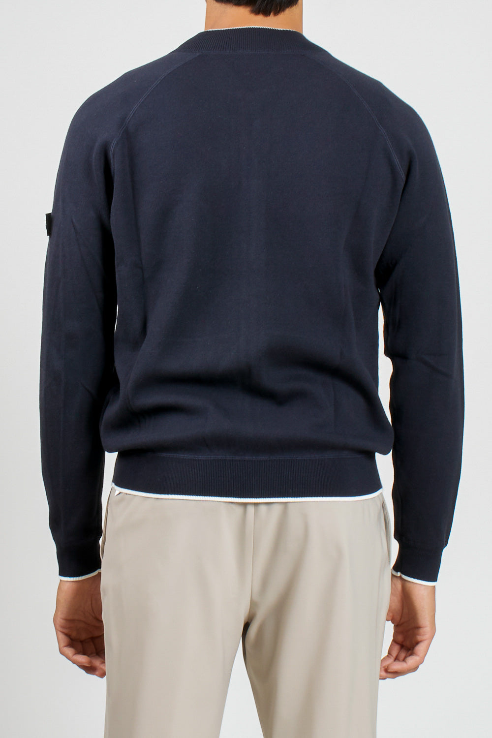 • Details: Bomber-style "V" neckline with ribbed knit profile, central closure with two-way zip for a customizable fit.