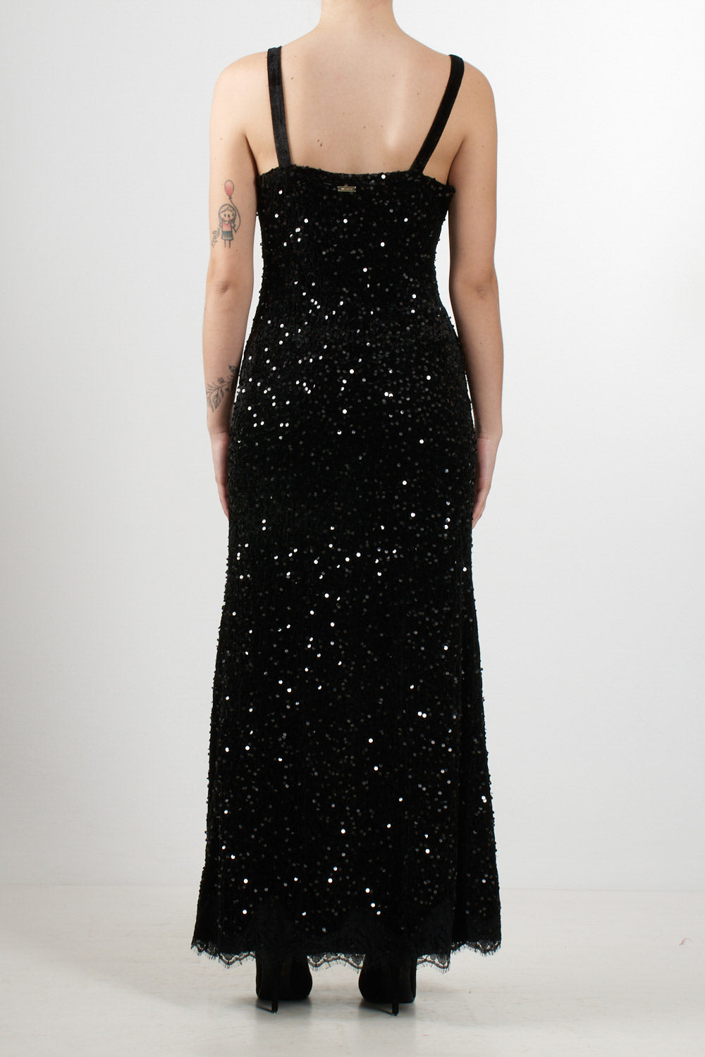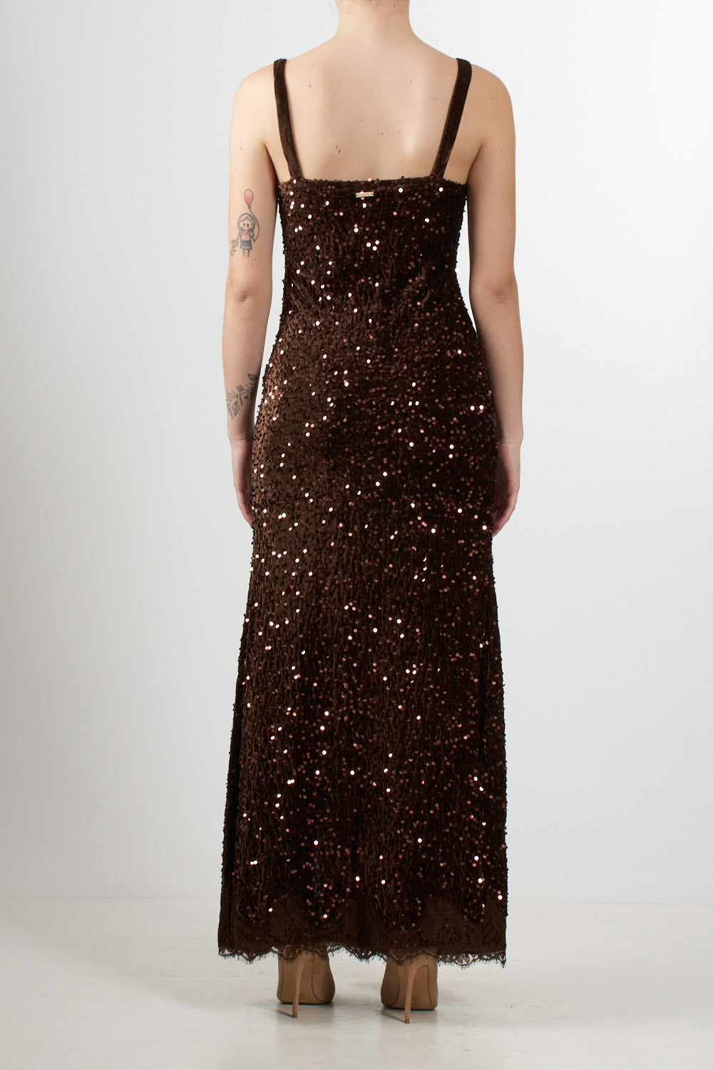 Elegant long dress by No Secrets , crafted from velvet with all-over sequin appliqués that add sparkle and sophistication to the look. The design features a V-neck with lace inserts and thin shoulder straps, as well as a side slit with lace trim that adds sensuality and movement. Ideal for ceremonies, evenings, or special events.