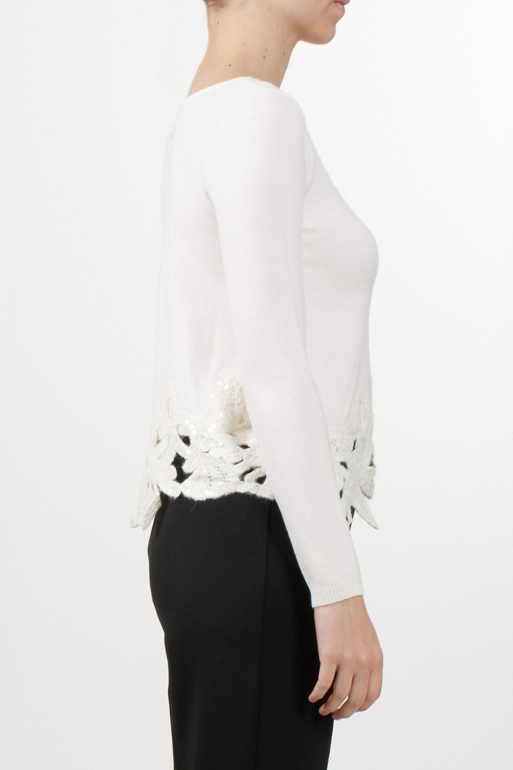 Elegant and refined No Secrets designer sweater, made of fine knit with a soft fit, it features a delicate round neckline and a refined floral lace insert with Sequins at the bottom add sparkle and movement to the outfit. A versatile and chic style, ideal for pairing with elegant trousers or midi skirts for a sophisticated and contemporary look.