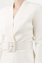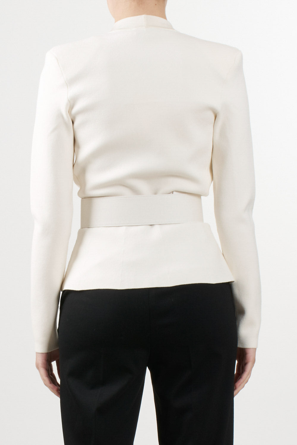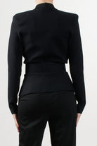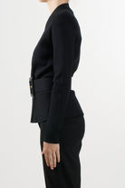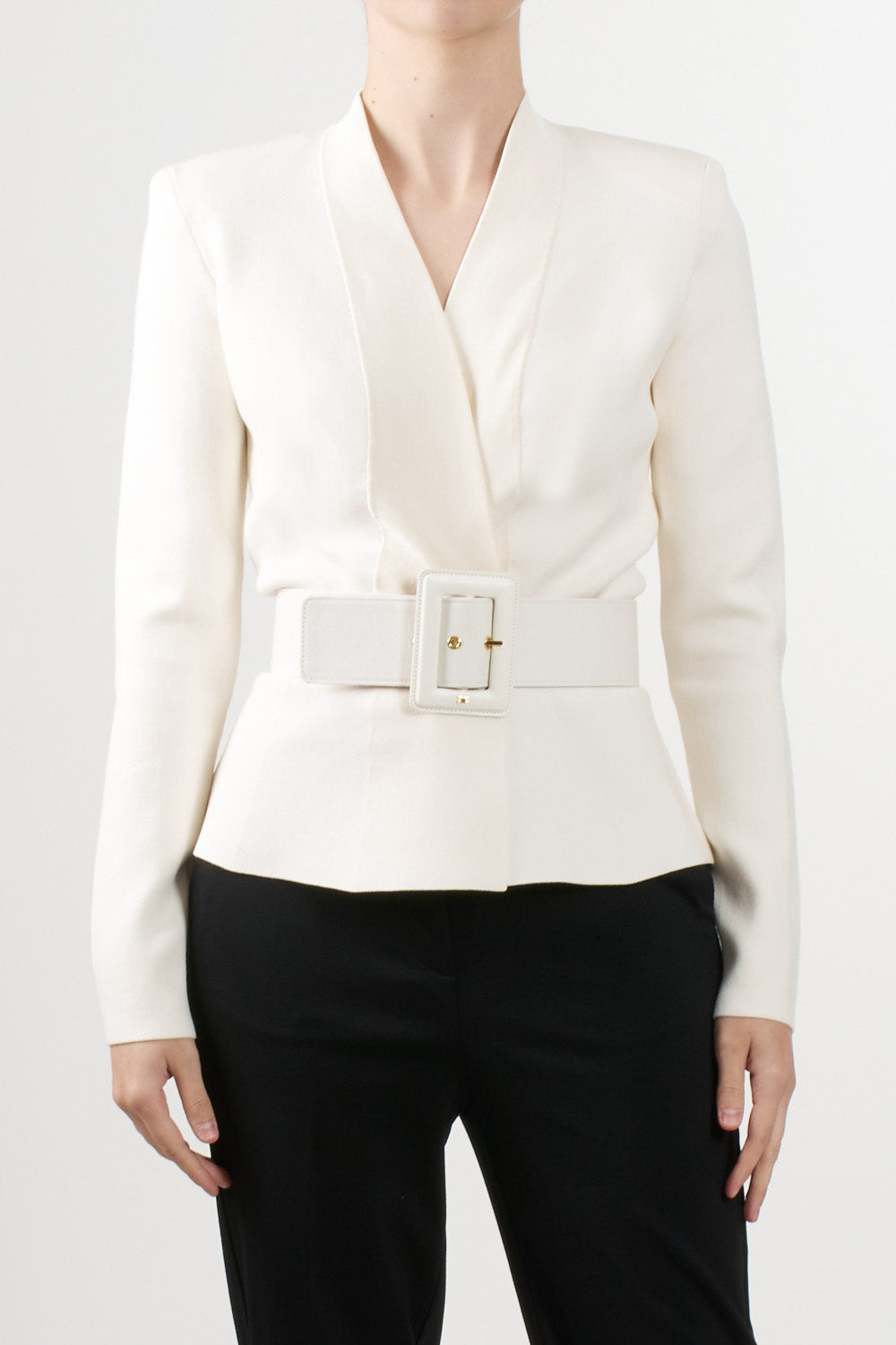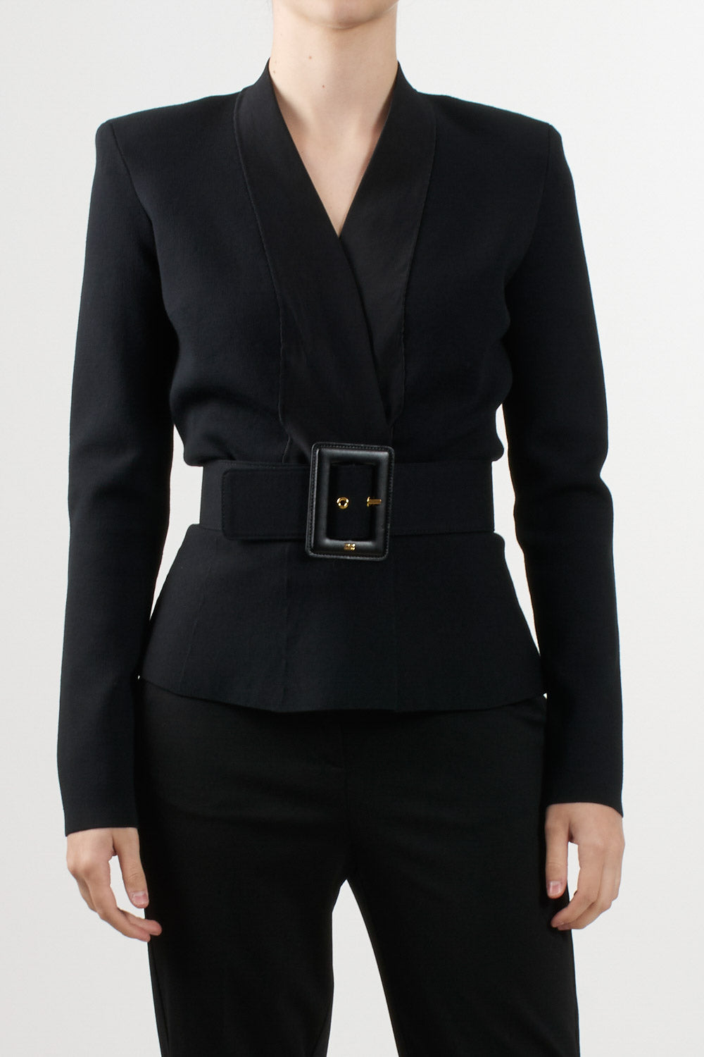 Knitted jacket by Elisabetta Franchi, made with a fabric stitch, featuring structured shoulders and lapels in shiny viscose, a matching belt with a micrologo buckle highlights the basque at the bottom