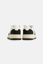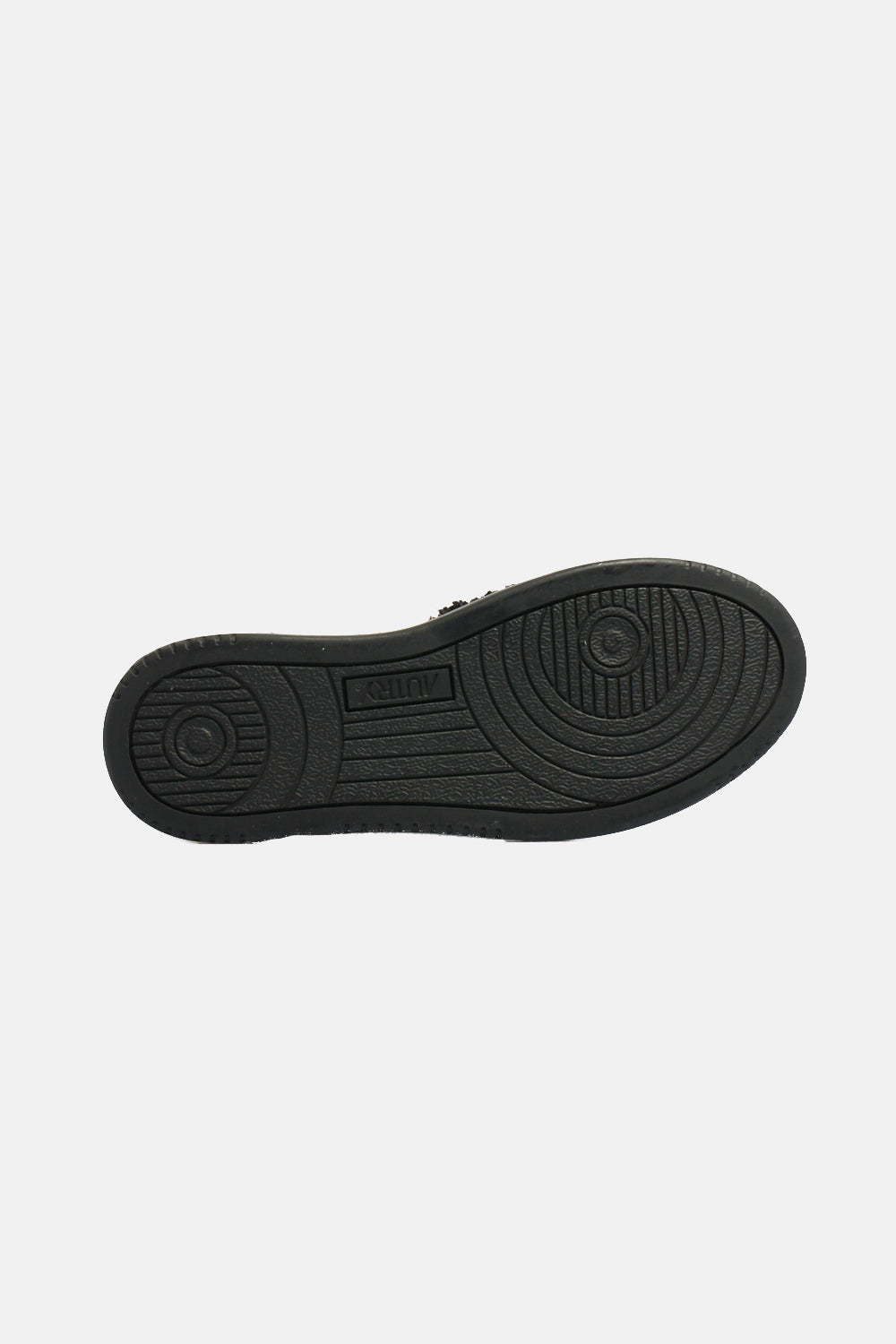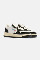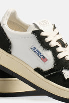 Autry Medalist sneakers with white leather upper with stitching that defines the multi-layered canvas inserts, perforated toe to promote breathability, flat cotton laces, heel tab with embossed logo, leather and cotton sponge lining, two-tone rubber sole with logo, Autry logo with American flag on the side.