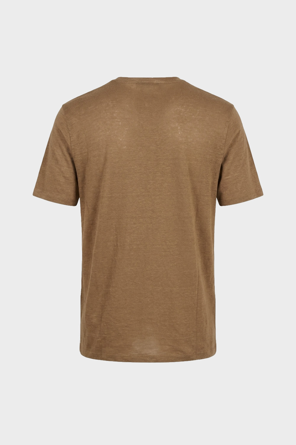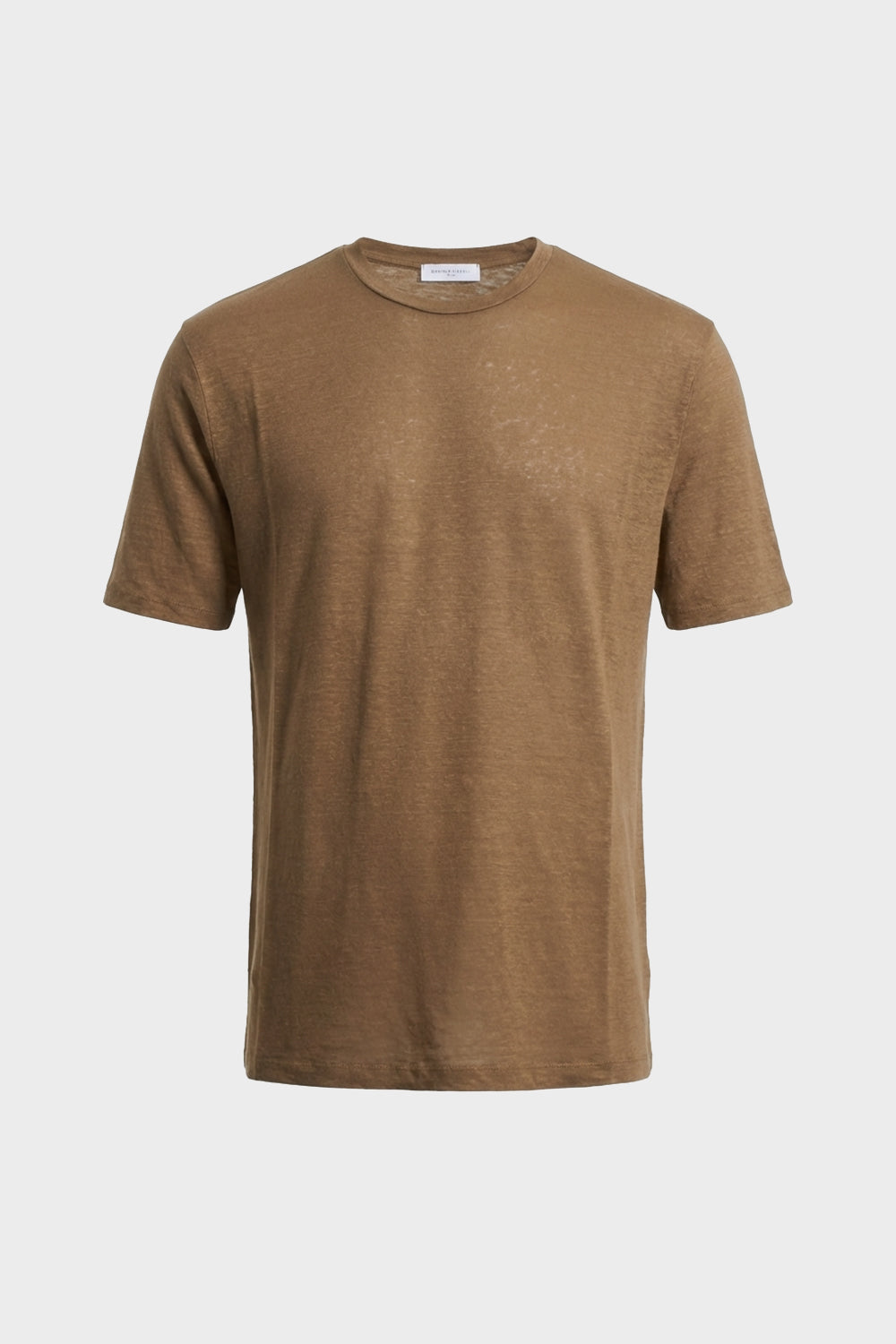 Essential Daniele Fiesoli t-shirt, featuring a clean line and a lightweight, breathable fabric. Made from a blend of linen and elastane, it offers the natural comfort and slightly irregular texture typical of the noble fiber, with the addition of a touch of stretch that significantly improves its fit and wrinkle resistance. The crew neck design and warm hue make it a versatile staple, perfect to wear alone or as a base layer under a casual jacket for a refined and relaxed look.